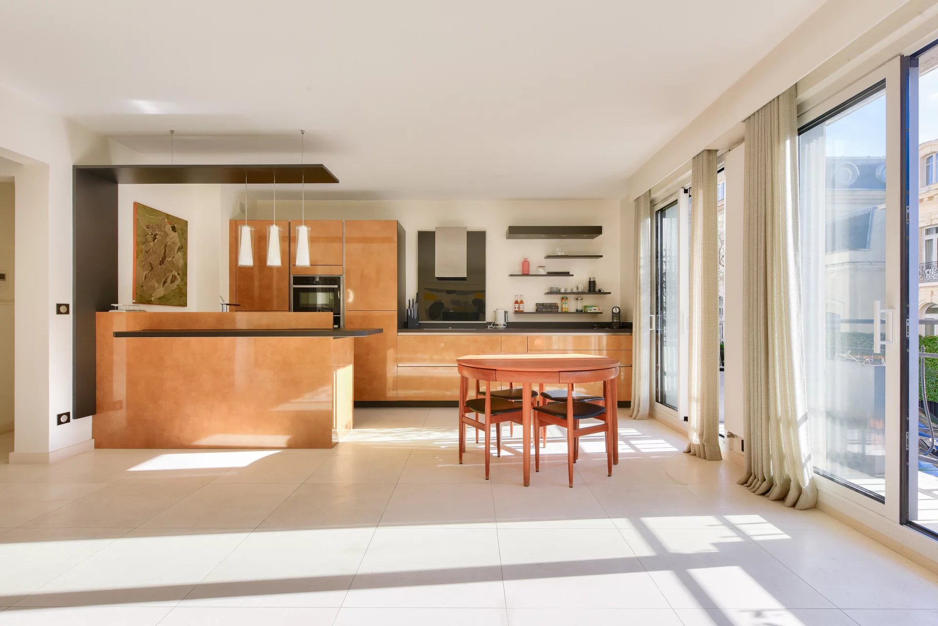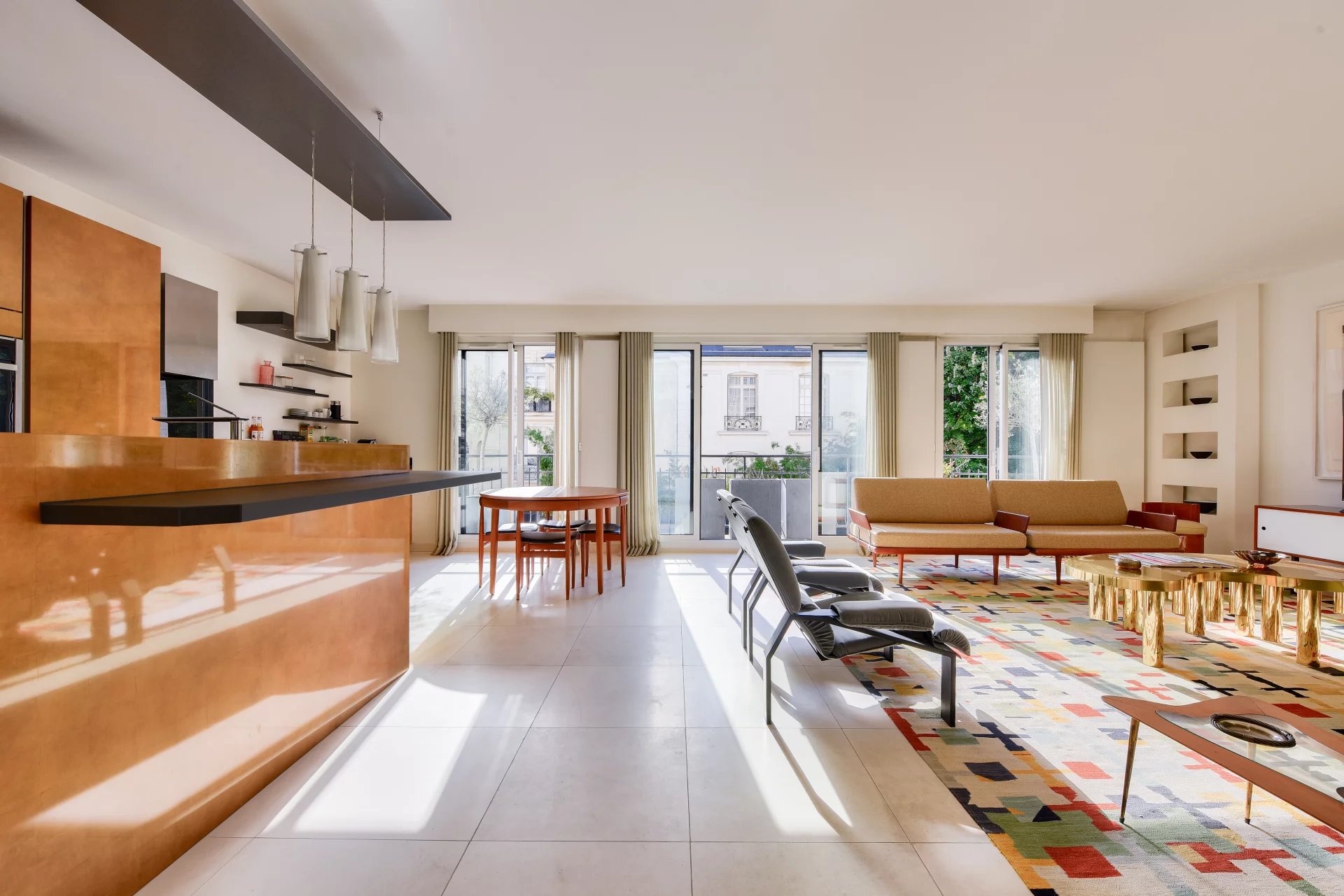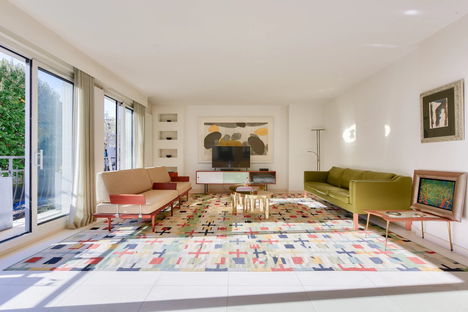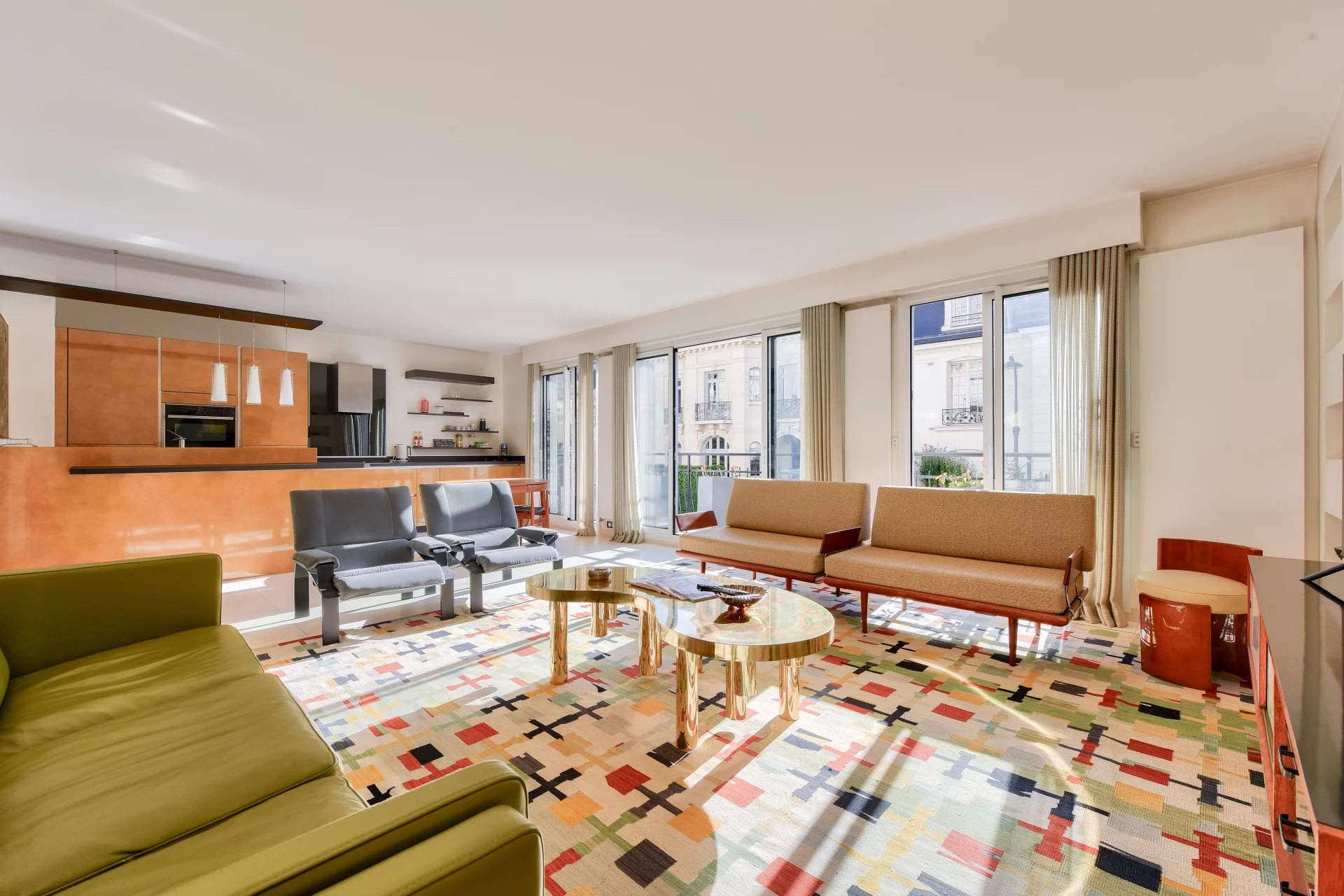 - A sun-filled living room with a fully fitted and equipped open kitchen, all opening onto a west-facing balcony with delightful views,
