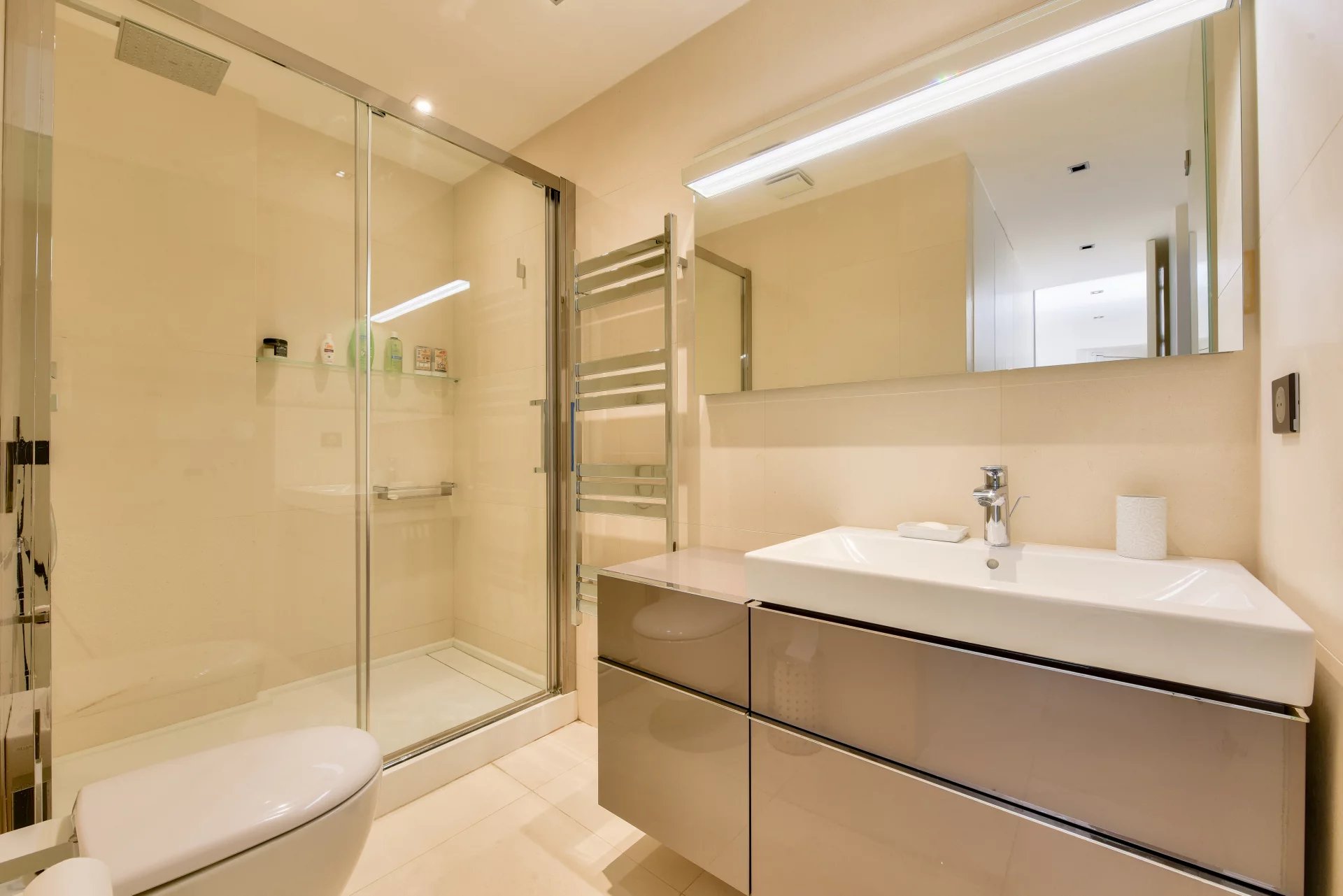 - Two well-appointed bedrooms with built-in storage, each with its own en-suite bathroom and WC,