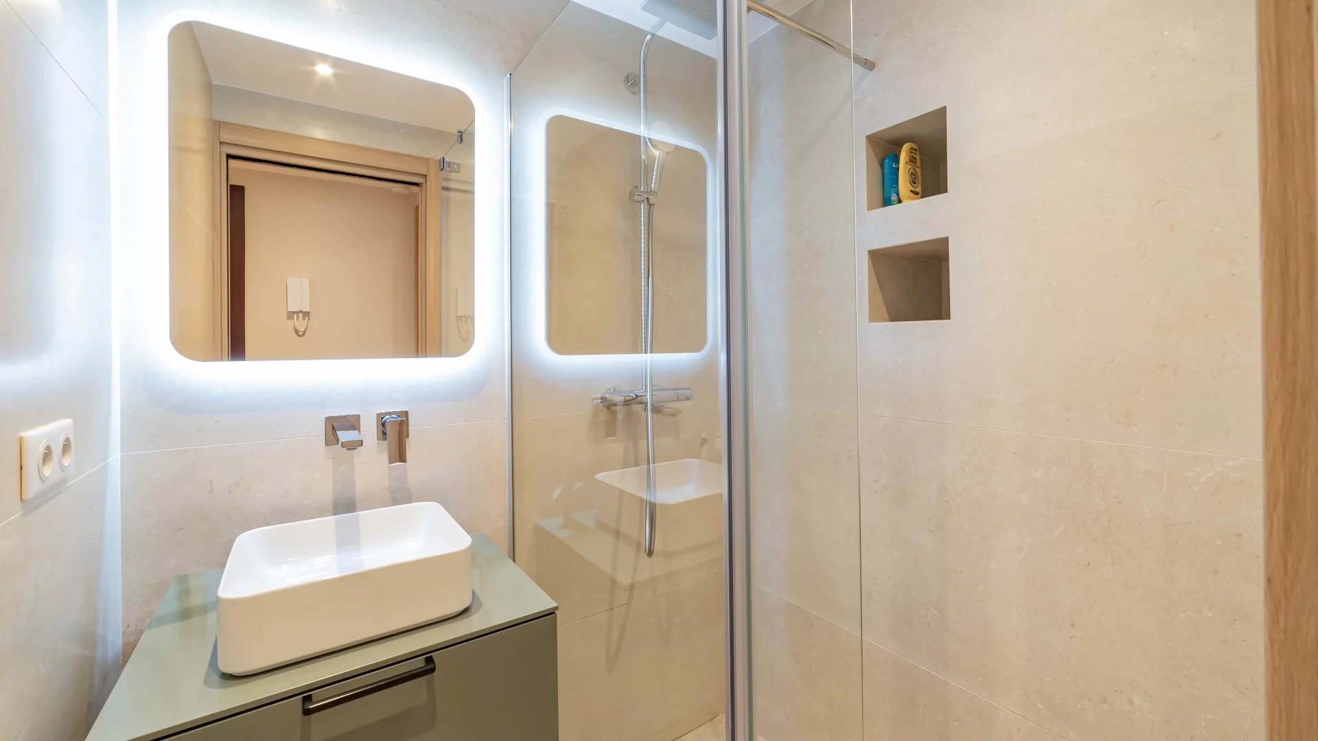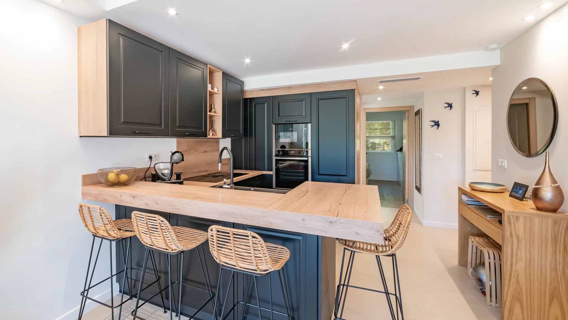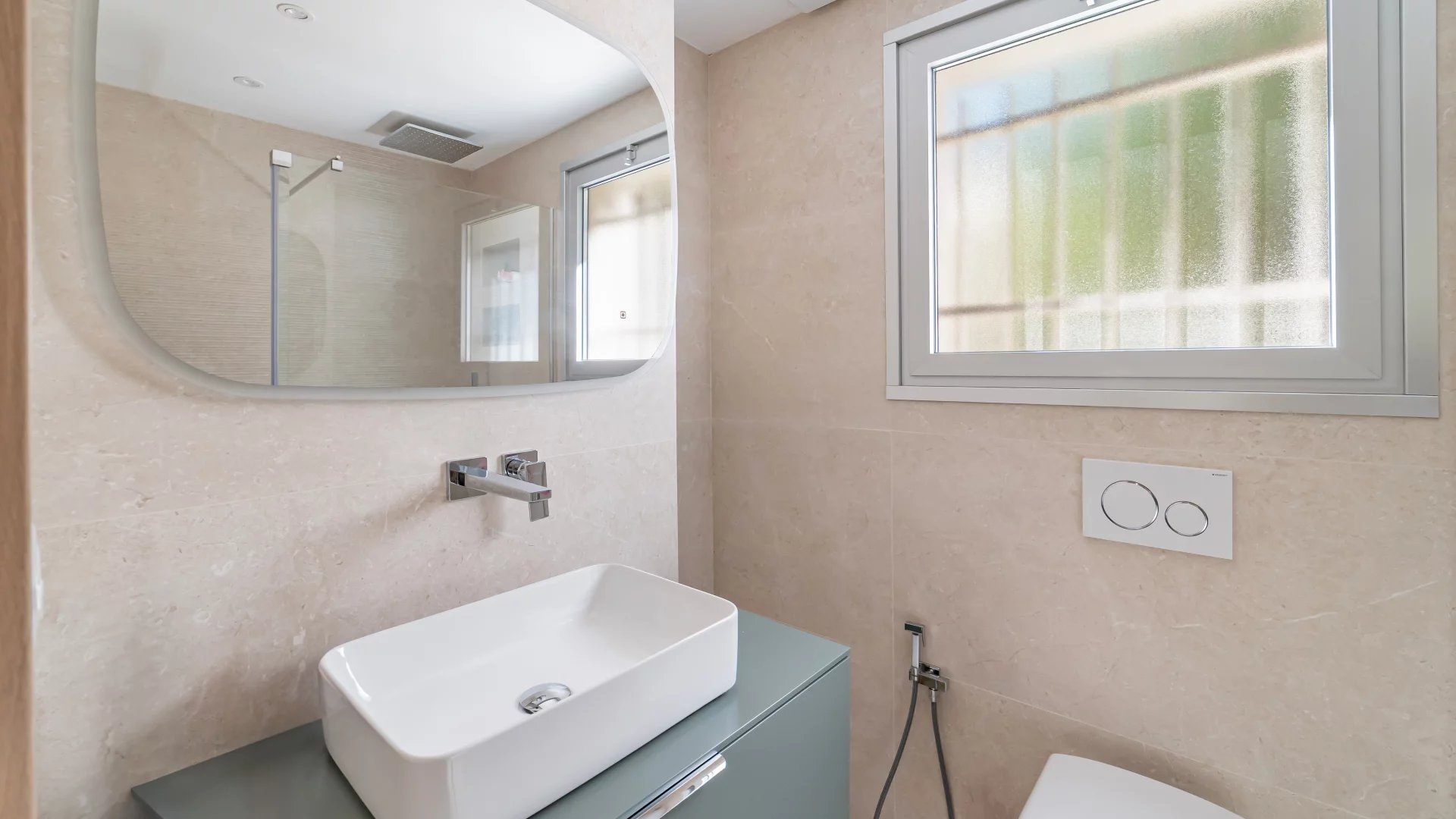 With a surface area of 53 sq.m, the property stands out for its spacious corner terrace and South and West-facing living room, enjoying open views of the sea and the residence’s landscaped park.