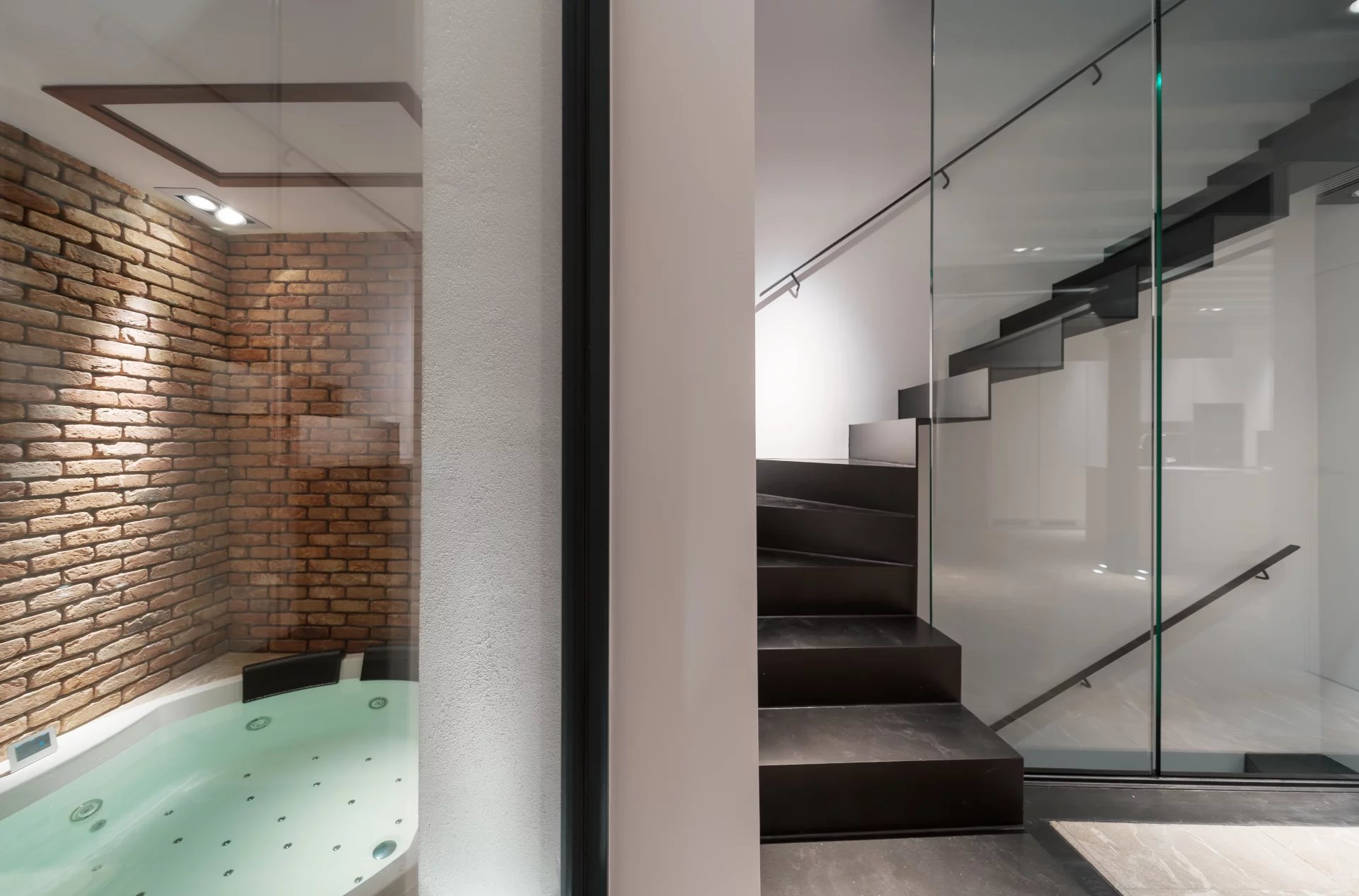 On the ground floor, the heart of the home unfolds in an open-plan living and dining area, anchored by a state-of-the-art designer kitchen with bar counter – a perfect setting for entertaining in style. A dramatic glass wall framed in black iron opens onto a private patio with a whirlpool tub, where indoor meets outdoor seamlessly.