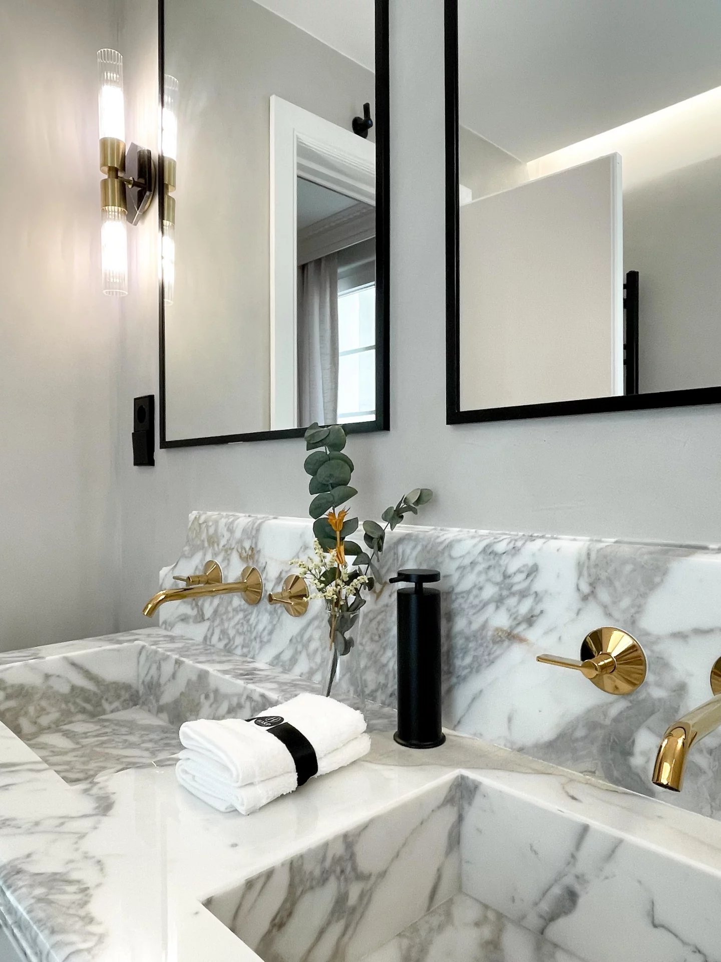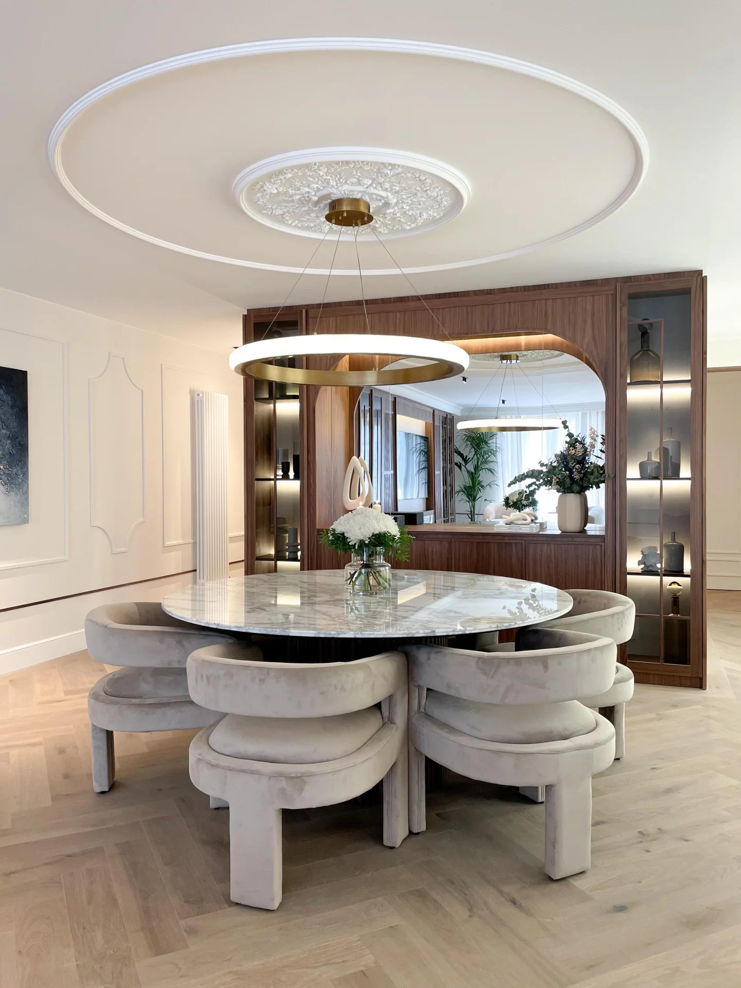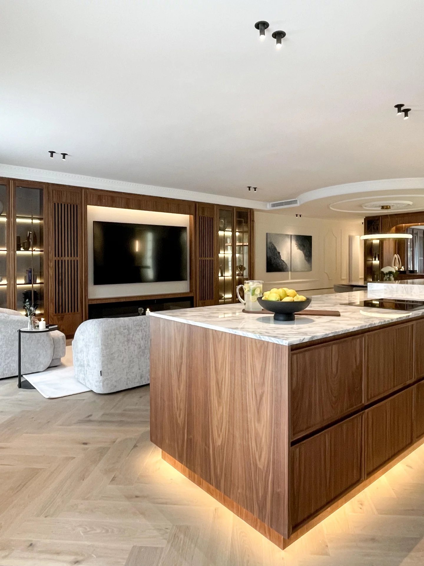 We access the property through a large reception area. On the left hand side we have the social area with large living room, dining room and open kitchen, fully equipped, with large central island and separate laundry. In this area we also find a guest toilet.