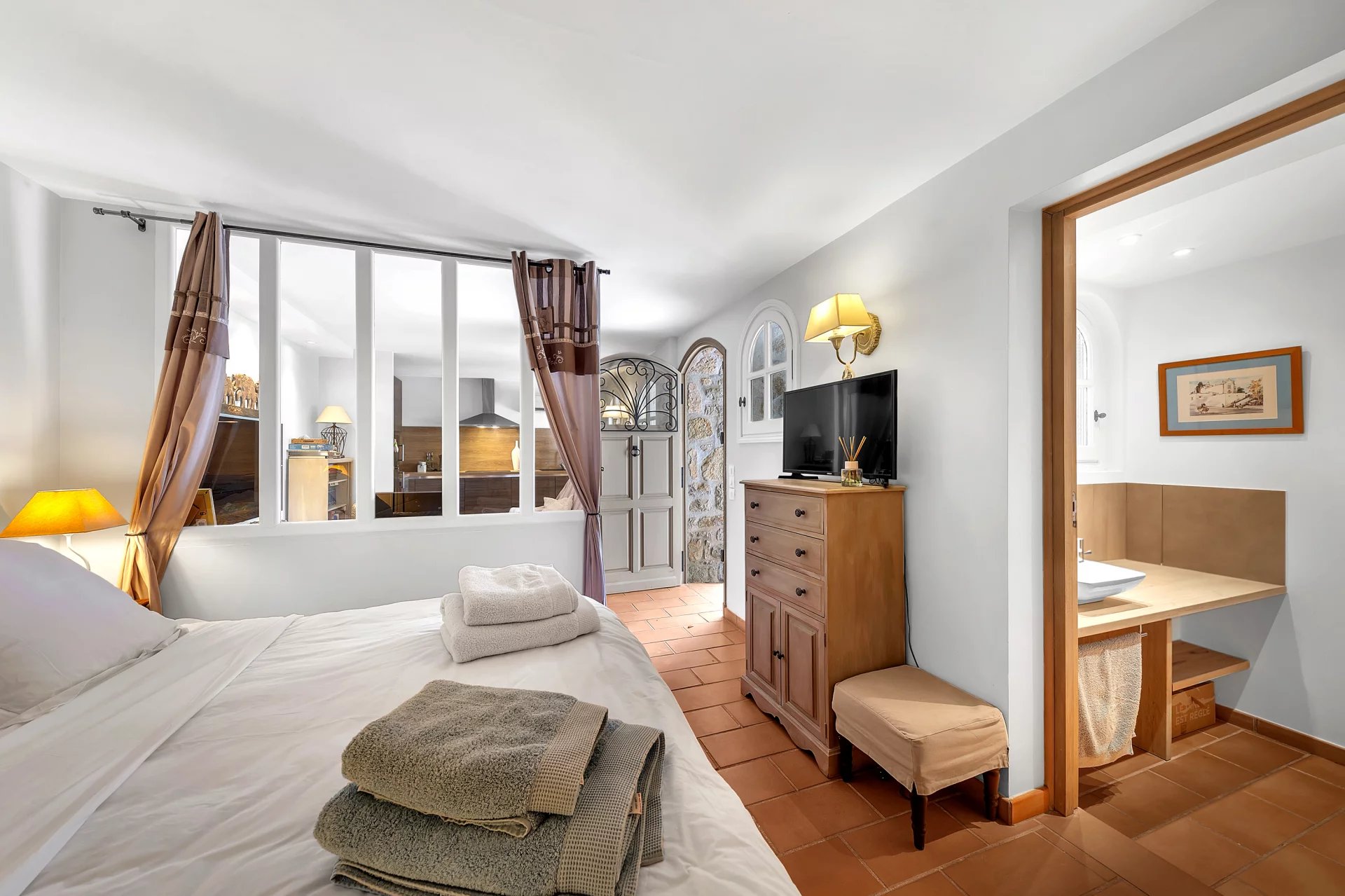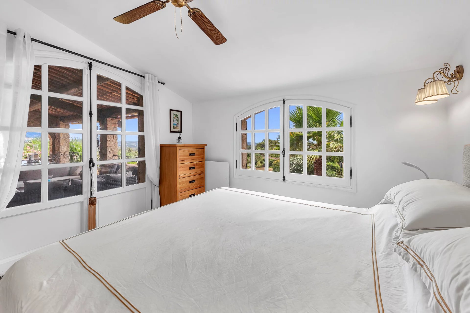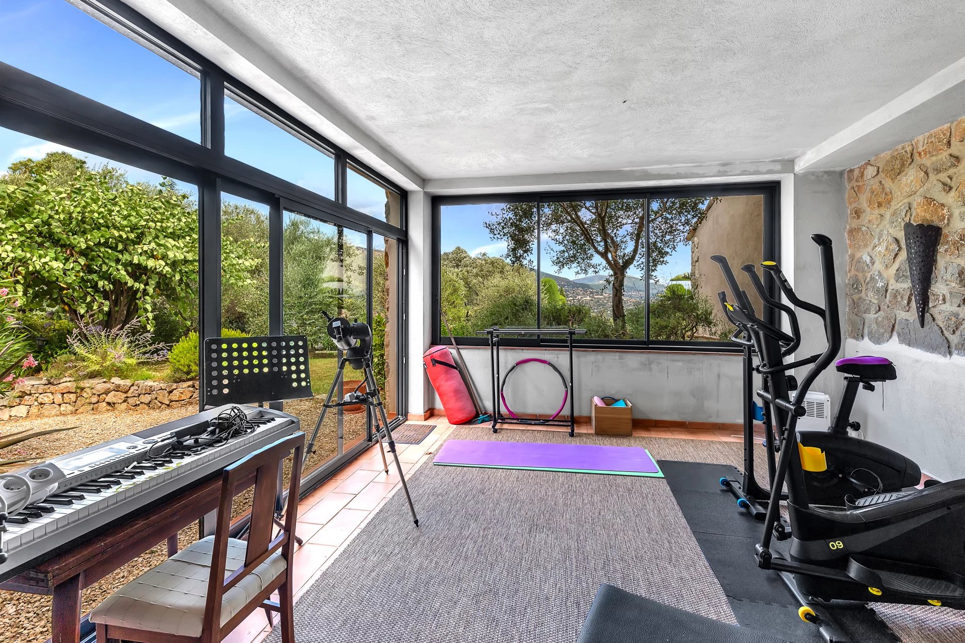It is complemented by 9 kW solar panels and air conditioning, a pool house with a conversation pit and a fully equipped kitchen, covered terraces for each bedroom, a gym, a heated swimming pool, and flat grounds adorned with a variety of Mediterranean plants. The property is easy to access, fully fenced and not overlooked and offers several parking areas as well as a stone shed, a wooden shed, and a garage area to complete the storage spaces.