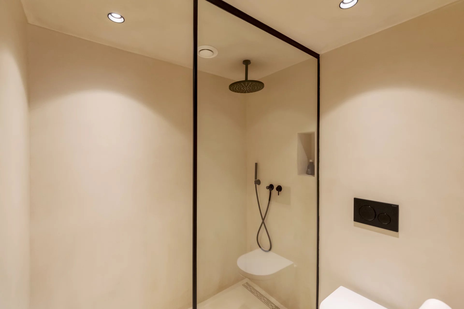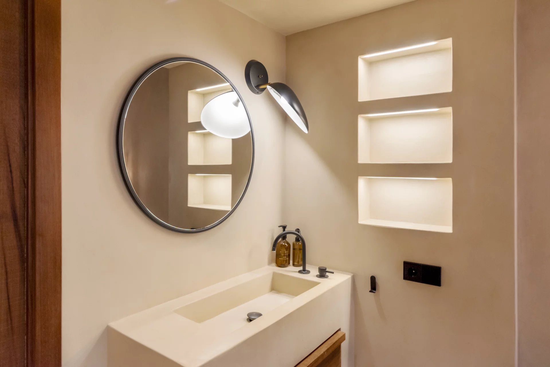 The interior design is contemporary and sophisticated, featuring microcement floors, underfloor heating, and floor-to-ceiling windows that flood the space with natural light.