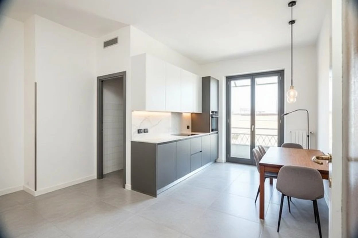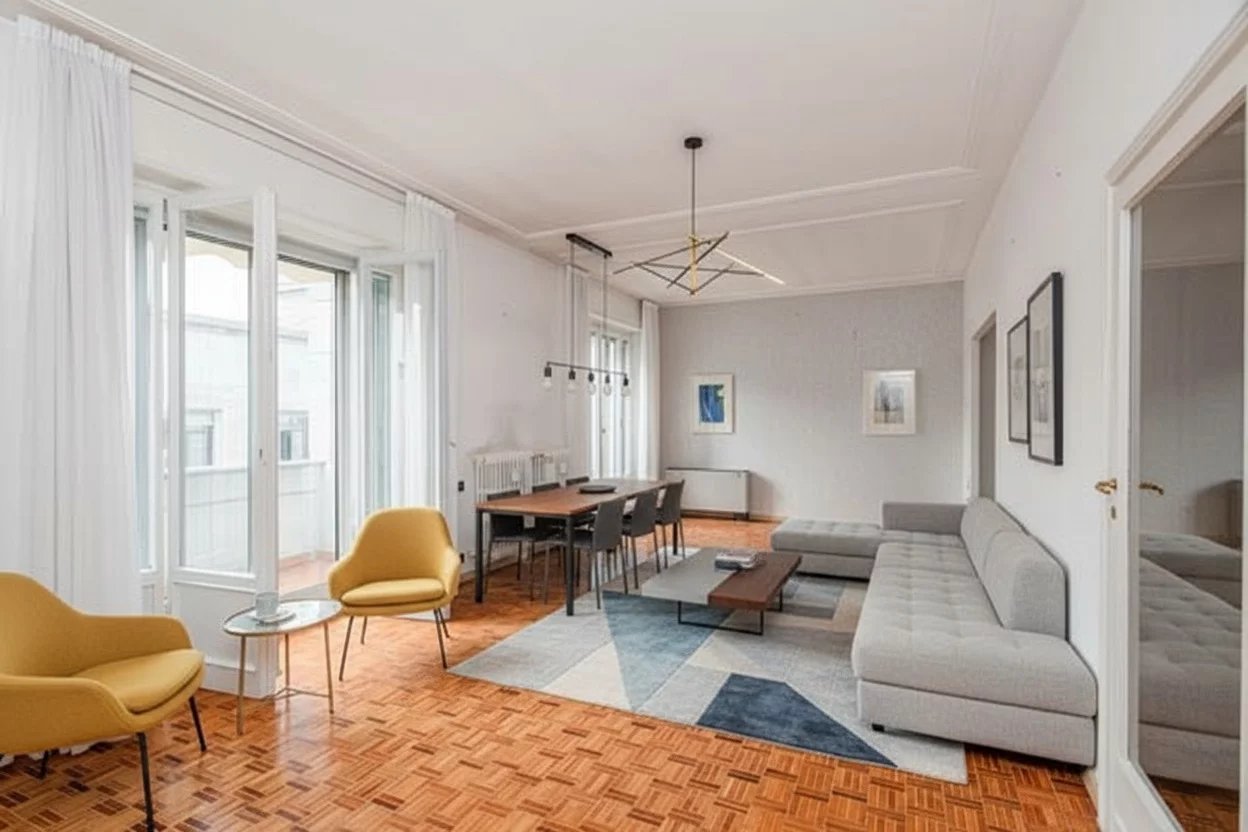 AN EXCLUSIVE OF JOHN TAYLOR top floor apartment in the heart of the centre of Milan, in an elegant, prestigious building with concierge service. Top-floor penthouse of approx. 195 sqm, very bright and quiet, with a splendid panoramic view. Two entrances, double living room with terrace, four bedrooms, study, large master bathroom (possibility of a second bathroom), eat-in kitchen, maid’s room, windowed laundry room, storage room, balcony, and cellar.