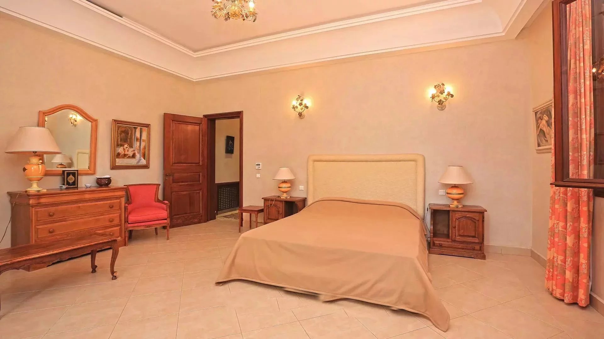 Built on two levels, the first floor features an entrance hall leading to a double reception room with remarkably high ceilings, providing bright living spaces with direct access to the garden and swimming pool. As for the living rooms, there are three indoors, one with a fireplace, and two outdoors under a lovely shaded terrace.