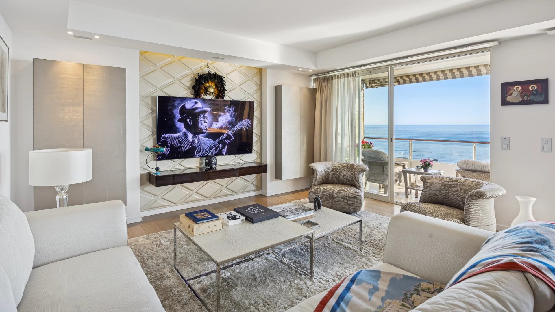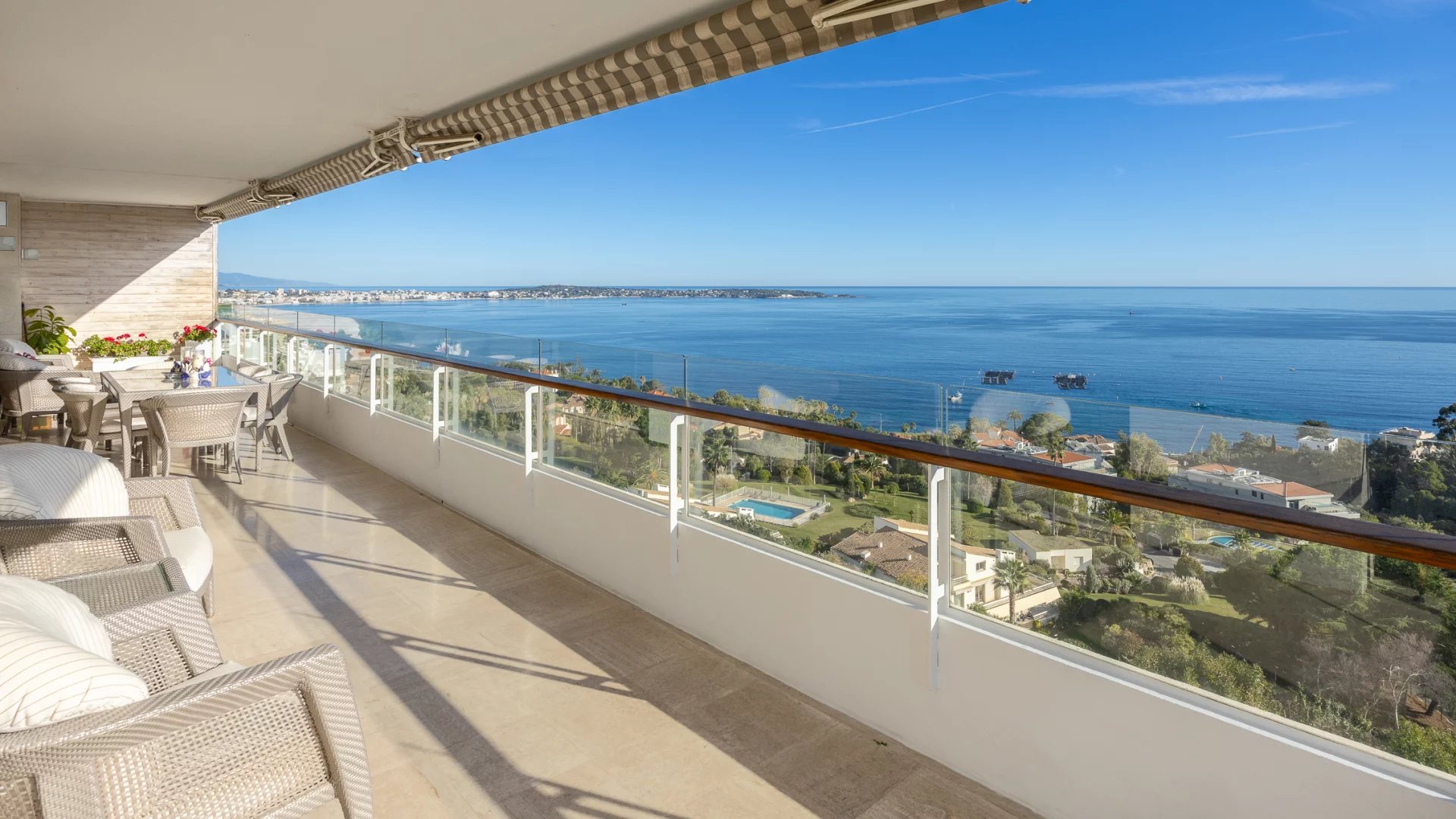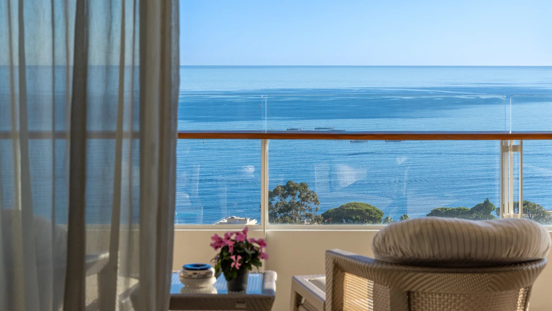 This corner apartment, on a high floor, spans approximately 138 sqm and stands out for its spacious and bright living room, opening onto a 47 sqm corner terrace, offering breathtaking panoramic views of the Mediterranean Sea. The absence of vis-à-vis ensures total privacy, while the parquet flooring and beautiful contemporary features add an elegant touch.