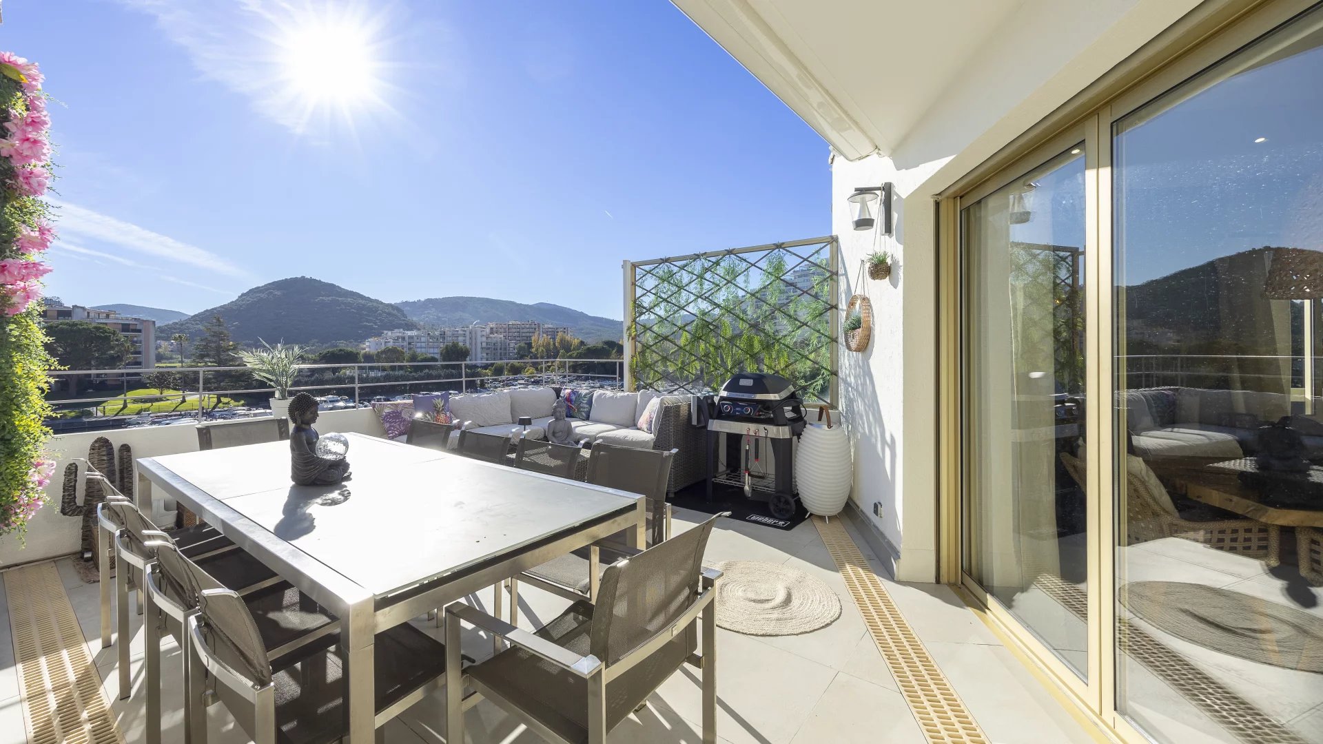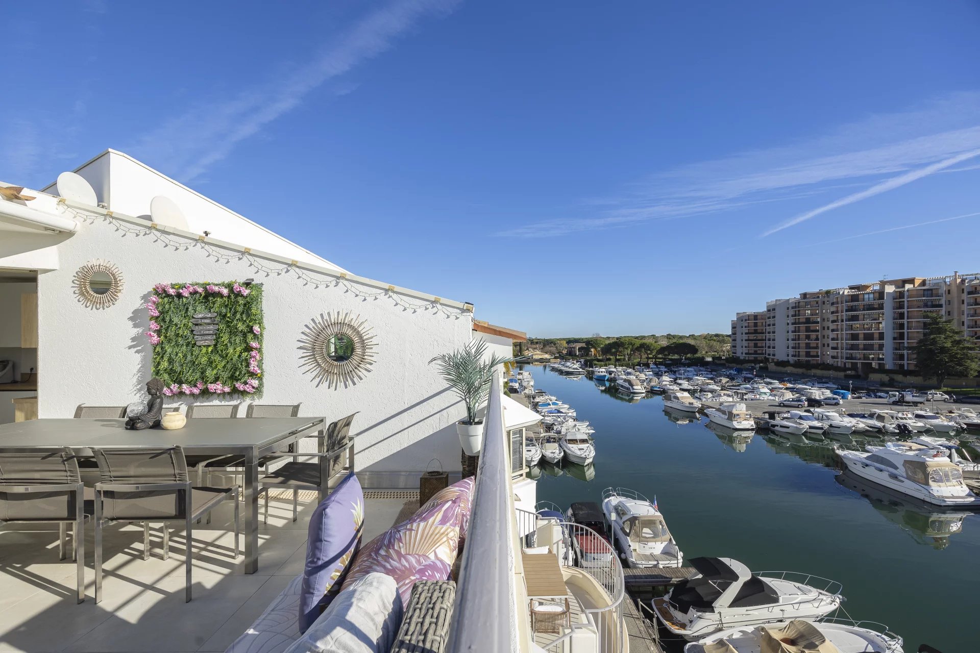 Superb, fully renovated 95.52 sqm apartment on the 3rd and top floor on Île de Cannes Marina, with south/west exposure and unobstructed views of the marina and San-Peyre. It offers a bright living/dining room with high ceilings, a fitted kitchen, 3 bedrooms including one en-suite, 2 bathrooms and 2 terraces of approximately 17 and 23 sqm. This apartment with high-end amenities, in the heart of a residence with a swimming pool and caretaker, has a closed garage. Close to shops, beaches and 35 minutes from Nice International Airport.