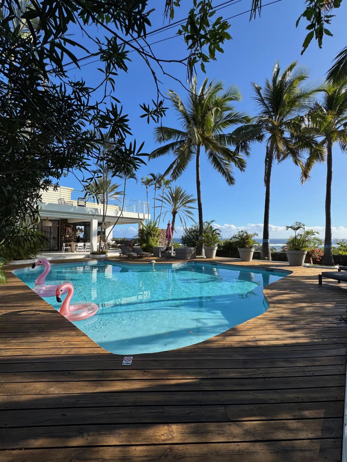 A magnificent swimming pool surrounded by a lush, landscaped garden.