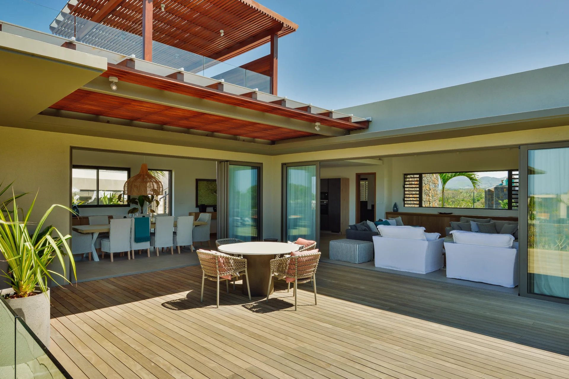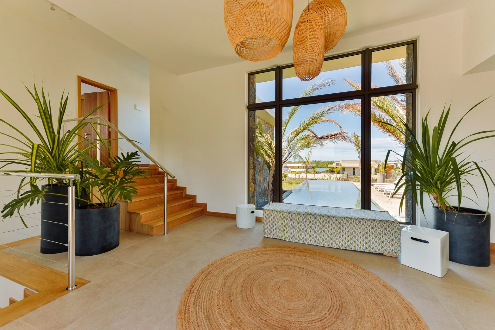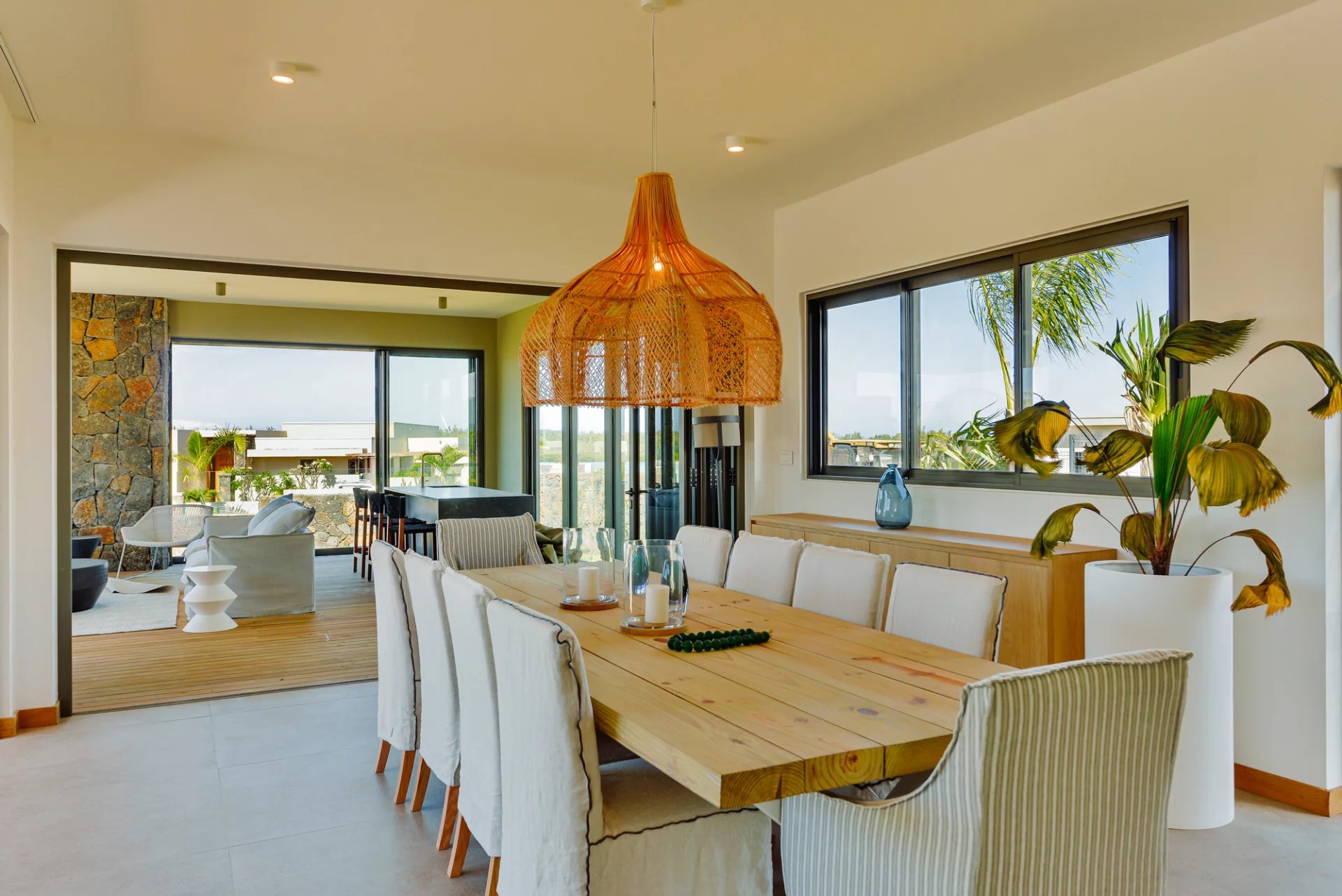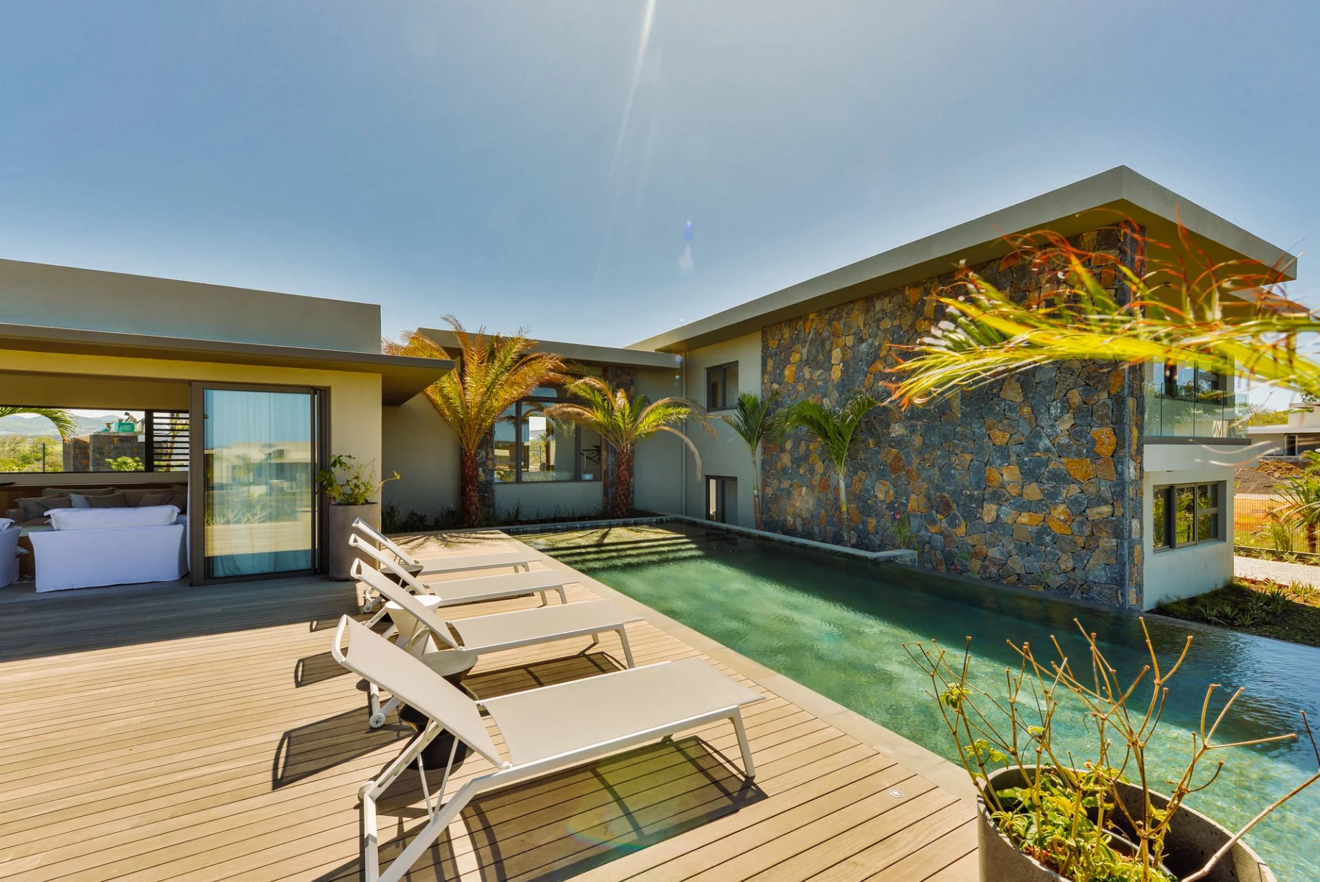 Designed by renowned Mauritian architect JM Eynaud and built by Maison M, the villa showcases exceptional craftsmanship and contemporary elegance.