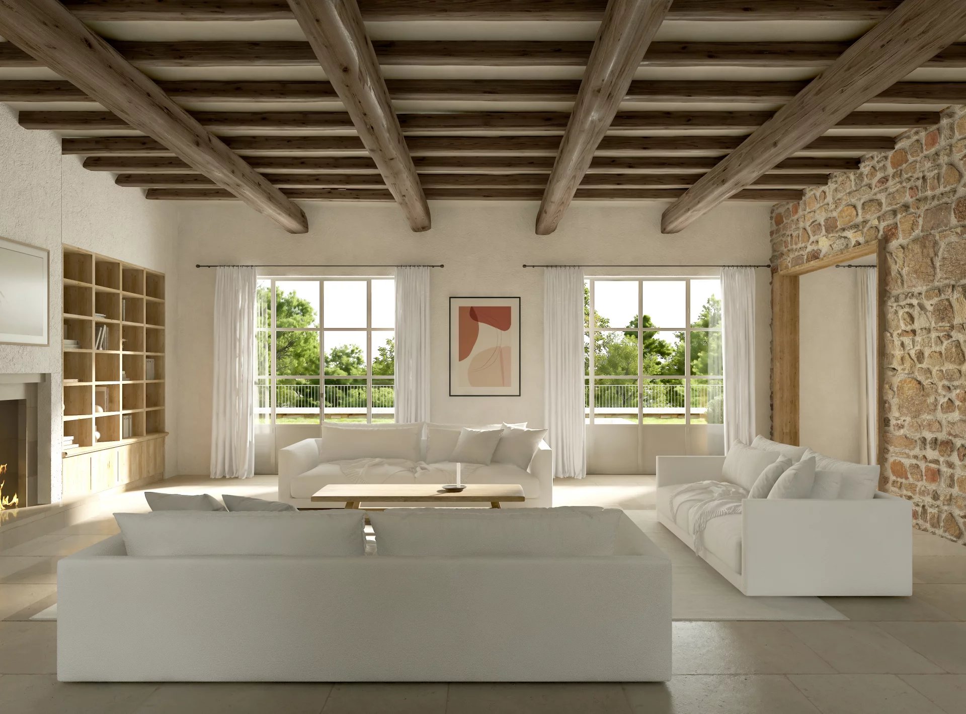 The kitchen, a refined blend of natural stone and wood, features large picture windows framing the view. An elegant library leads to a first suite with walk-in dressing room, bathroom and direct access to the outdoor areas.