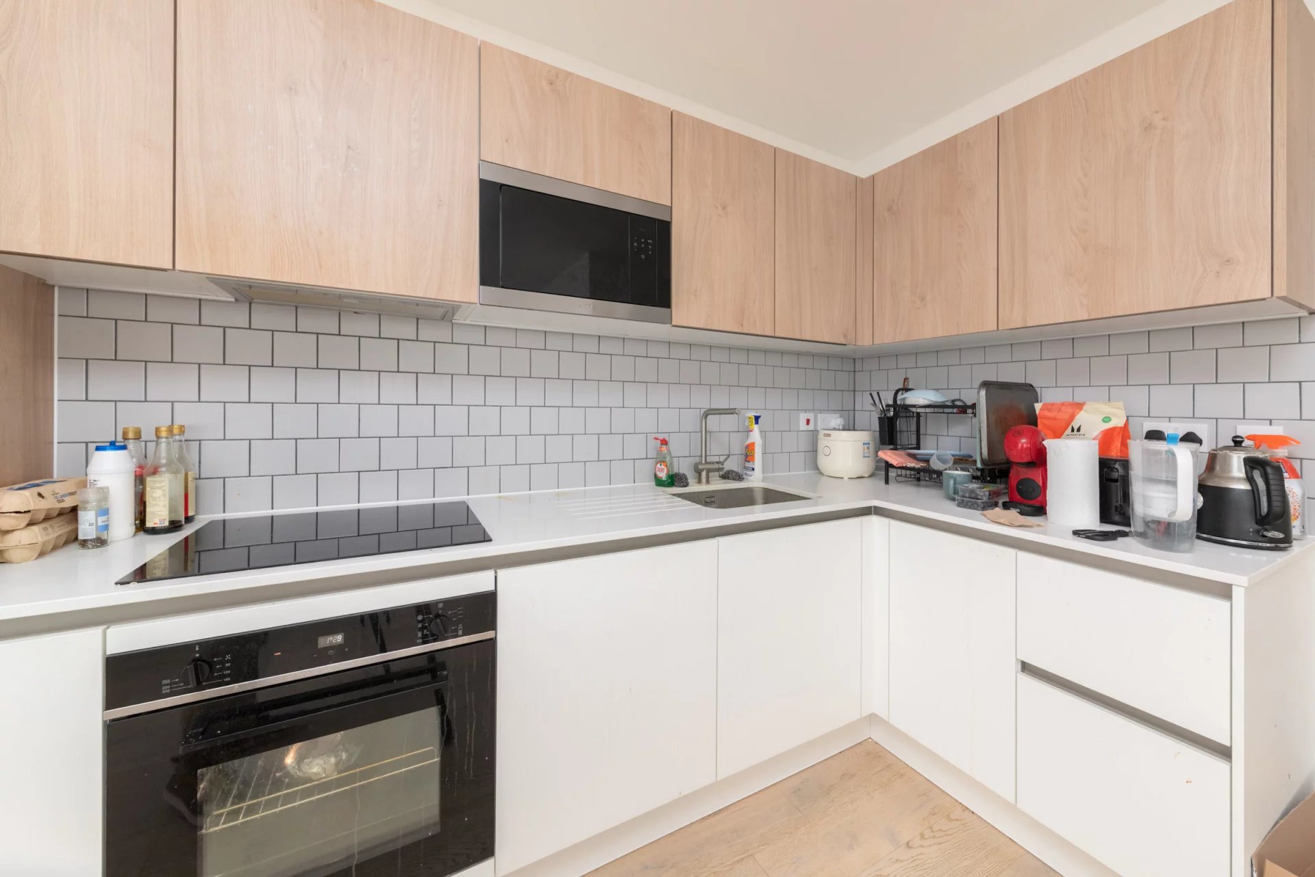 The property features a spacious open plan living and dining area with a contemporary fitted kitchen finished to a high specification. Floor to ceiling windows provide excellent natural light and deliver far reaching views across Watford and beyond, a particular benefit of this elevated position.