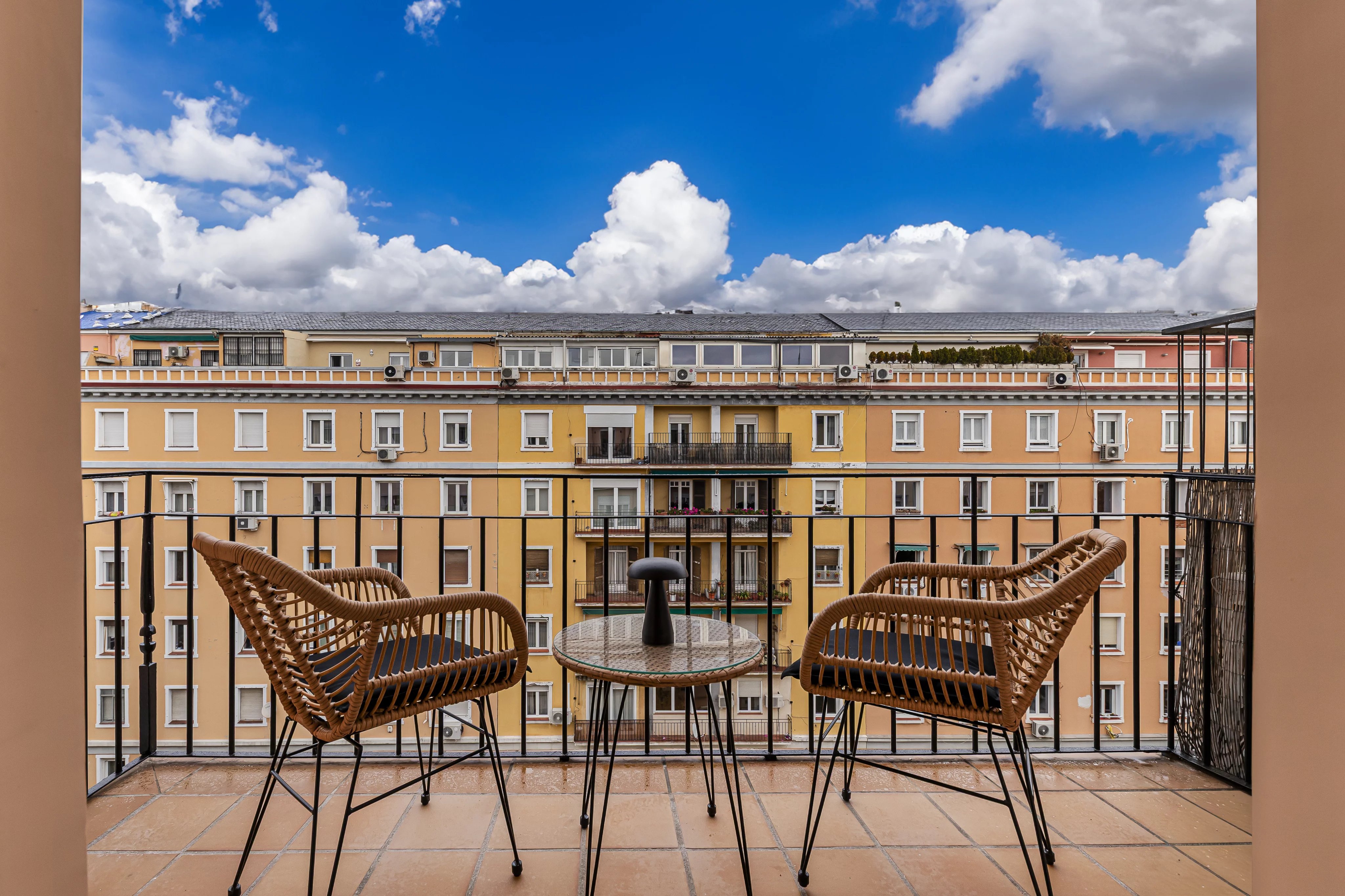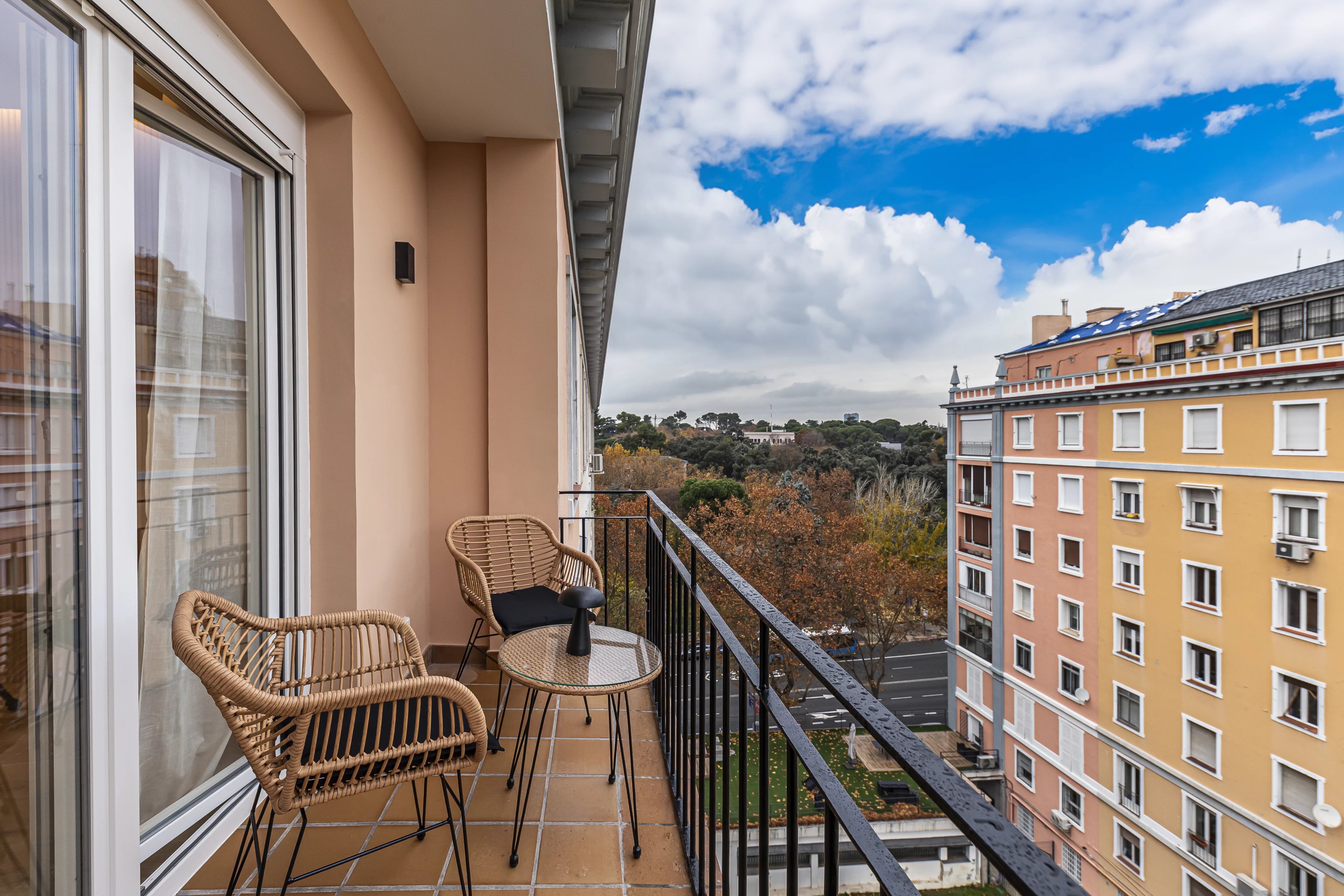 A spacious and bright living room that invites us to enjoy the stunning views of the Retiro from its terrace.
