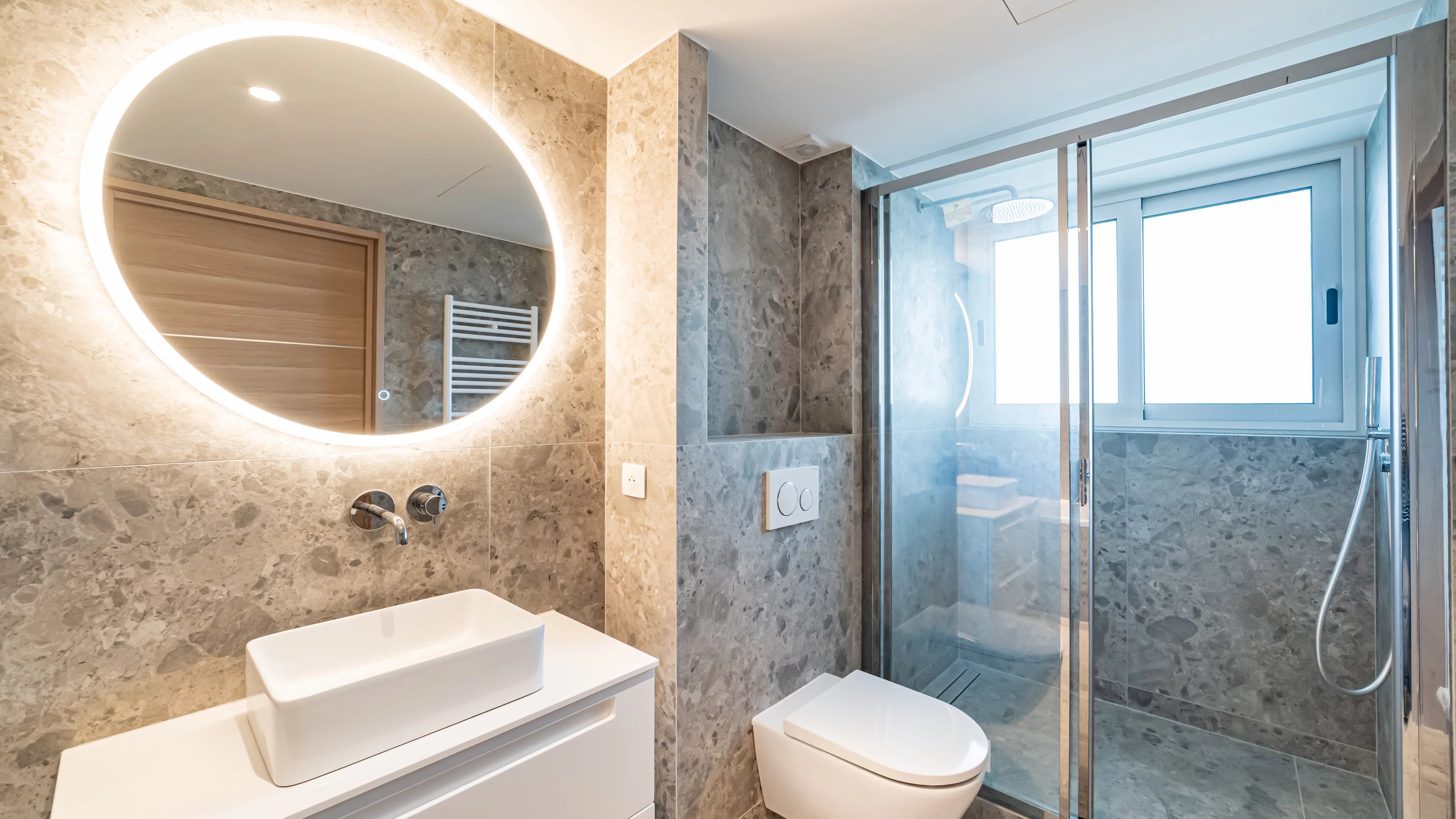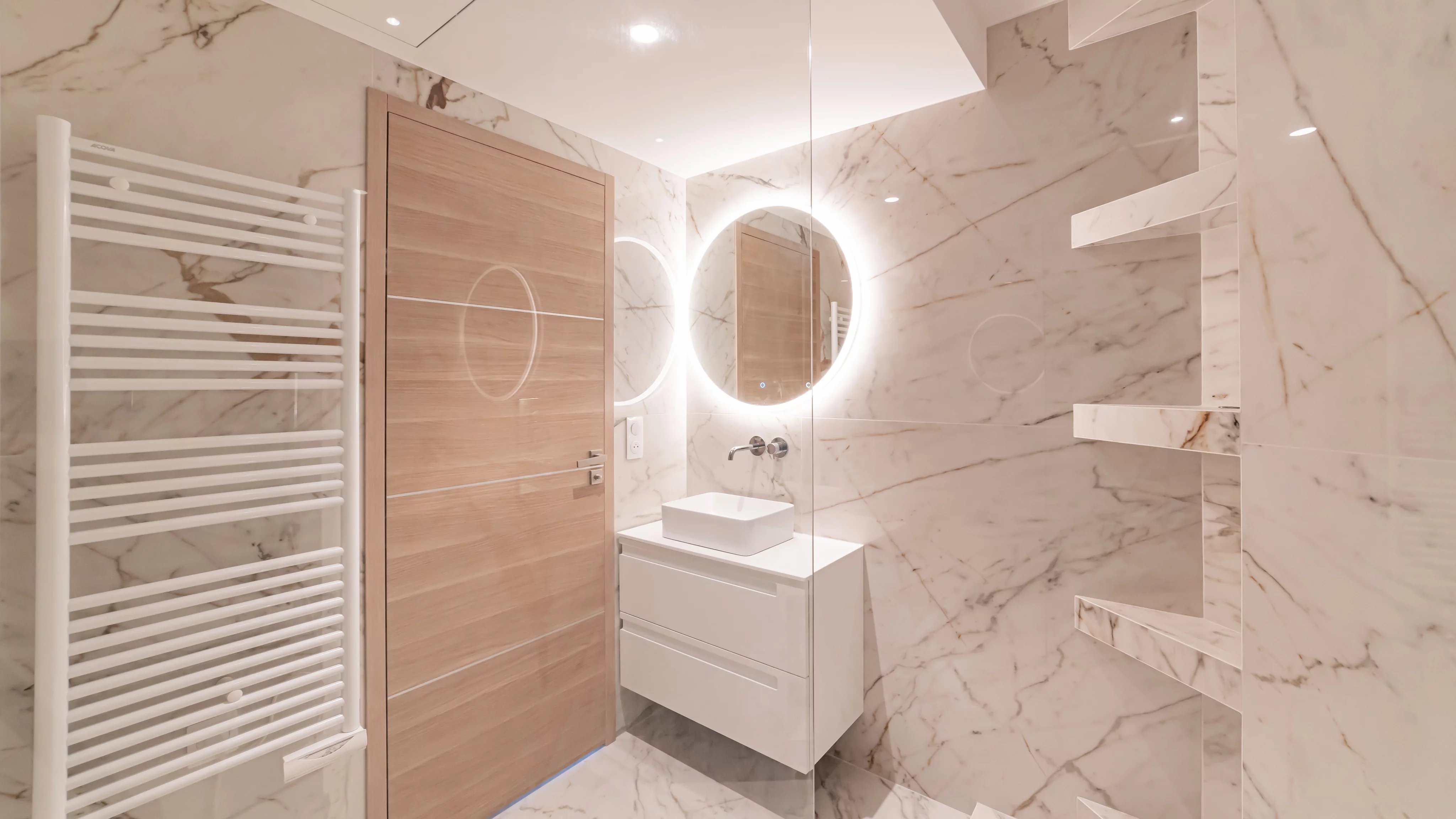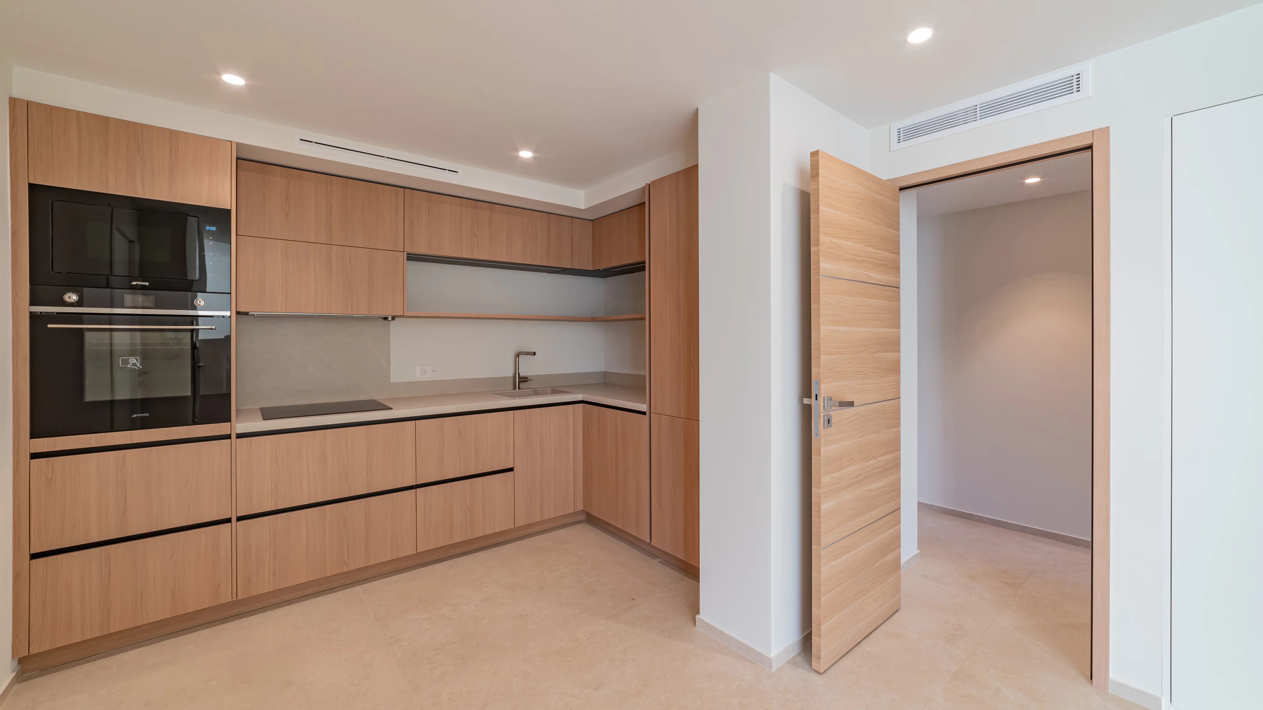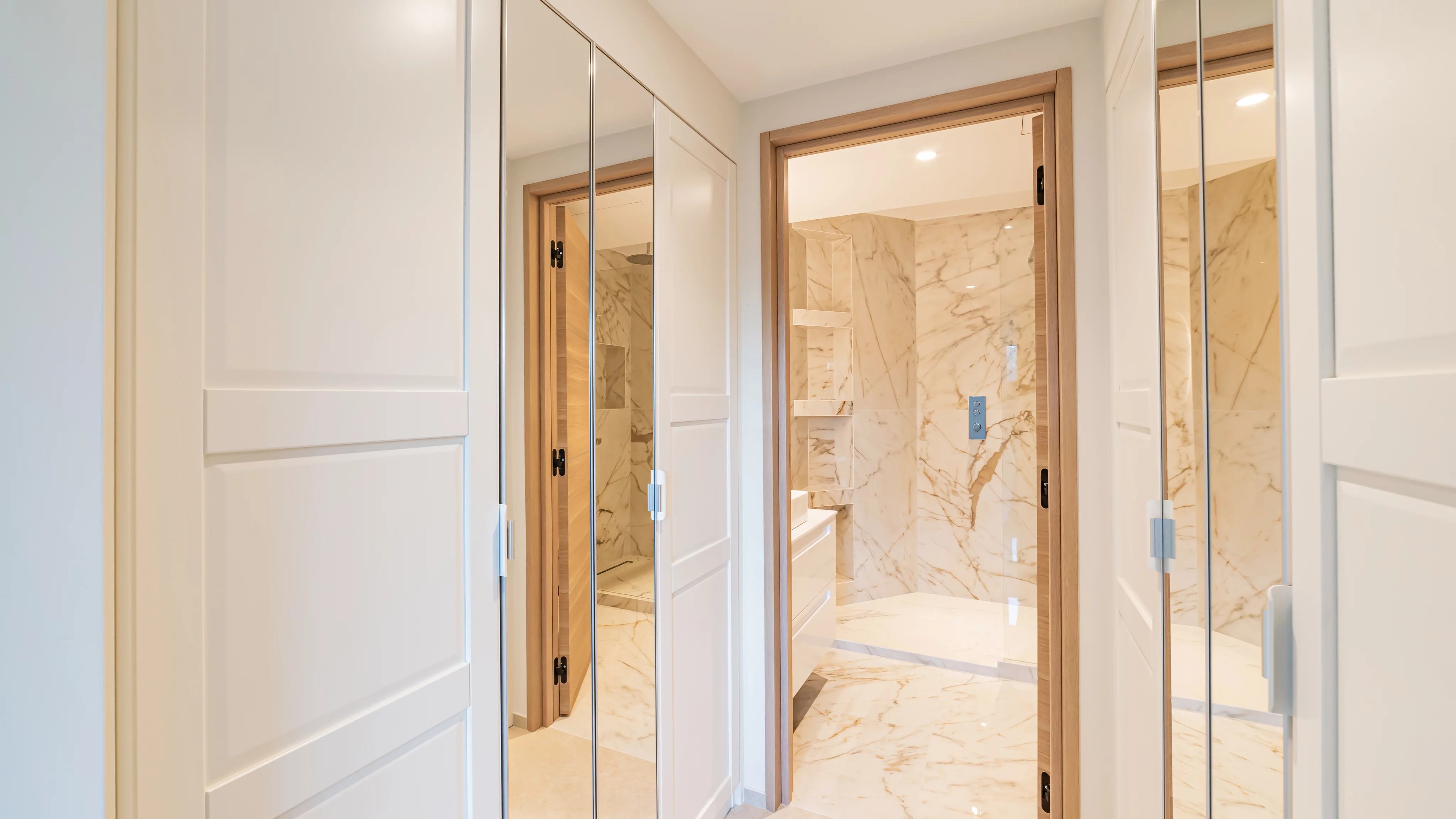 It comprises an entrance hall, a living room with dining area opening onto an 11.85 m² terrace, a fully equipped kitchen and two bedrooms, each with its own shower room and dressing room.