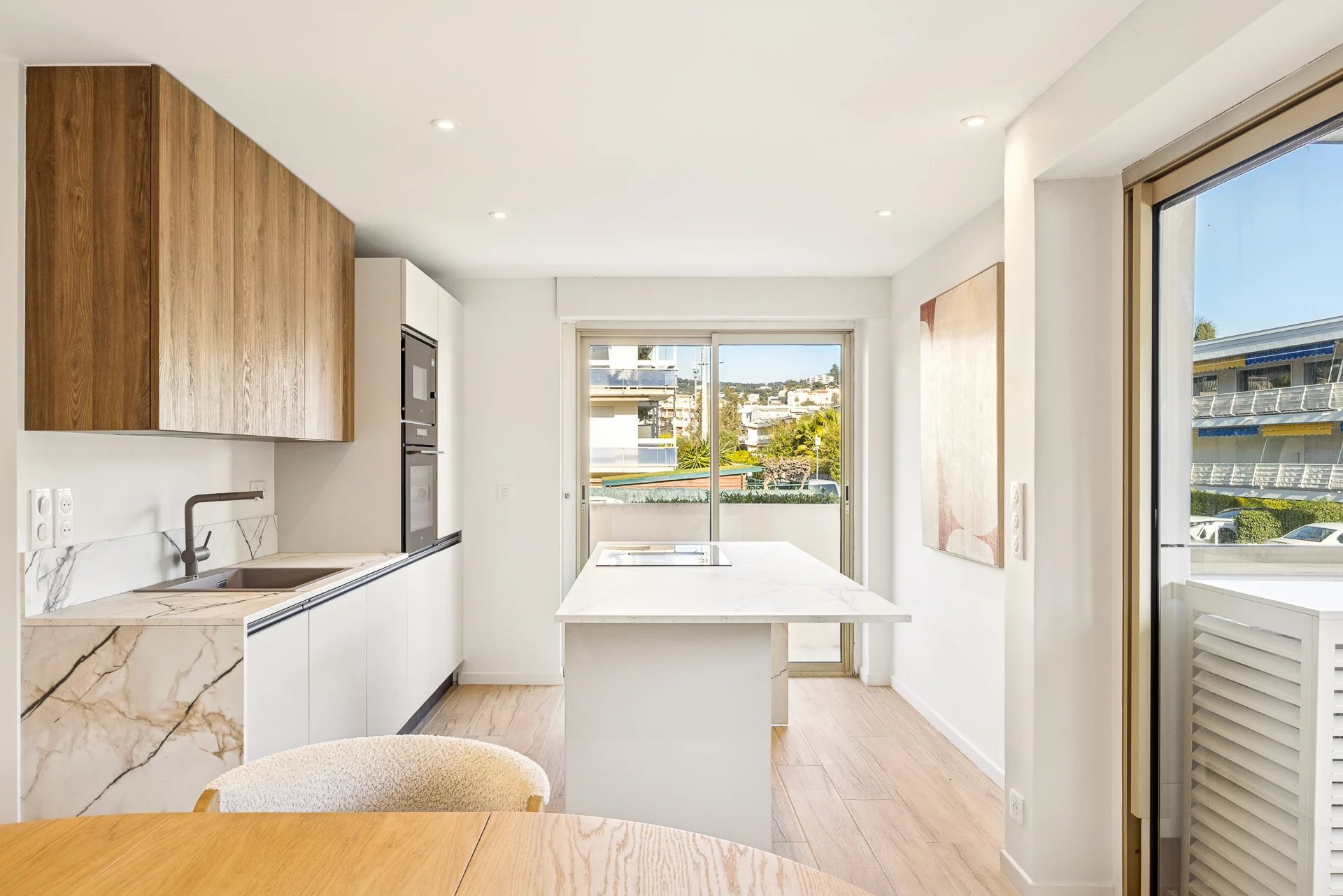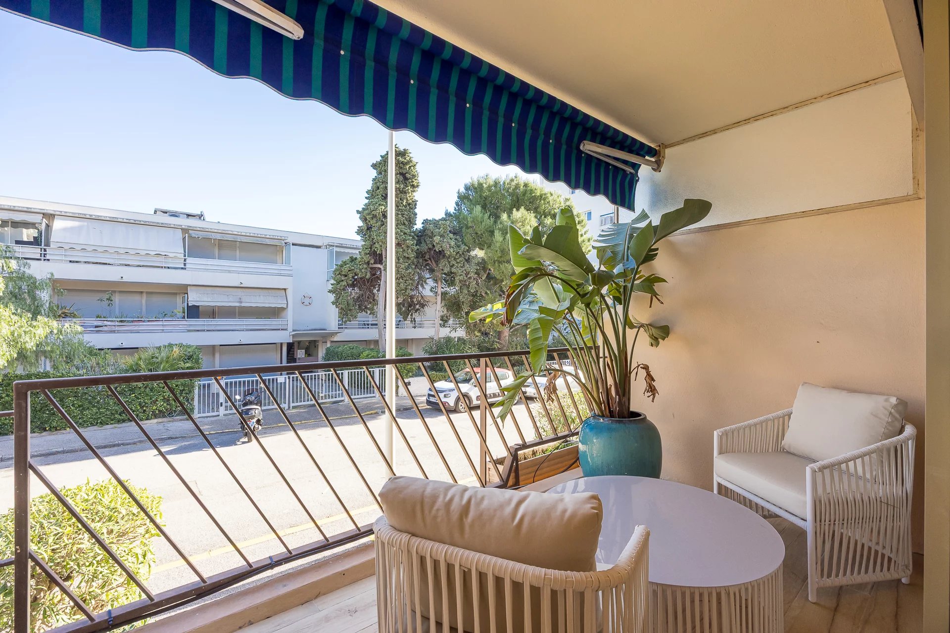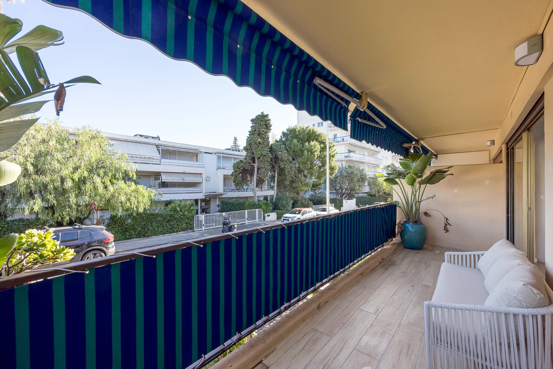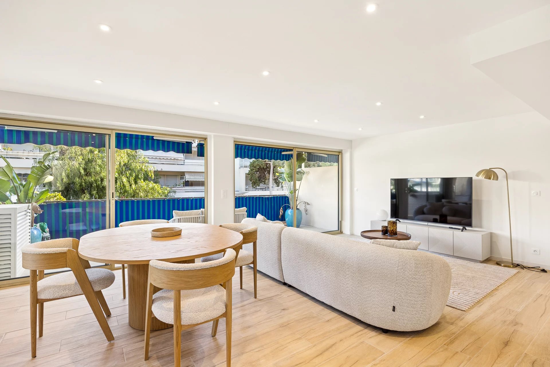 Located within a private and secure estate, in the immediate vicinity of the Palm Beach beaches and shops, this fully renovated 4-room apartment of approximately 96 sqm is tastefully finished. It comprises a double living room opening onto a sunny terrace, a modern fully equipped kitchen, three bedrooms with built-in wardrobes including a master bedroom with an en-suite shower room and toilet, a second shower room, a guest toilet, and a storage room.