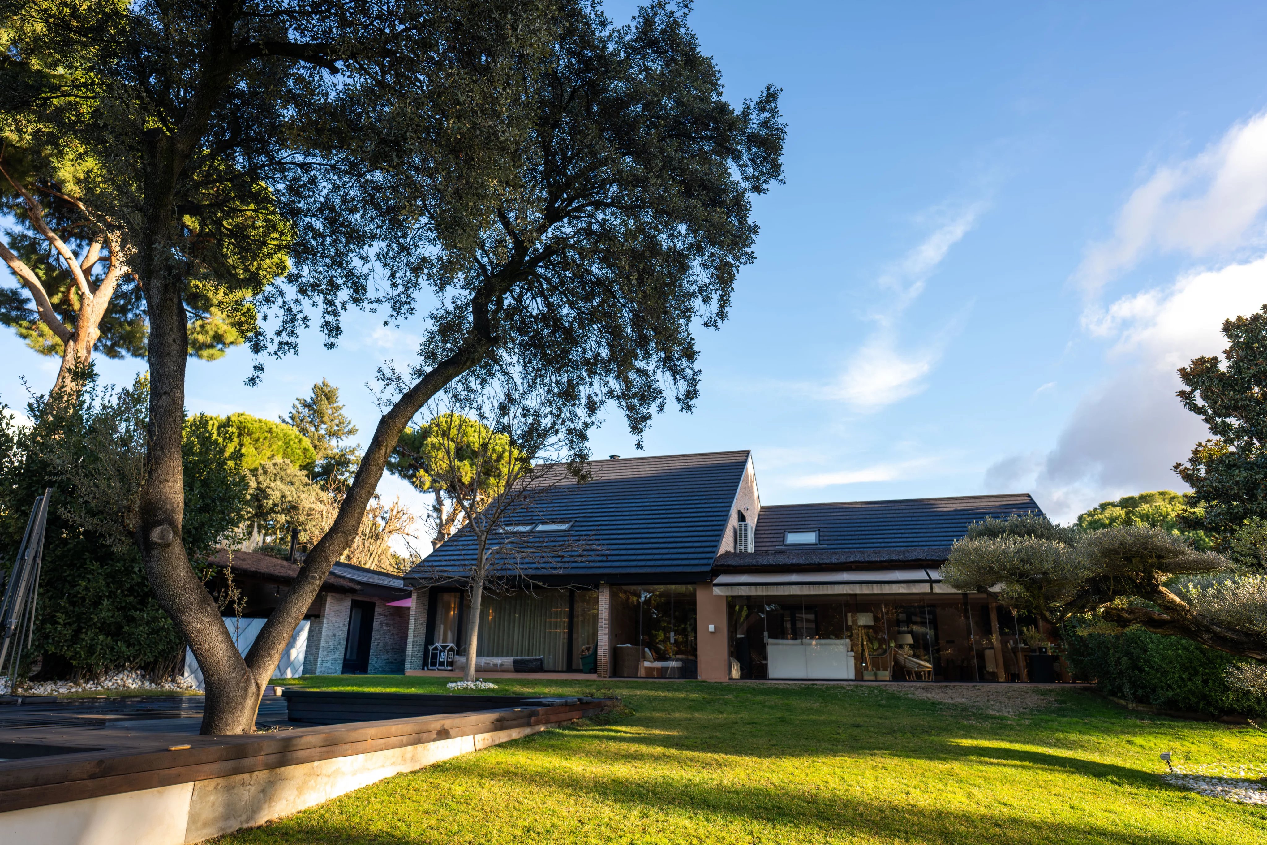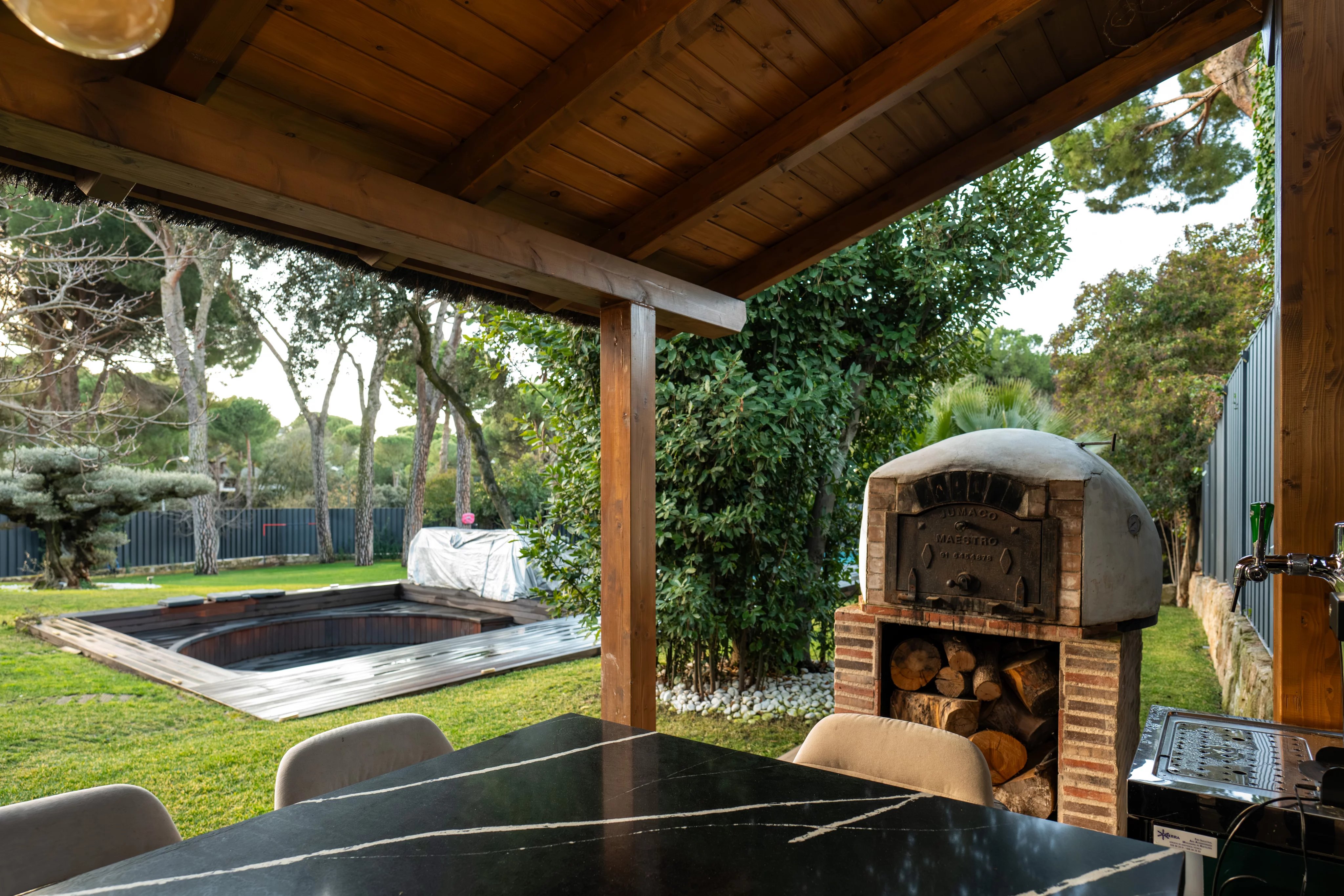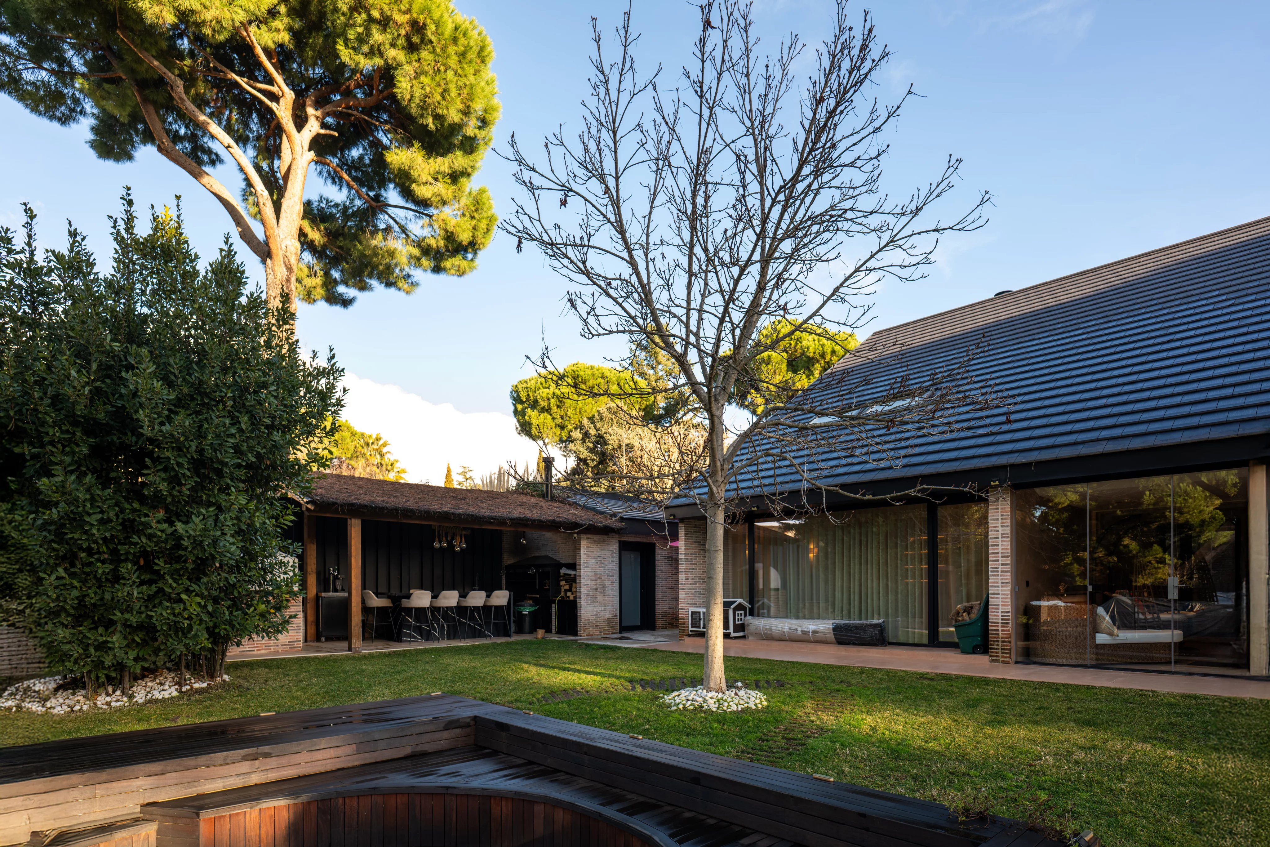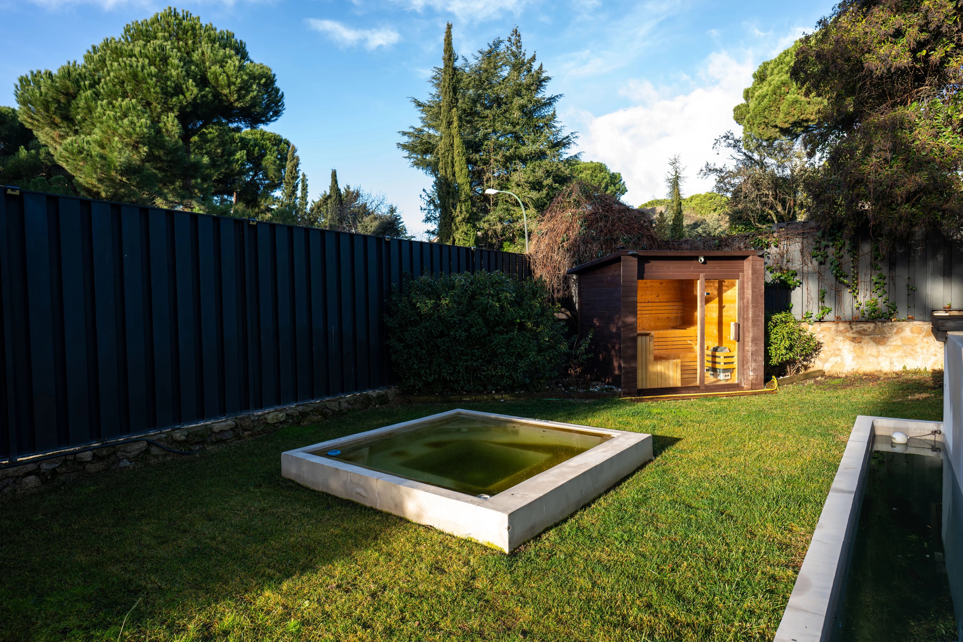 The garden, carefully designed, is an authentic private oasis. It has a barbecue, wood oven, a large outdoor table ideal for enjoying the summer months, outdoor pool with jacuzzi and a wooden house with sauna, creating a unique space for relaxation, leisure and wellness. Its centenary pine trees also provide the beauty of the natural environment, just 15 minutes from the center of the capital of Spain.