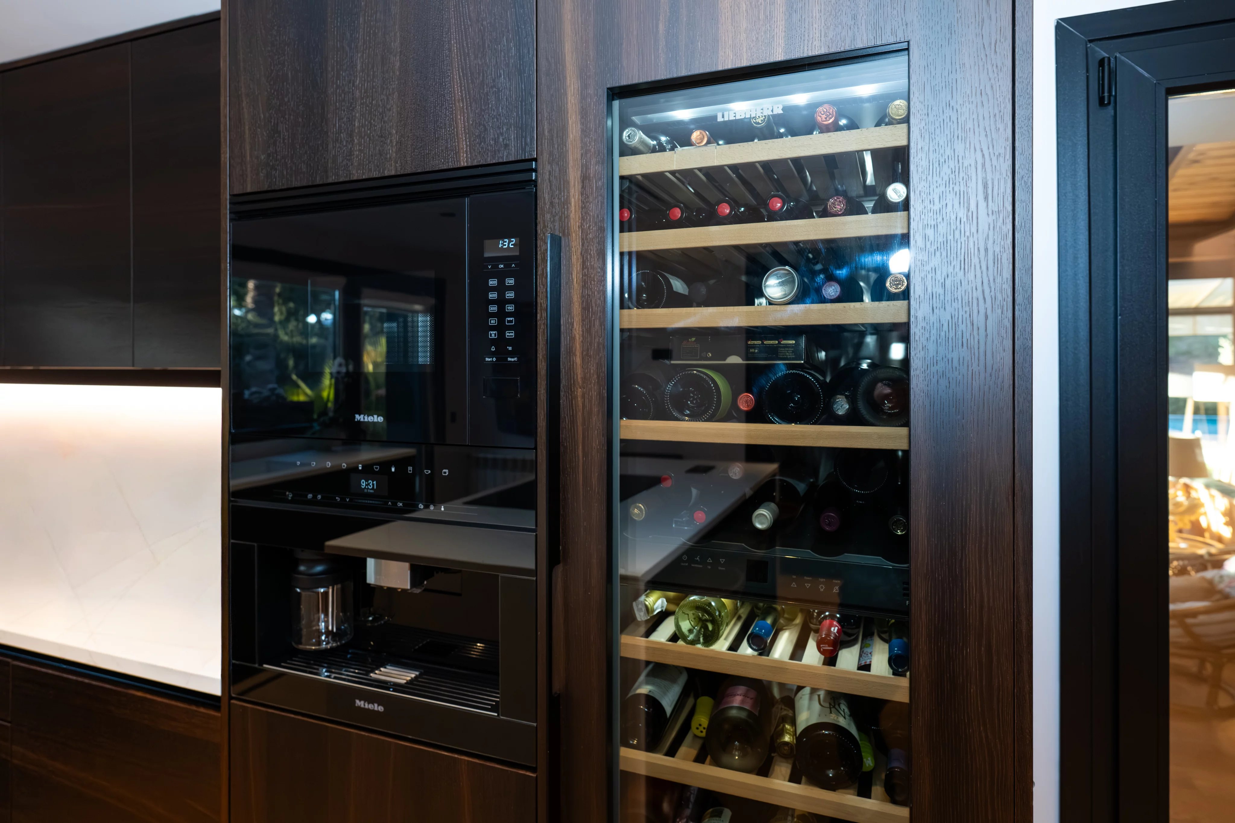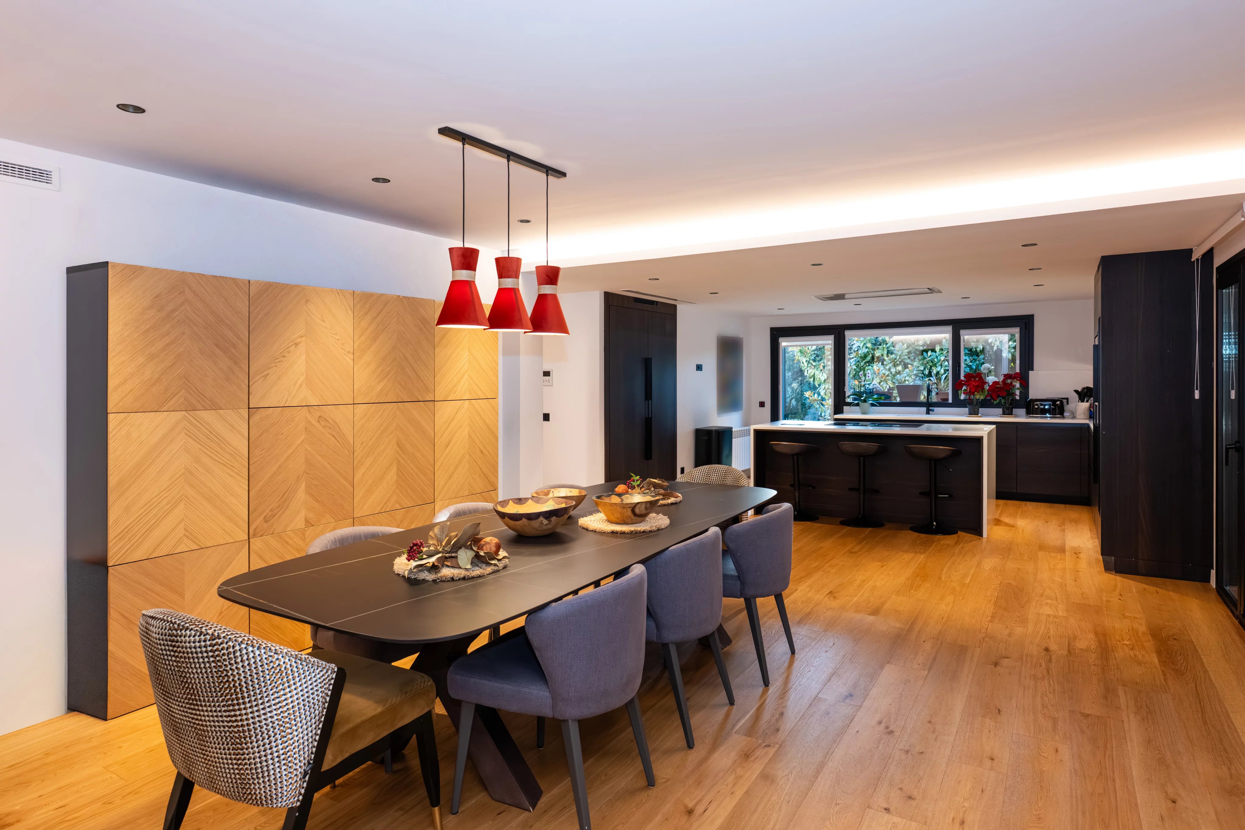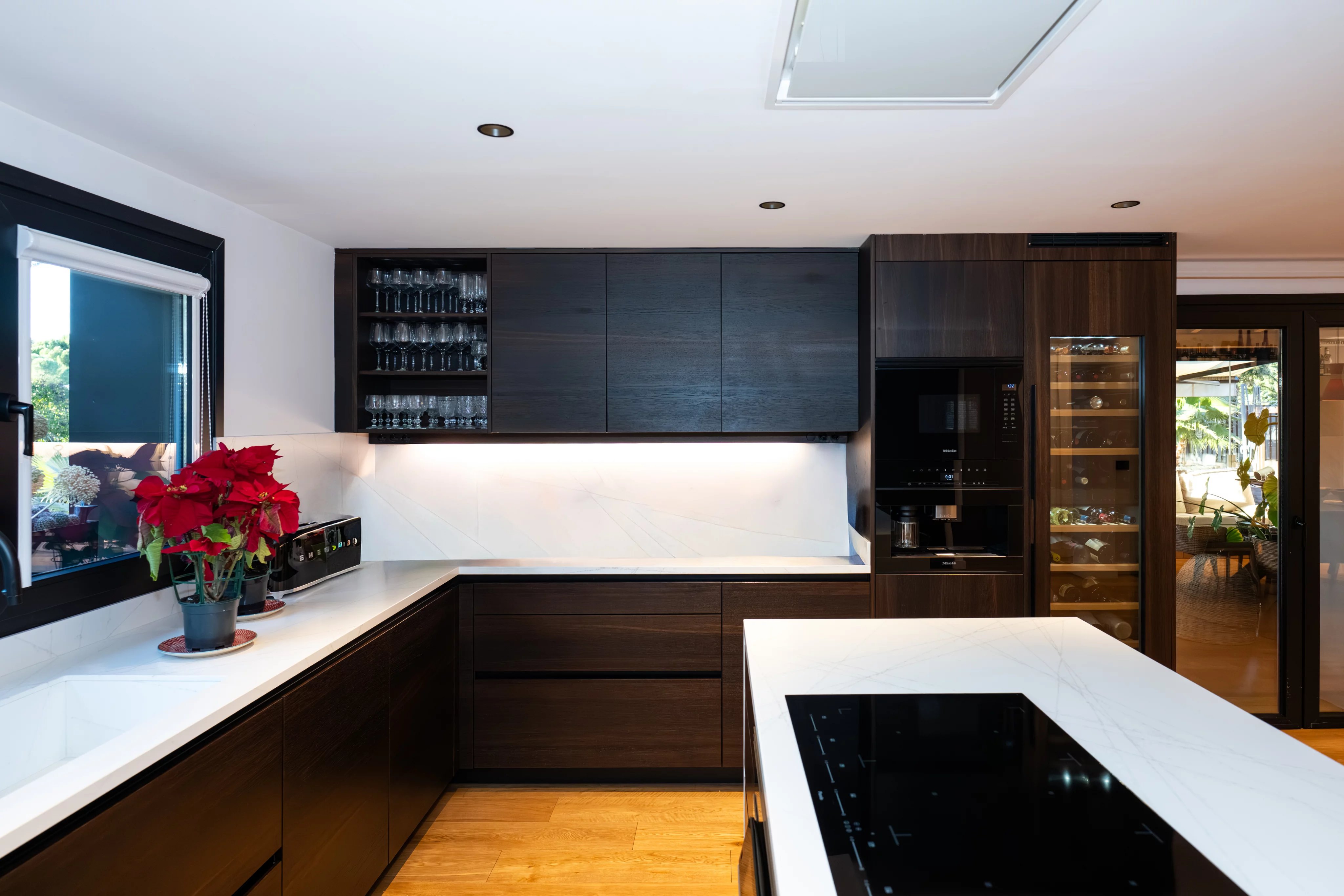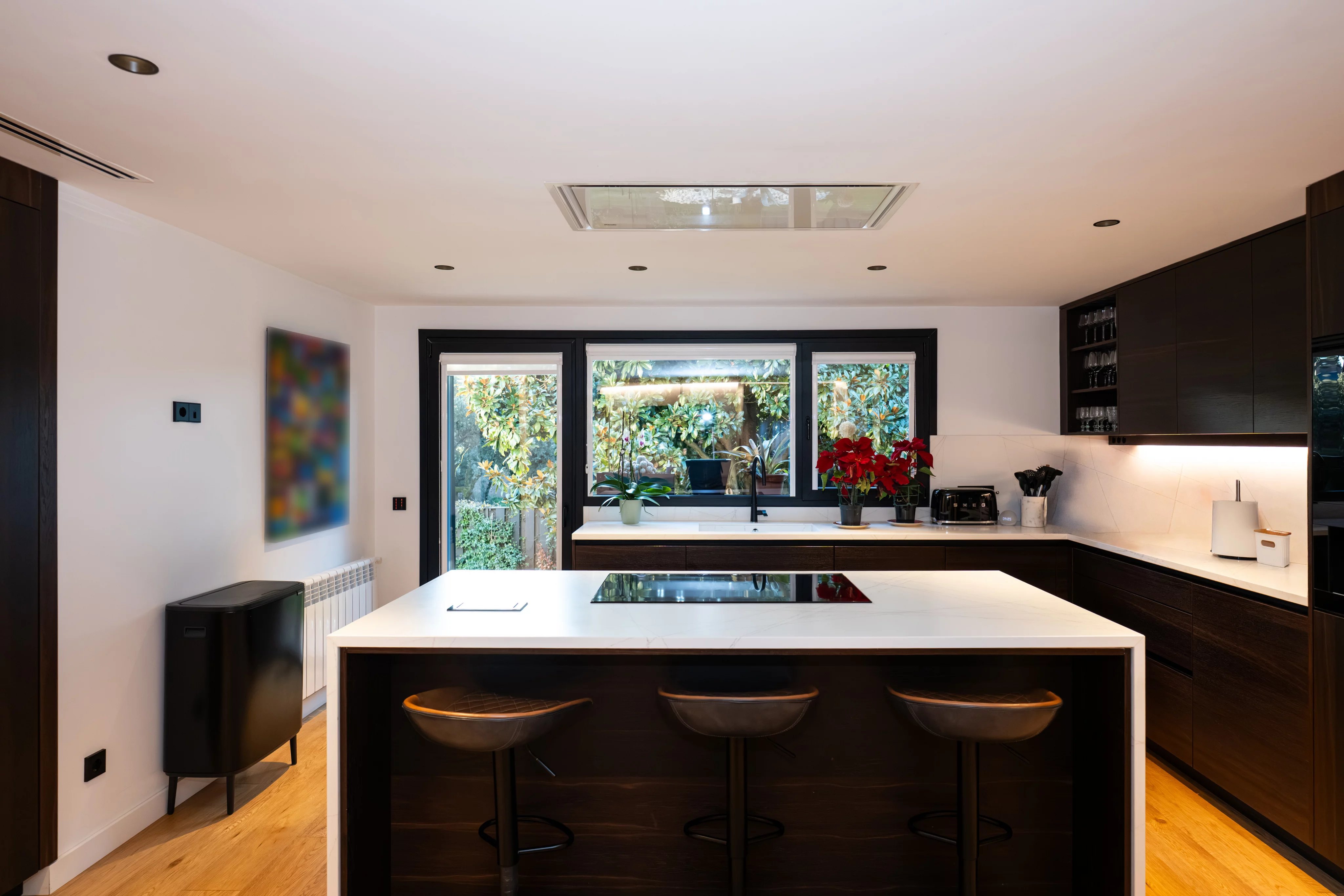 On the first floor, the house impresses from the first moment with a large living room with high ceilings and fireplace, flooded with natural light thanks to its large windows with direct access to the beautiful consolidated garden, creating an elegant, warm and sophisticated atmosphere. The generously sized kitchen is fully equipped and has a wine fridge with ample space, ideal for both day to day and for special occasions.