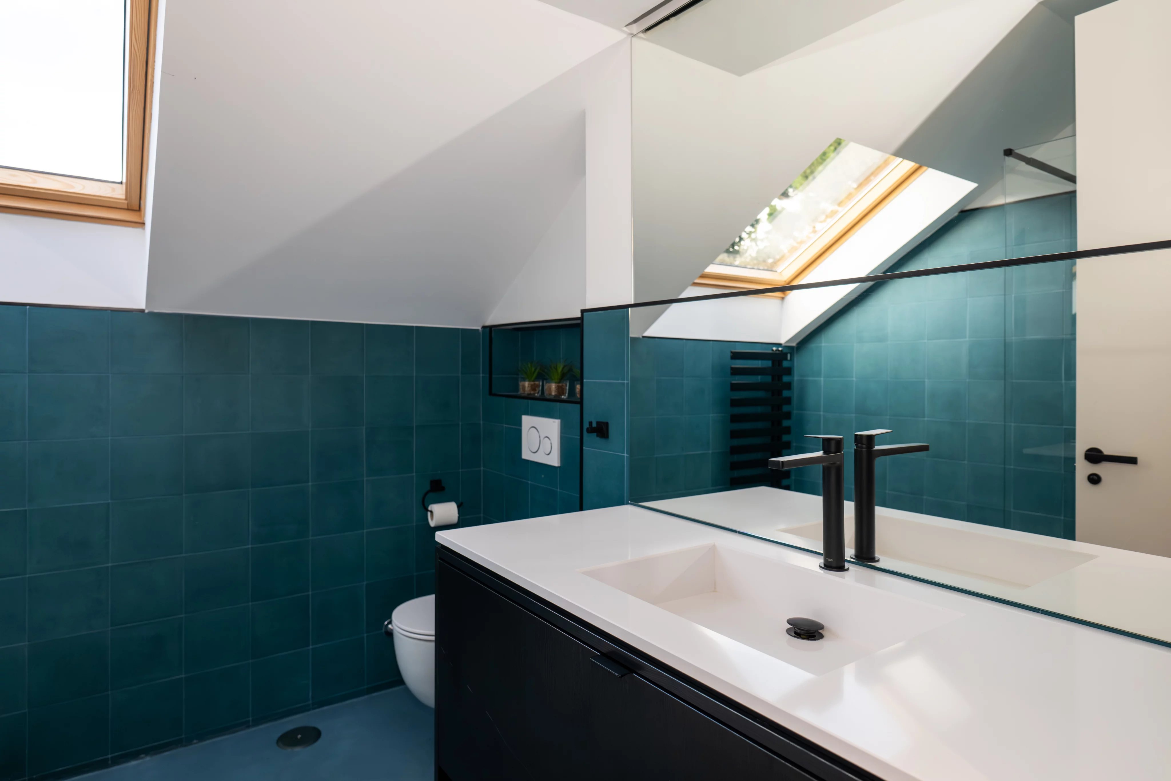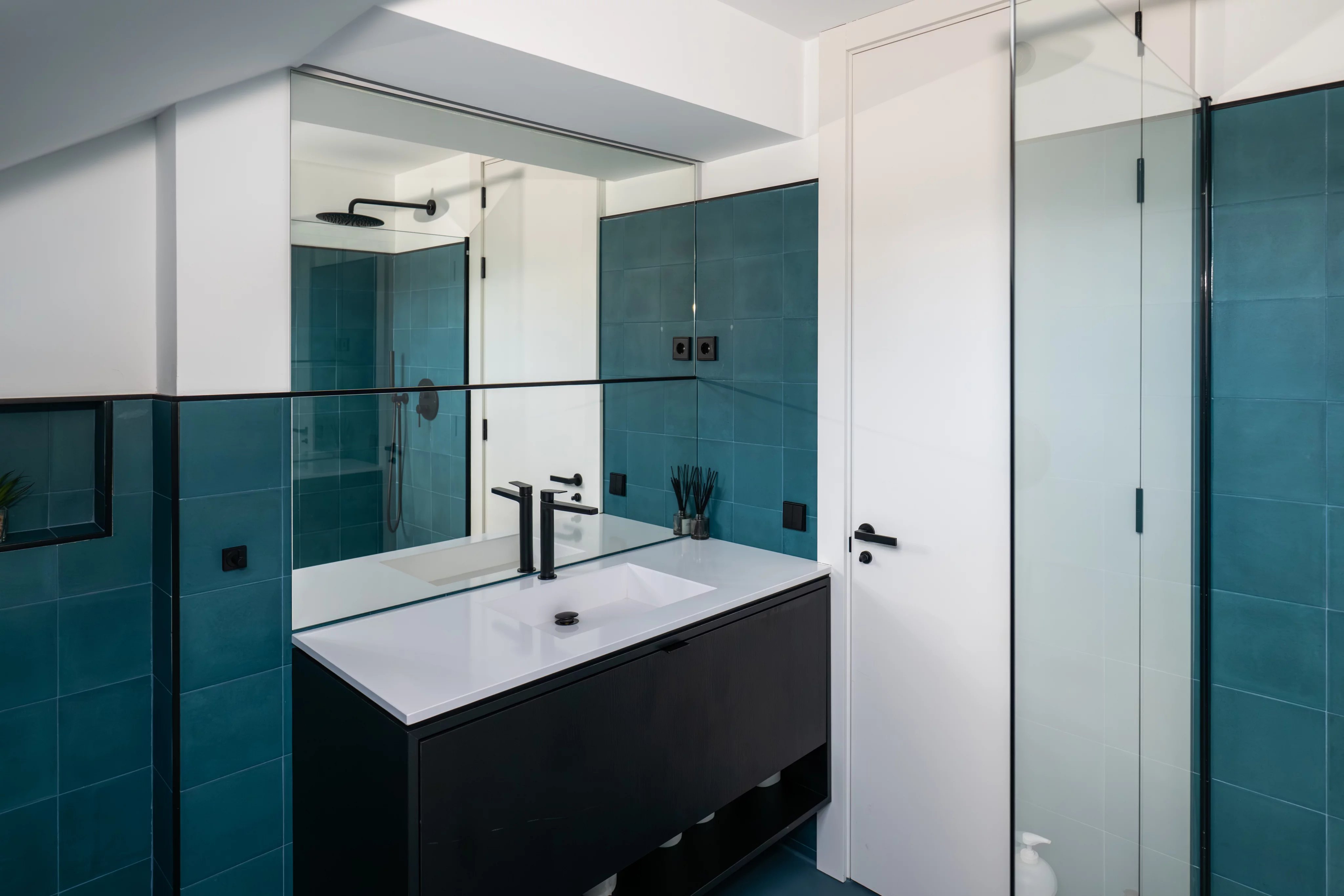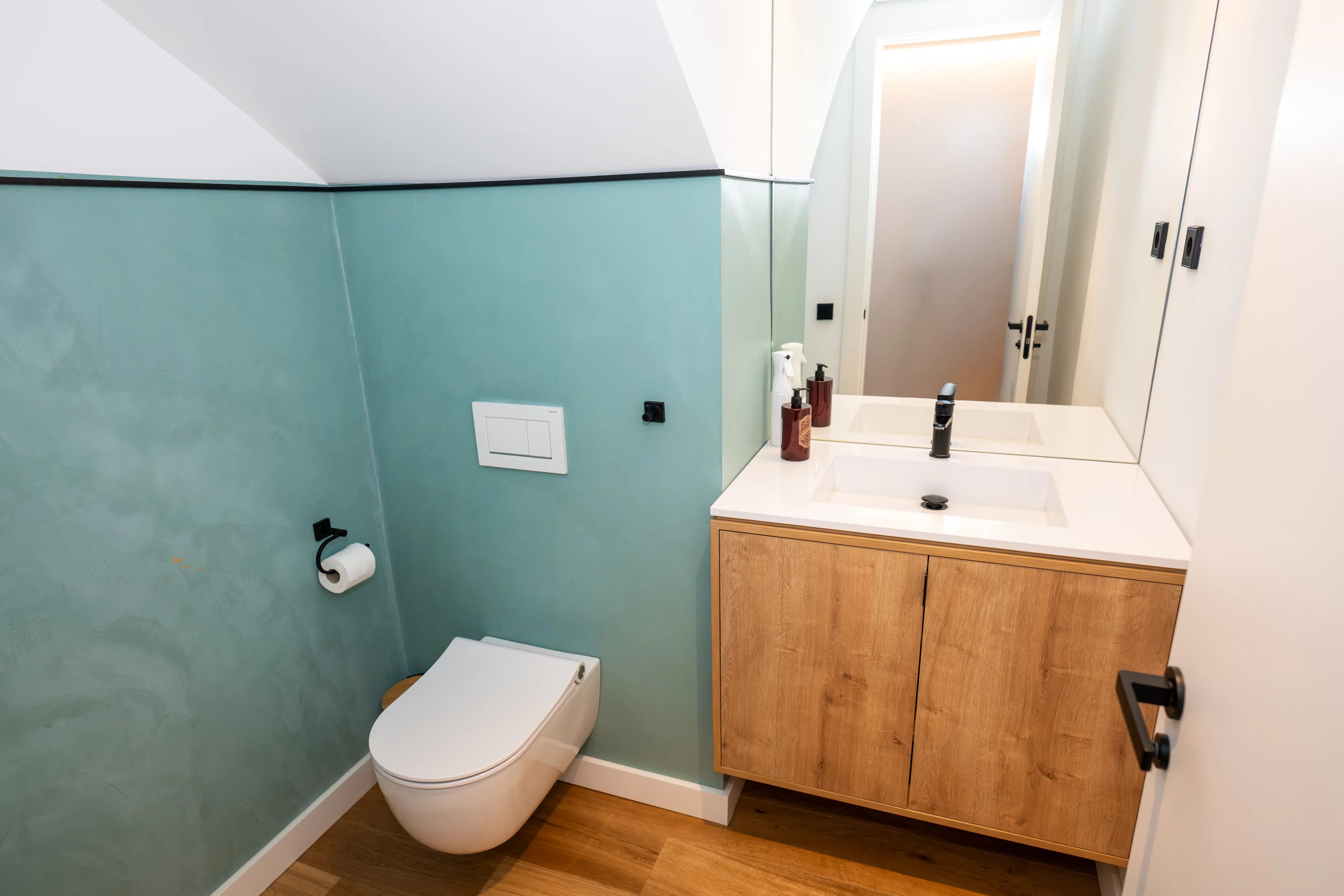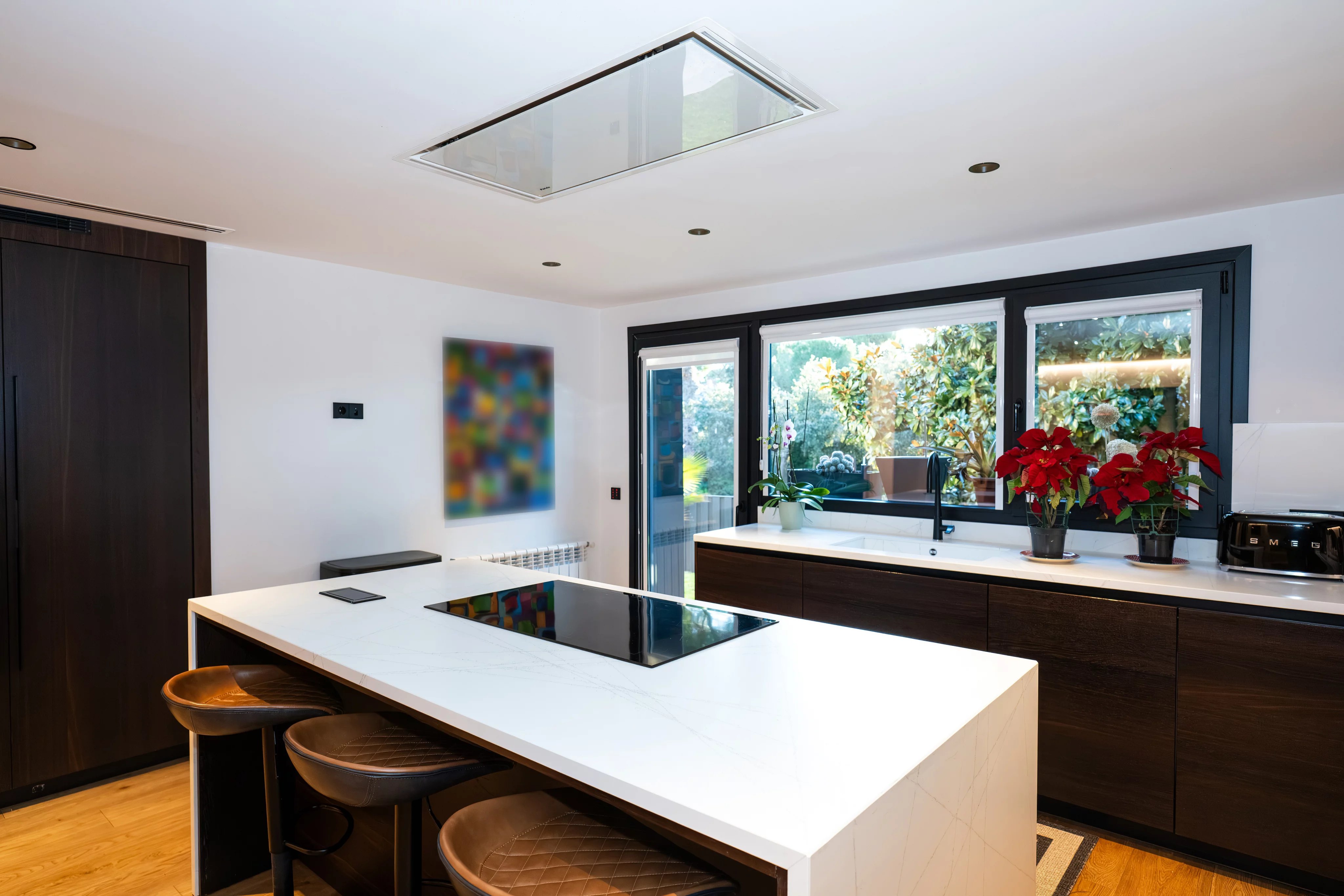 On the first floor, the house impresses from the first moment with a large living room with high ceilings and fireplace, flooded with natural light thanks to its large windows with direct access to the beautiful consolidated garden, creating an elegant, warm and sophisticated atmosphere. The generously sized kitchen is fully equipped and has a wine fridge with ample space, ideal for both day to day and for special occasions.