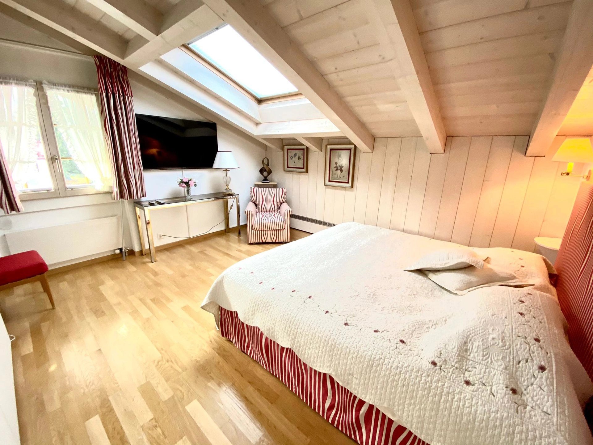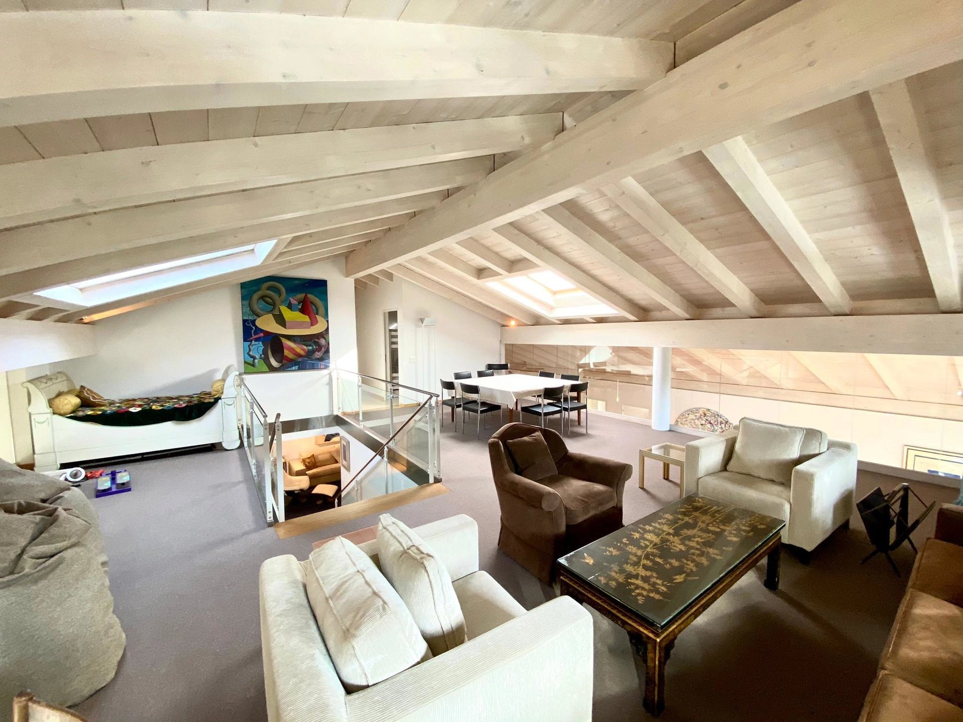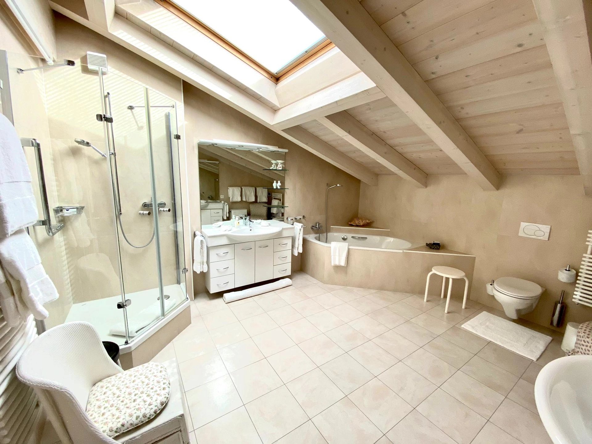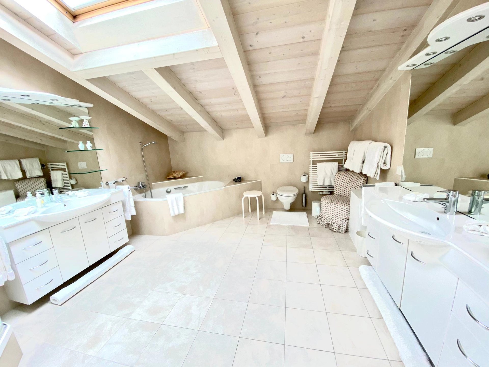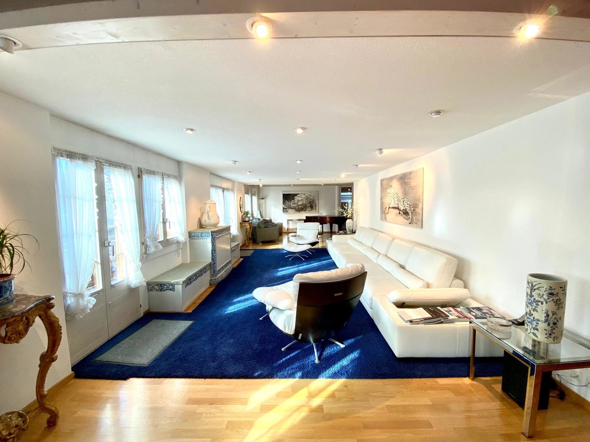 Very beautiful and spacious 7 bedrooms apartment with 5 bathrooms, located in the center of Gstaad, above the Migros supermarket. The apartment has a big entrance hall with 2 living/sitting rooms, a guest toilet, a very big dining room and a open kitchen and 5 bedrooms on one floor. On the second floor (attic) are 2 bedrooms 1 with en-suite bathroom, a big TV/sitting-room and a laundry room. A balcony and 4 parking spaces complete this property.