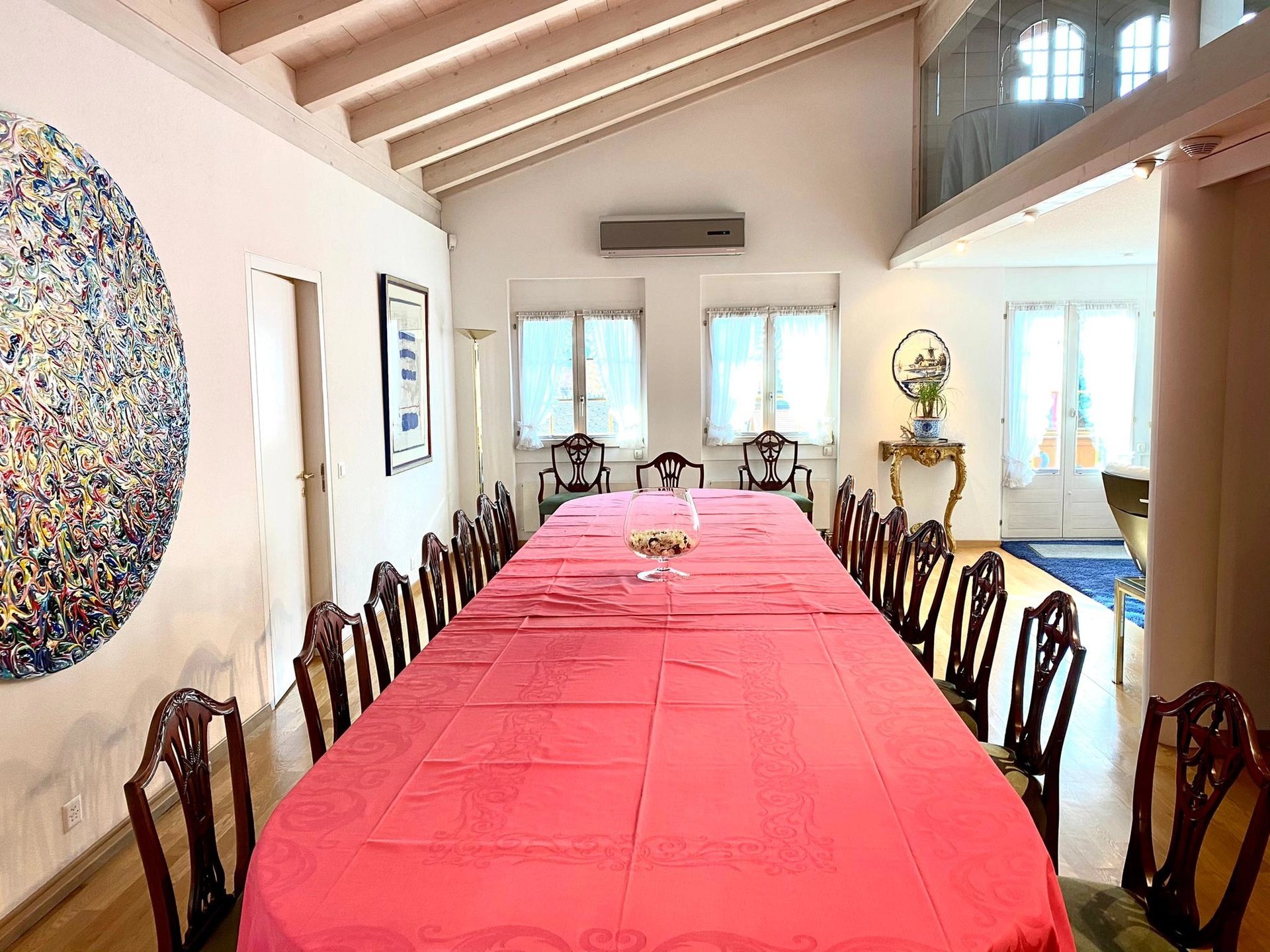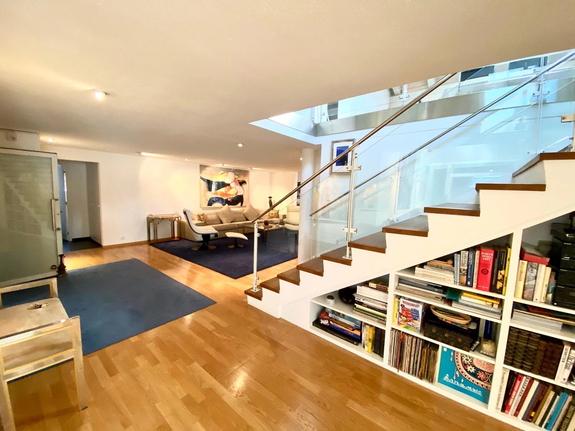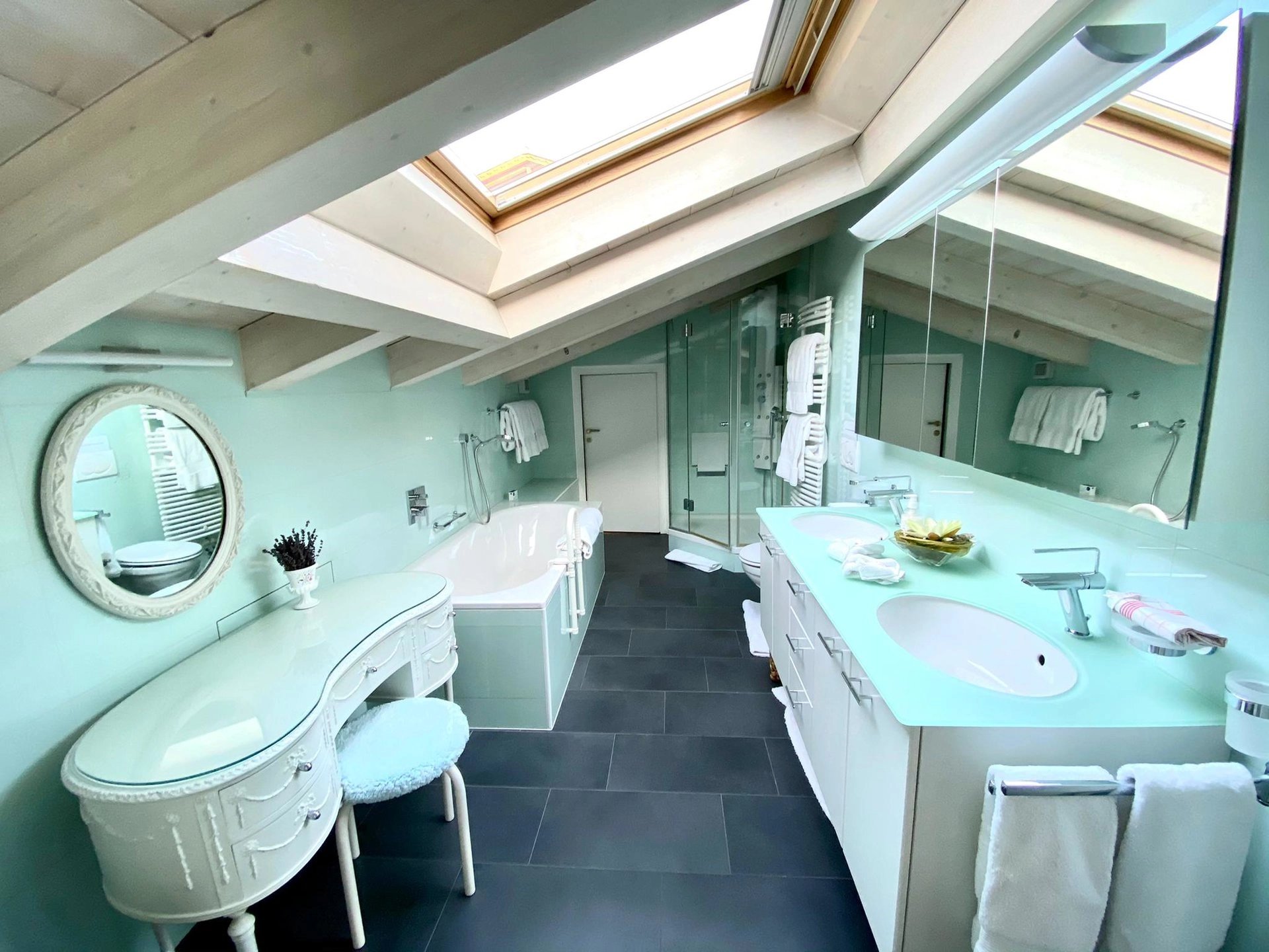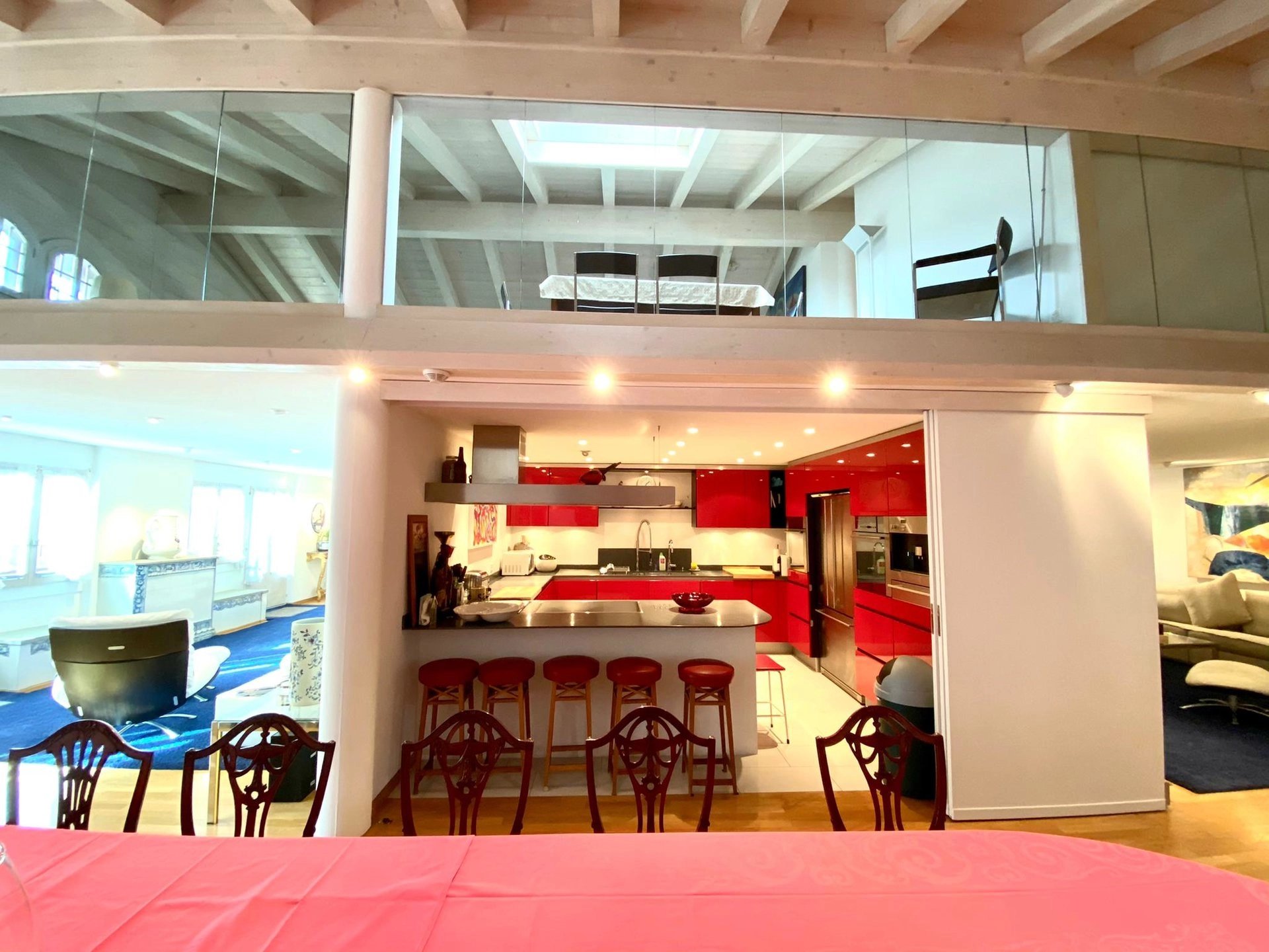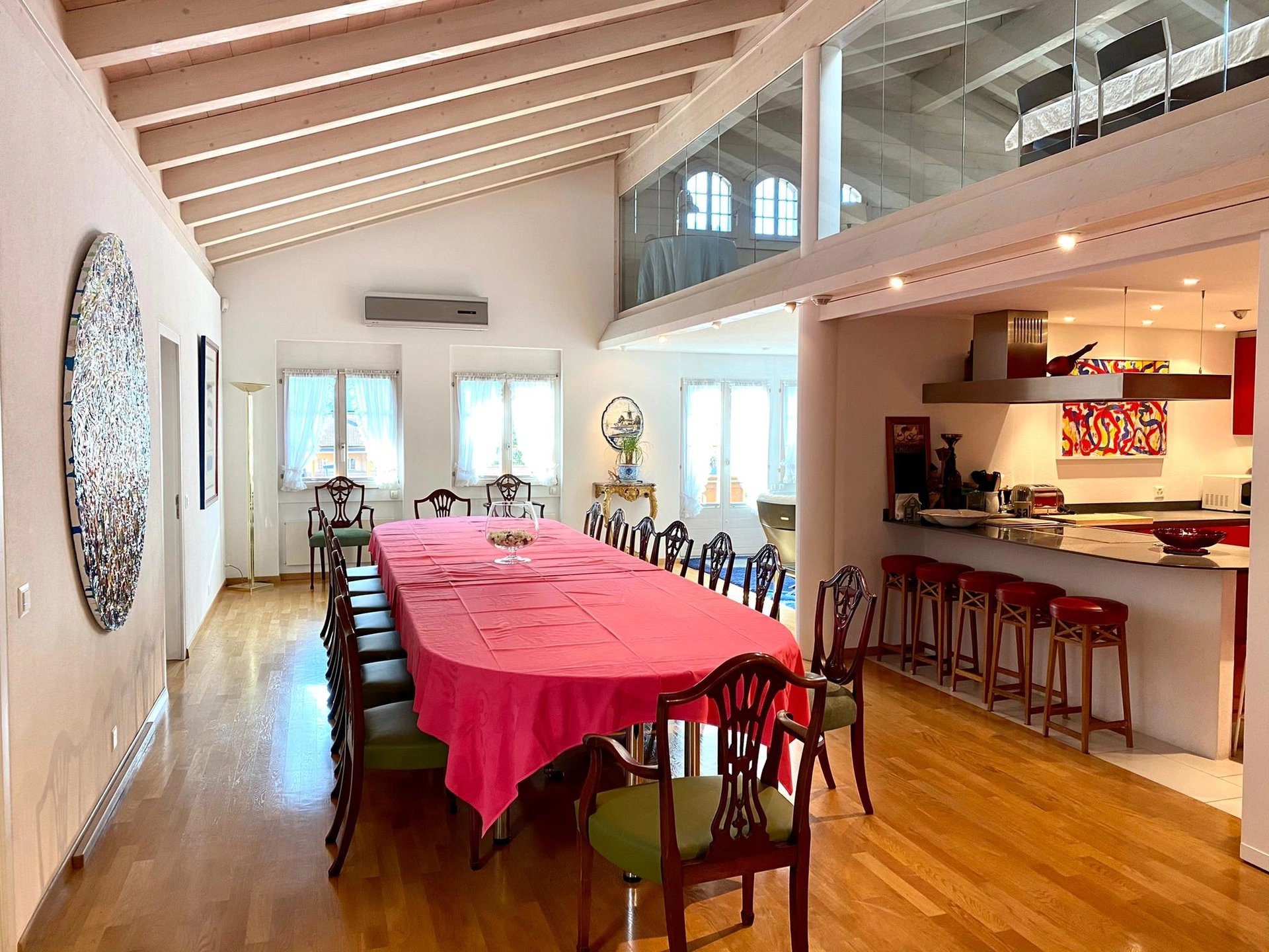 Very beautiful and spacious 7 bedrooms apartment with 5 bathrooms, located in the center of Gstaad, above the Migros supermarket. The apartment has a big entrance hall with 2 living/sitting rooms, a guest toilet, a very big dining room and a open kitchen and 5 bedrooms on one floor. On the second floor (attic) are 2 bedrooms 1 with en-suite bathroom, a big TV/sitting-room and a laundry room. A balcony and 4 parking spaces complete this property.