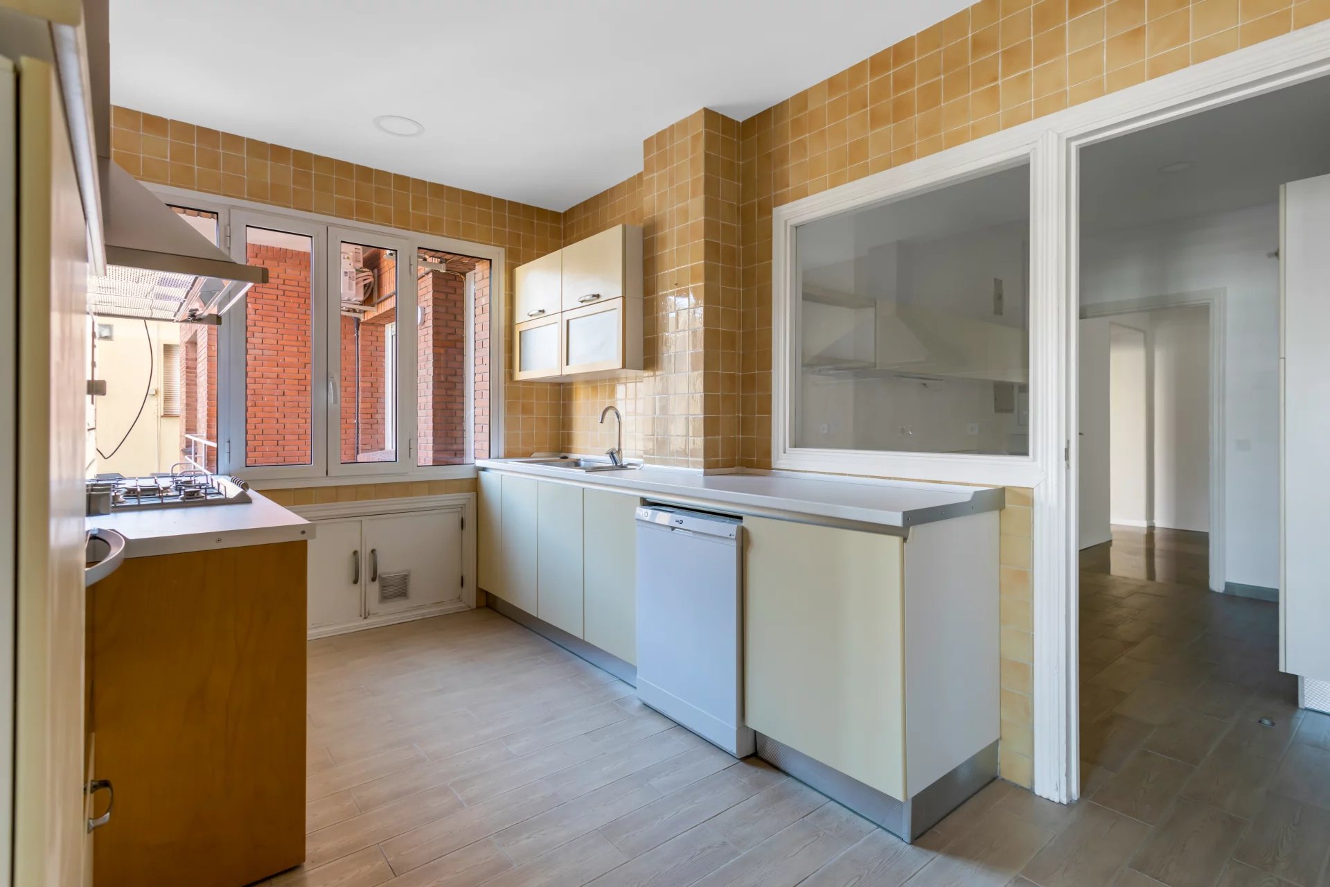 The kitchen, of ample proportions, includes an office area and separate laundry area, offering functionality without sacrificing aesthetics.