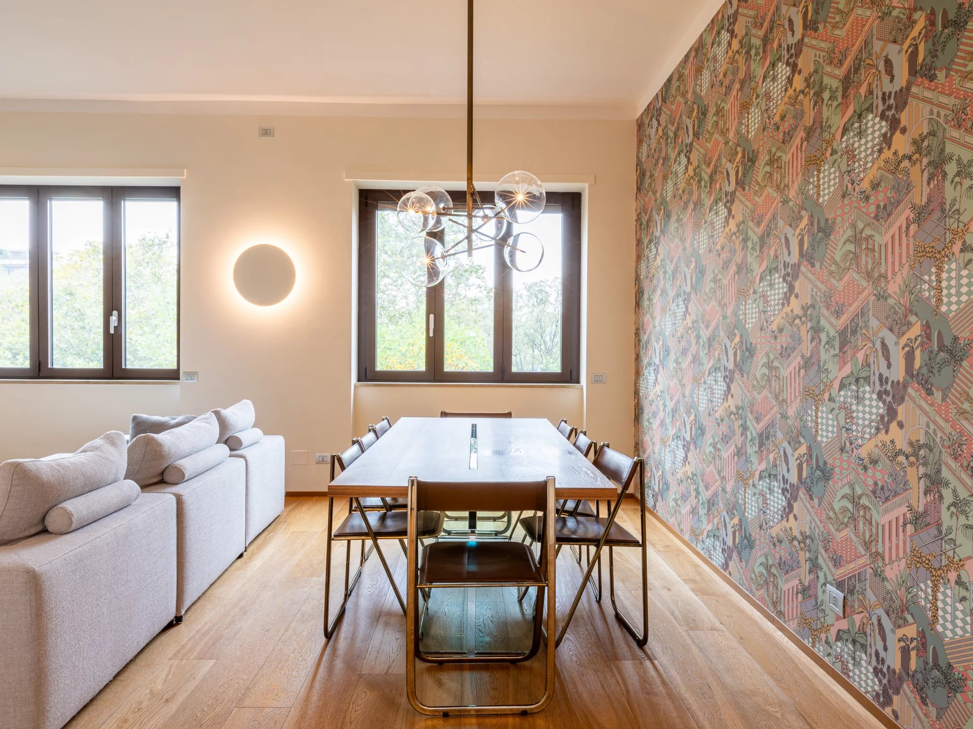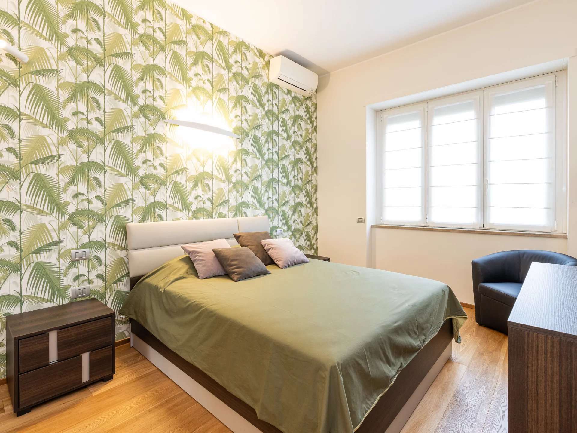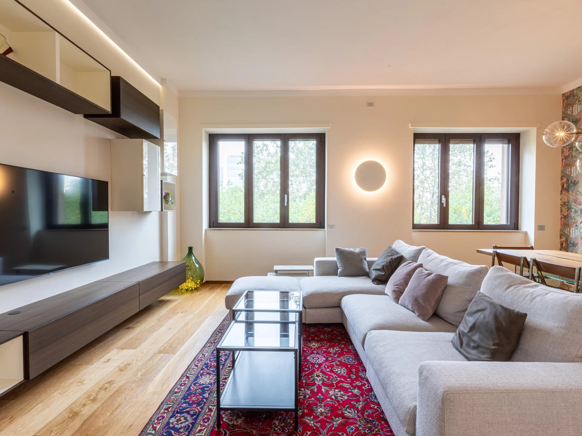 Elegant and charming apartment with splendid green views, bright and quiet, completely renovated and furnished with designer furniture, approx. 120 sqm composed of: entrance hall, double living room, eat-in kitchen with laundry room, two bedrooms, two bathrooms, storage closet, spacious balcony, cellar. Equipped with every comfort. Monthly rent €. 3,500.00. Class D.