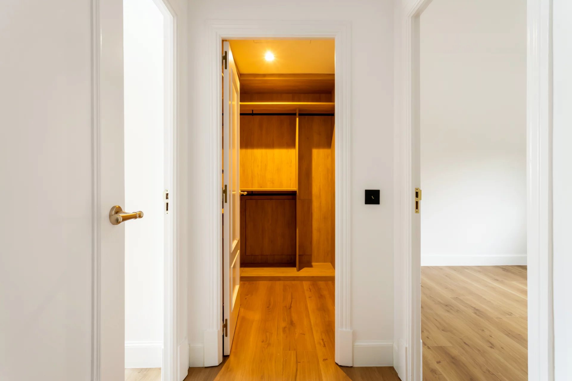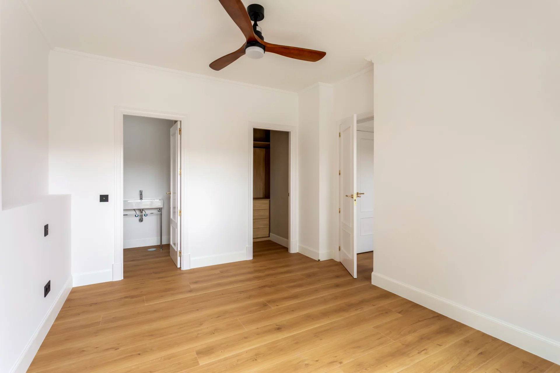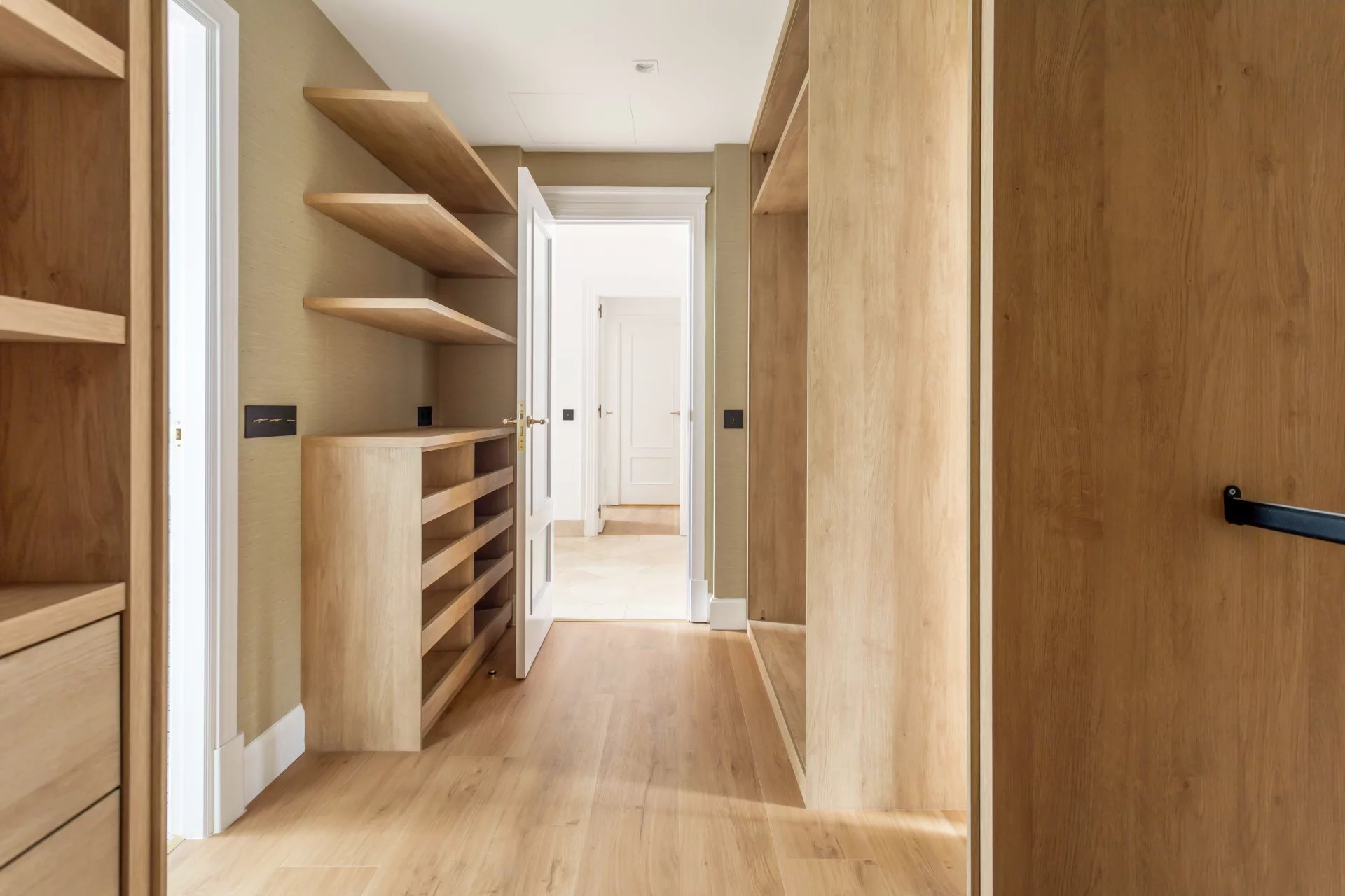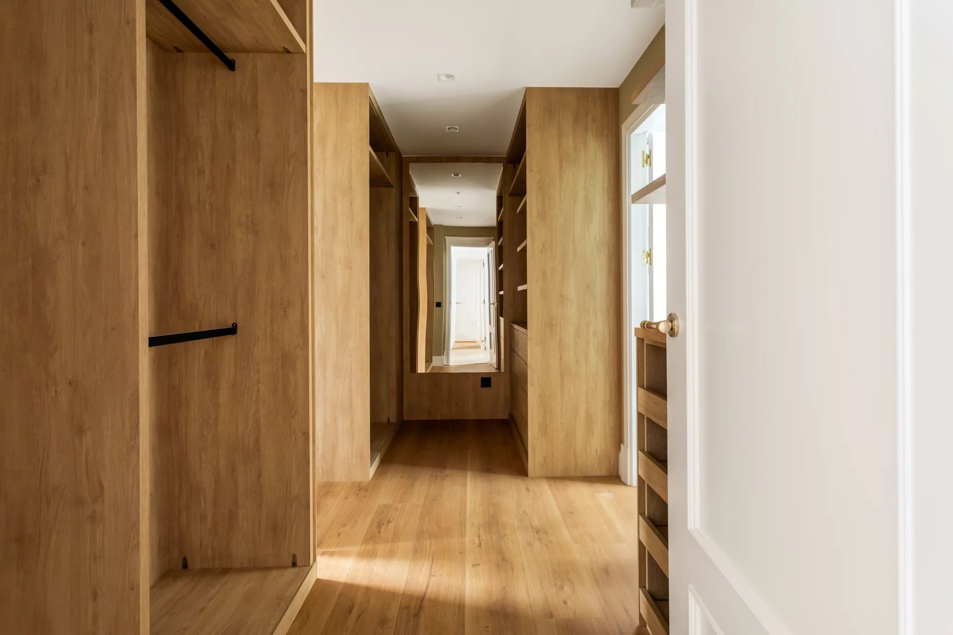 On the first floor, we have the master bedroom, with a large dressing room and en-suite bathroom with bathtub and shower. Another bedroom with a dressing room and en-suite bathroom complete this floor.