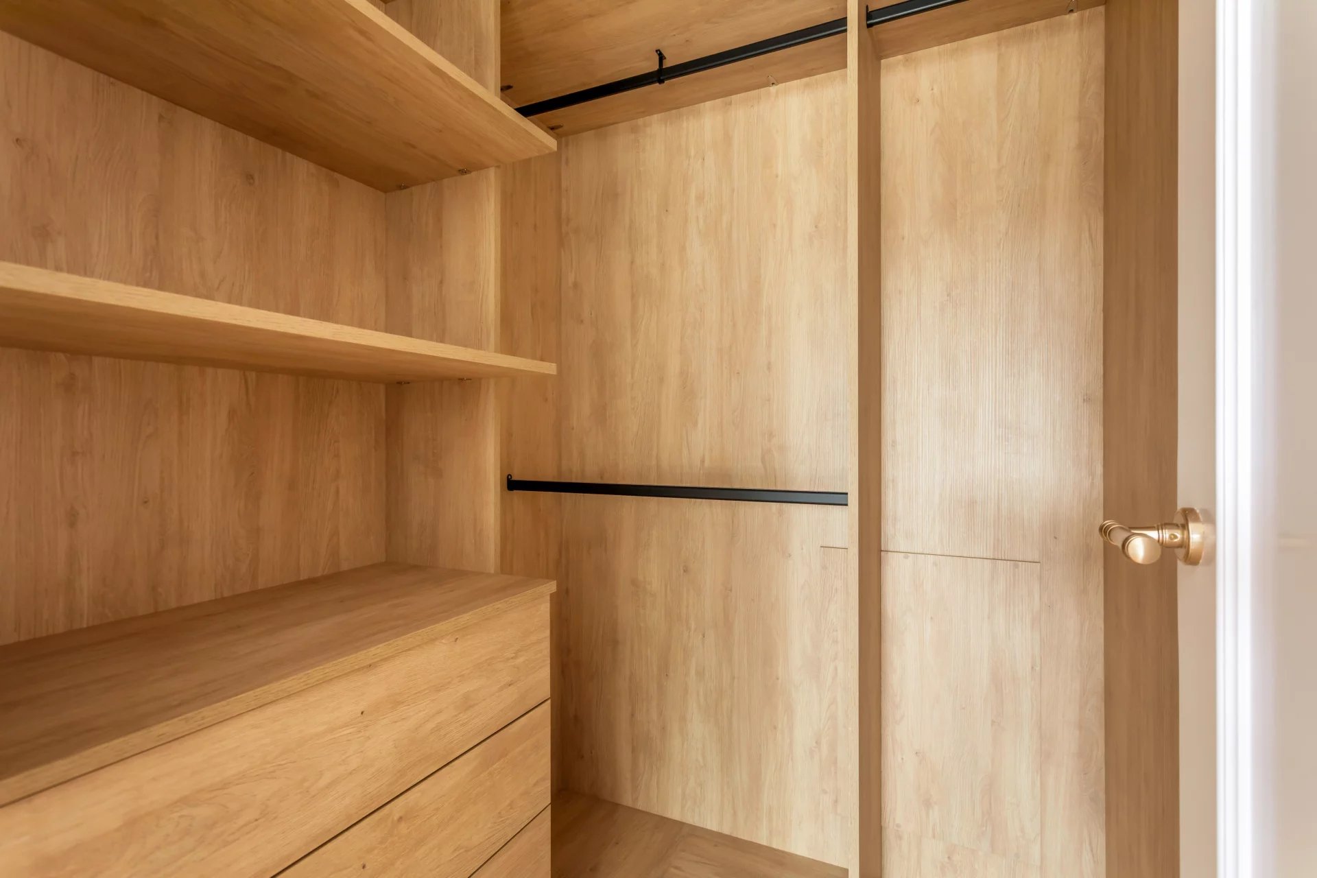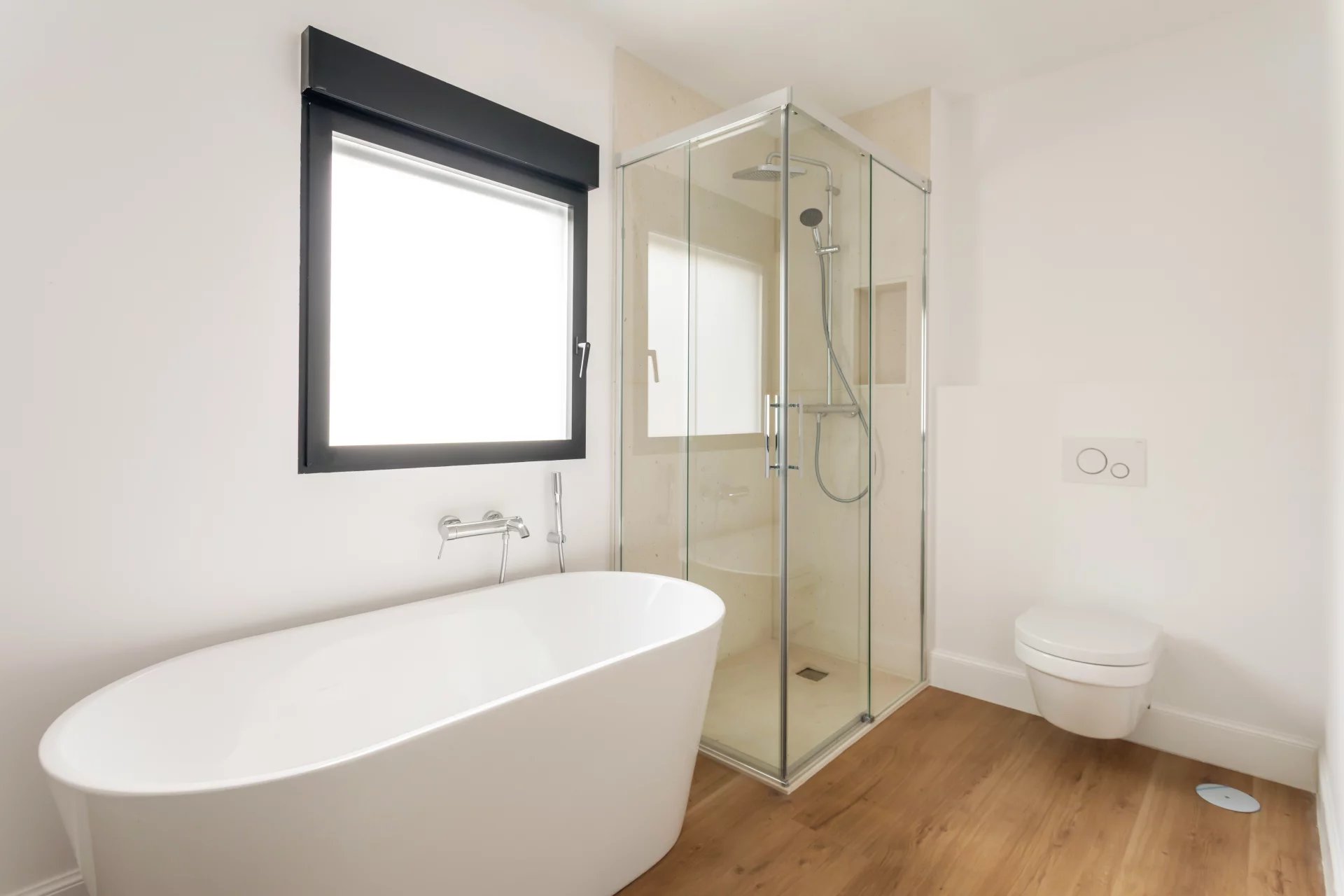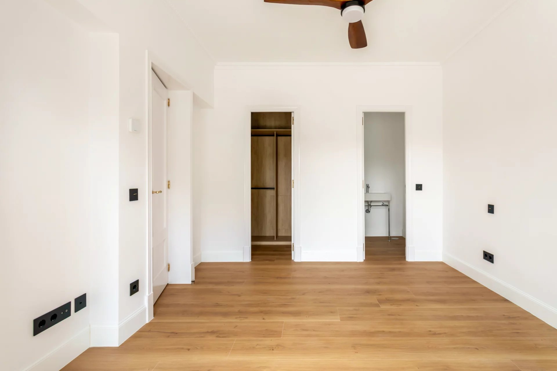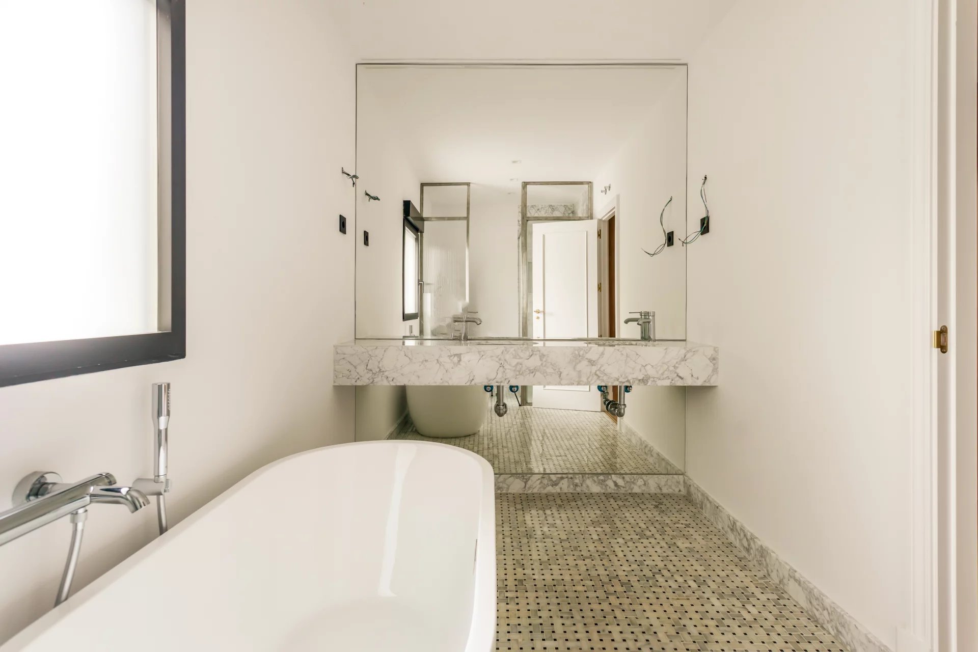 On the first floor, we have the master bedroom, with a large dressing room and en-suite bathroom with bathtub and shower. Another bedroom with a dressing room and en-suite bathroom complete this floor.