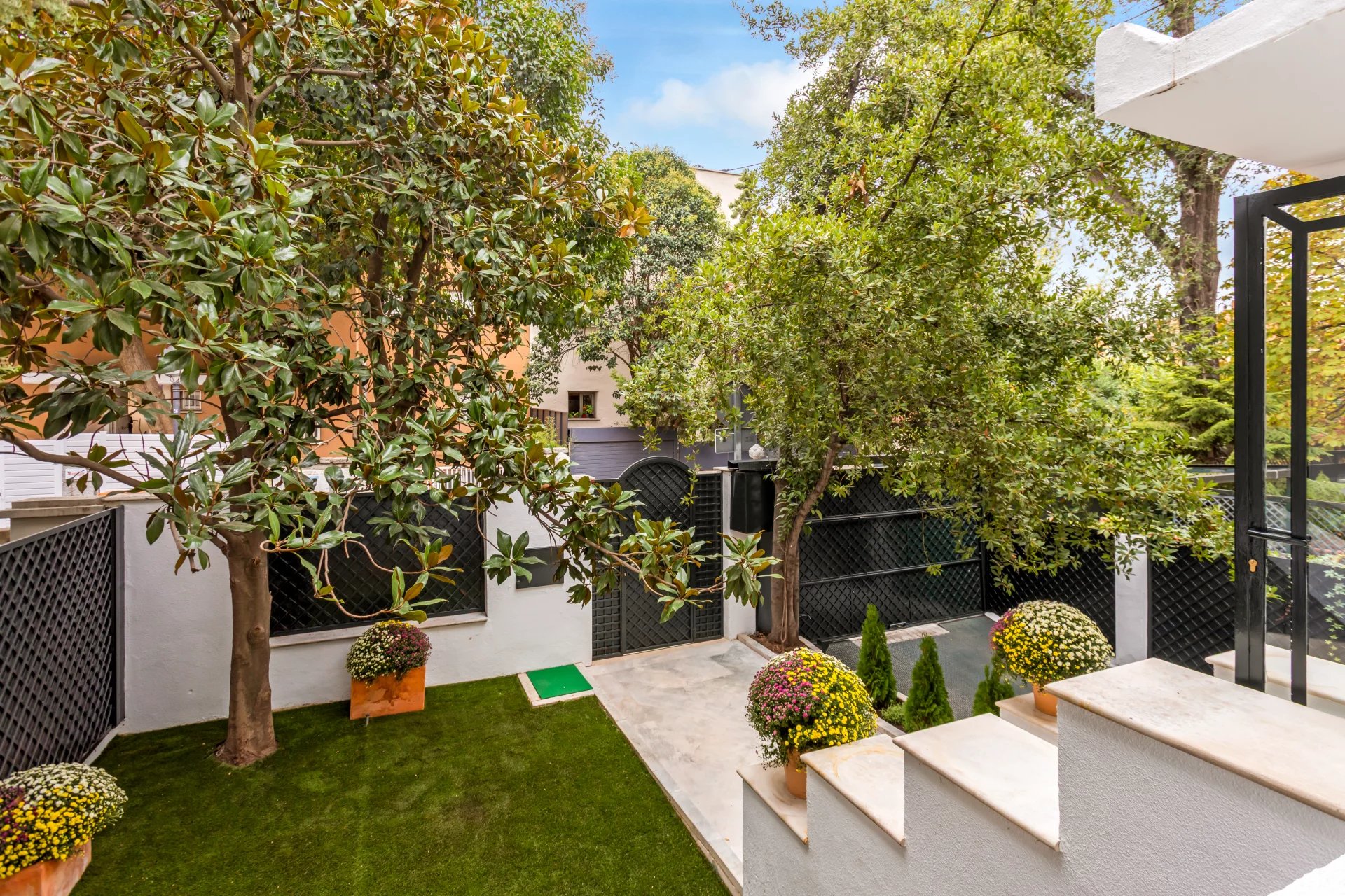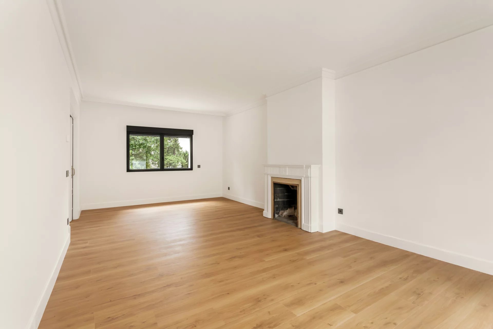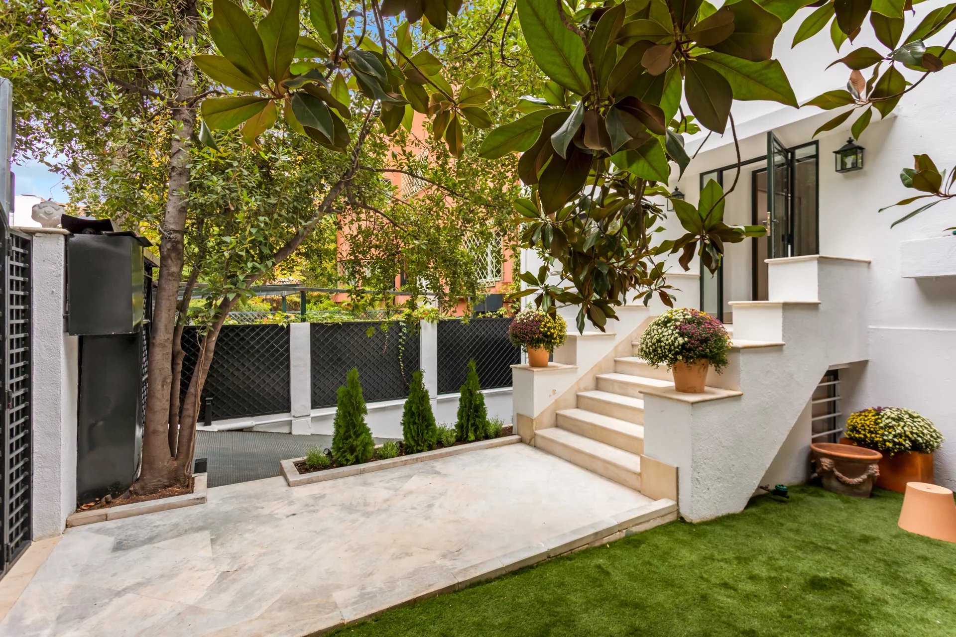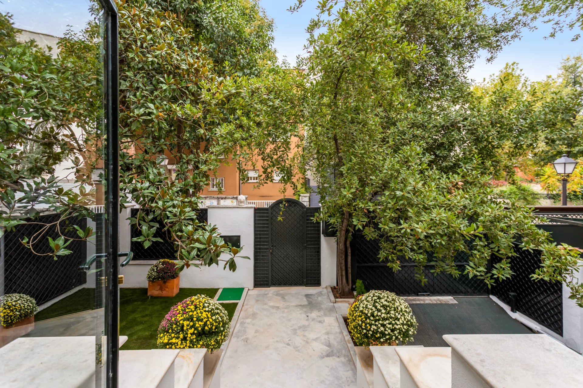 The main floor is entirely occupied by the reception area, with two spacious living rooms, one of which has a fireplace and access to a small terrace overlooking the rear garden.