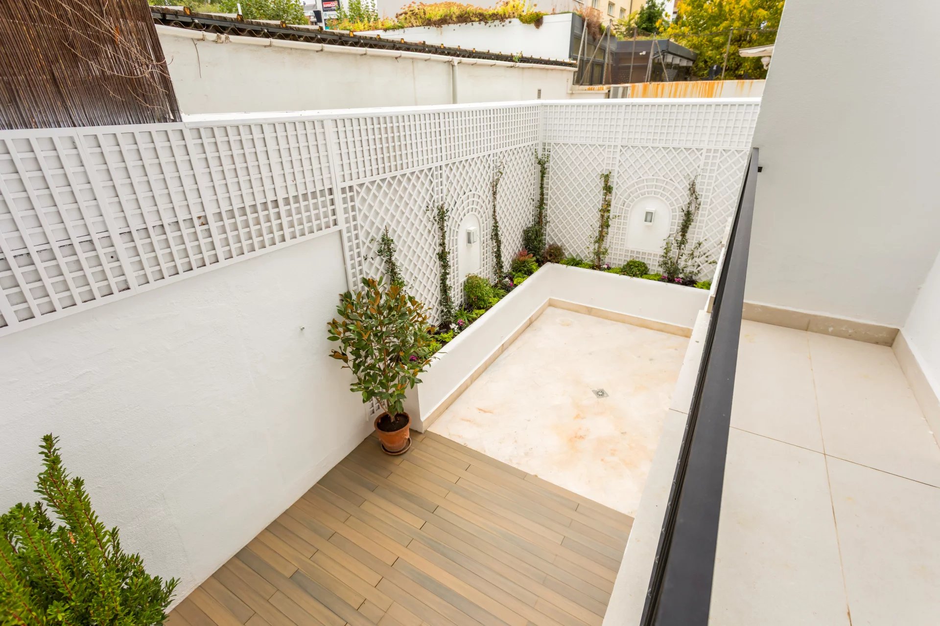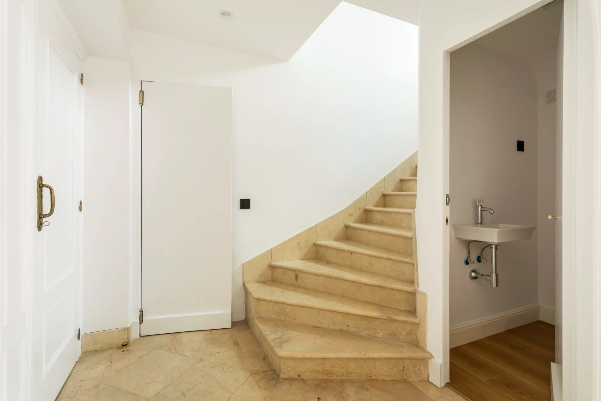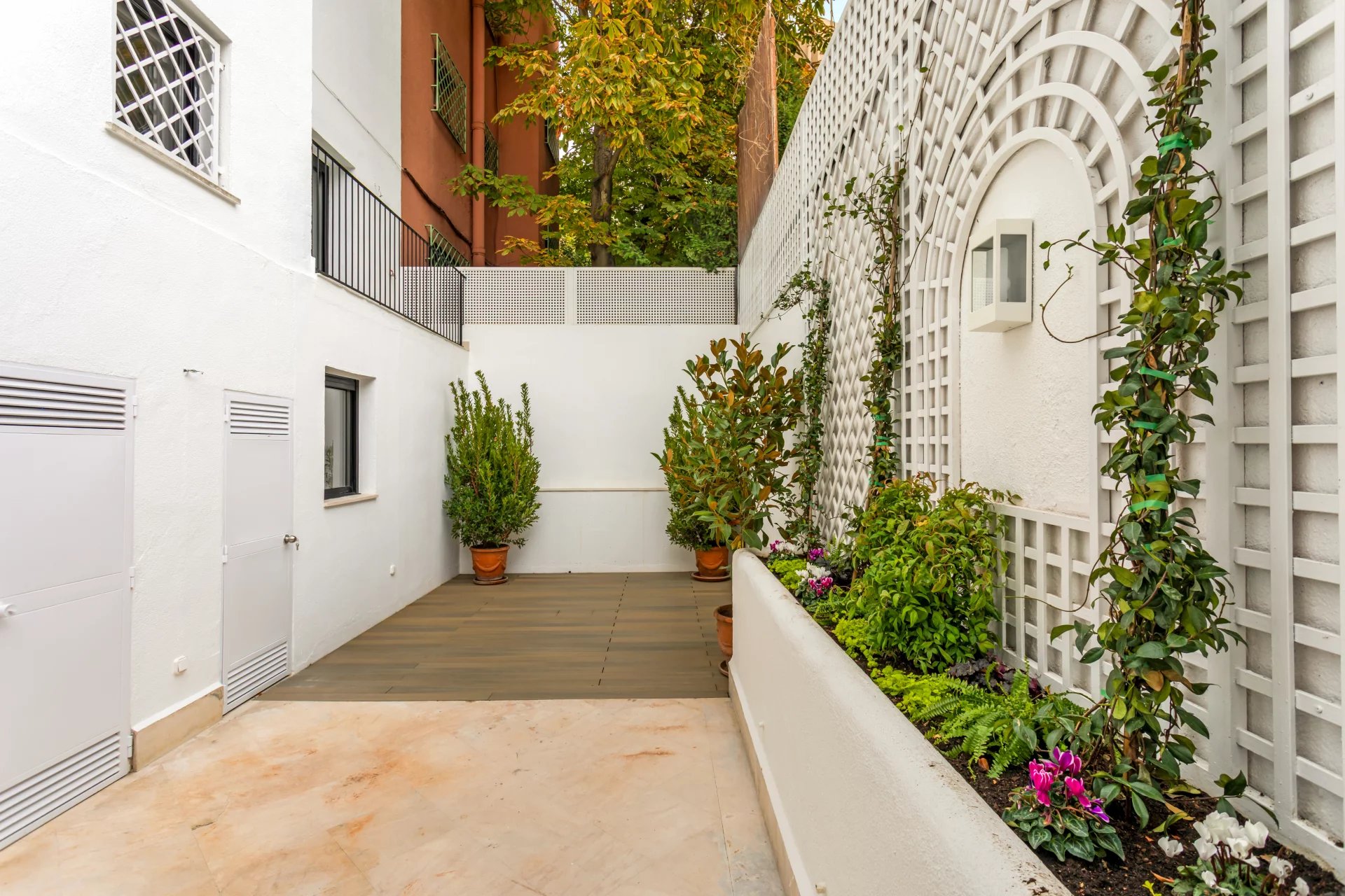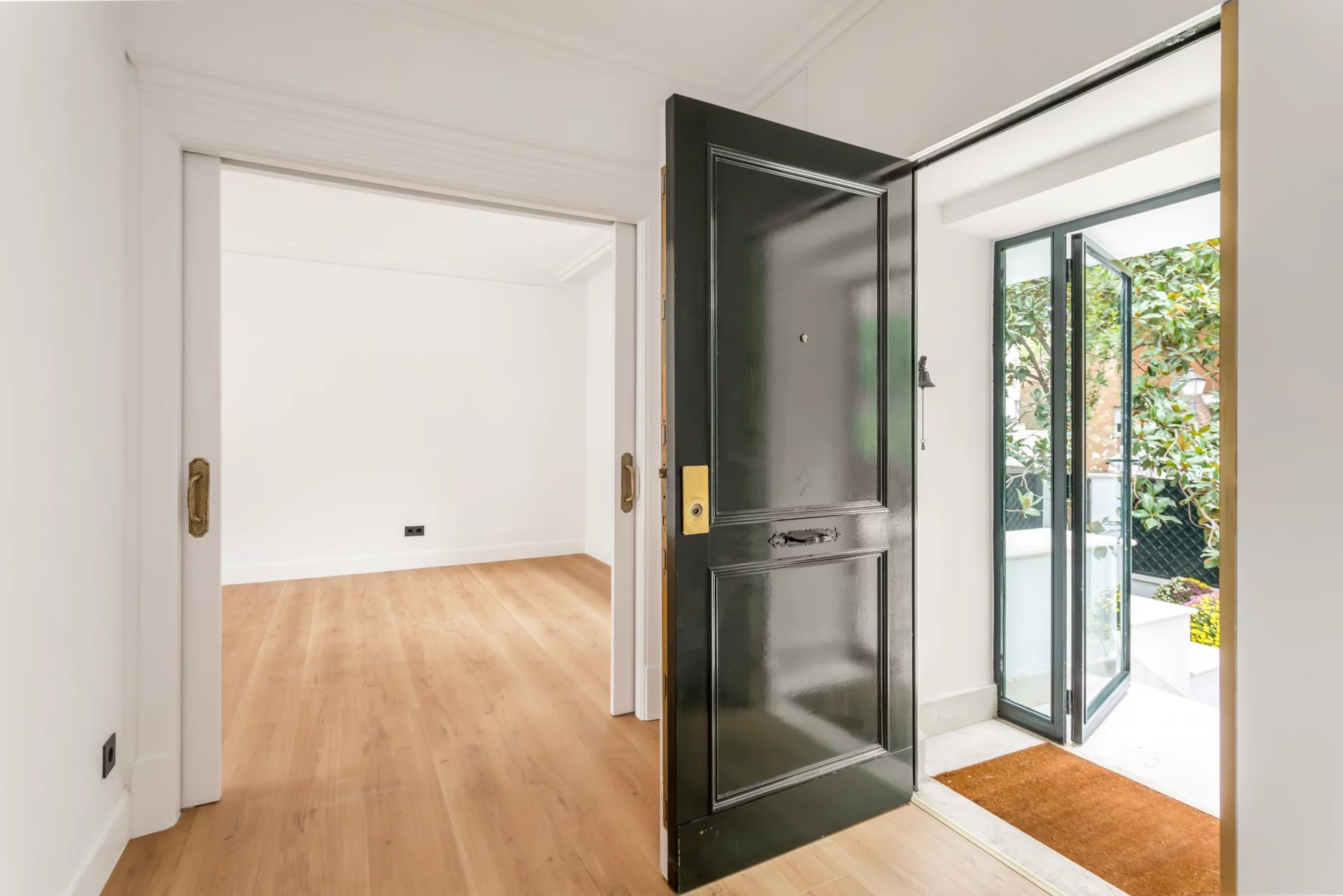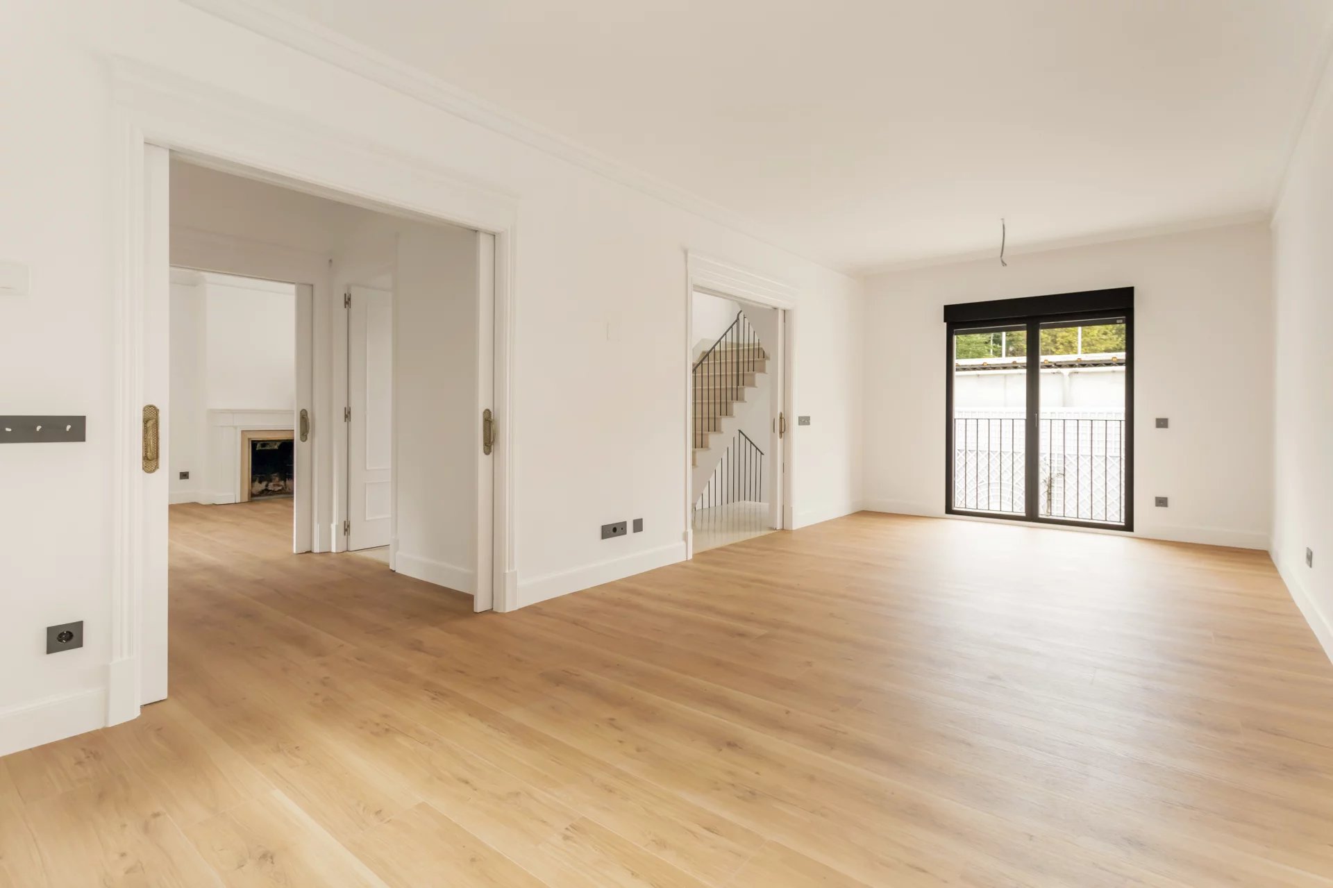 The main floor is entirely occupied by the reception area, with two spacious living rooms, one of which has a fireplace and access to a small terrace overlooking the rear garden.
