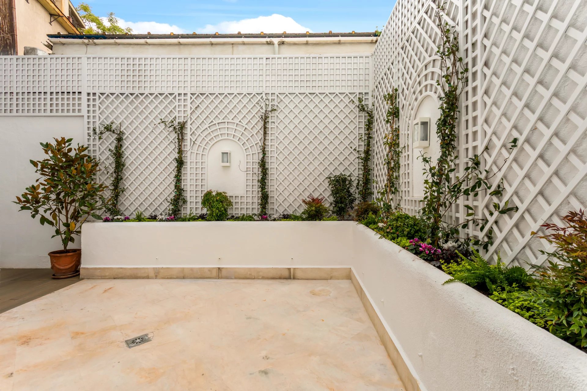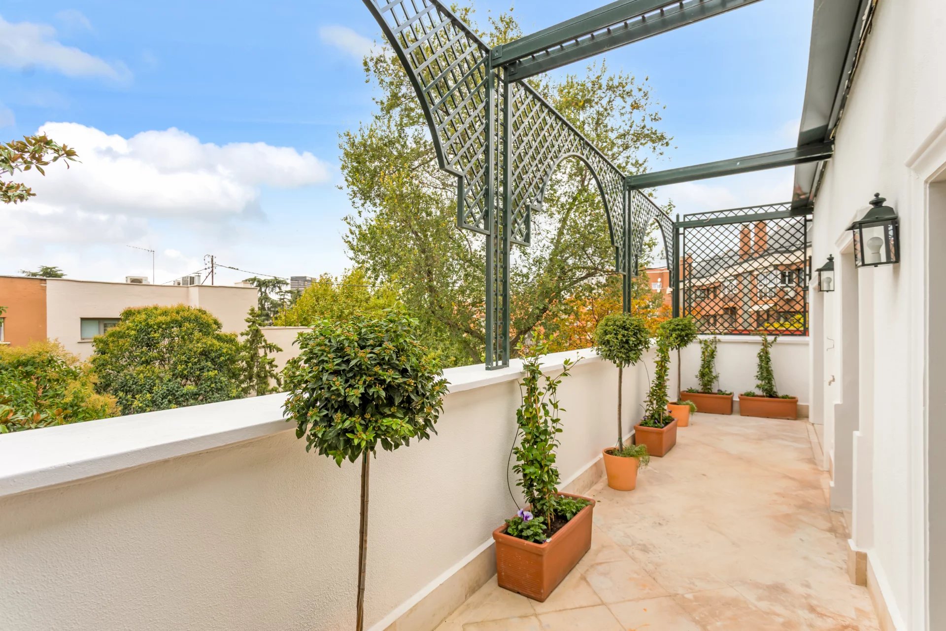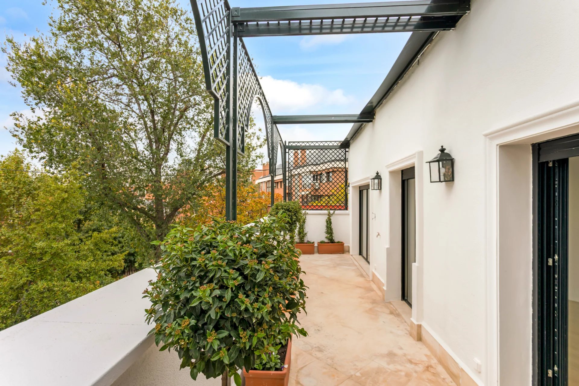On the top floor there are also two bright bedrooms, each with a dressing room and en-suite bathroom, and both with access to a large terrace overlooking the front garden.