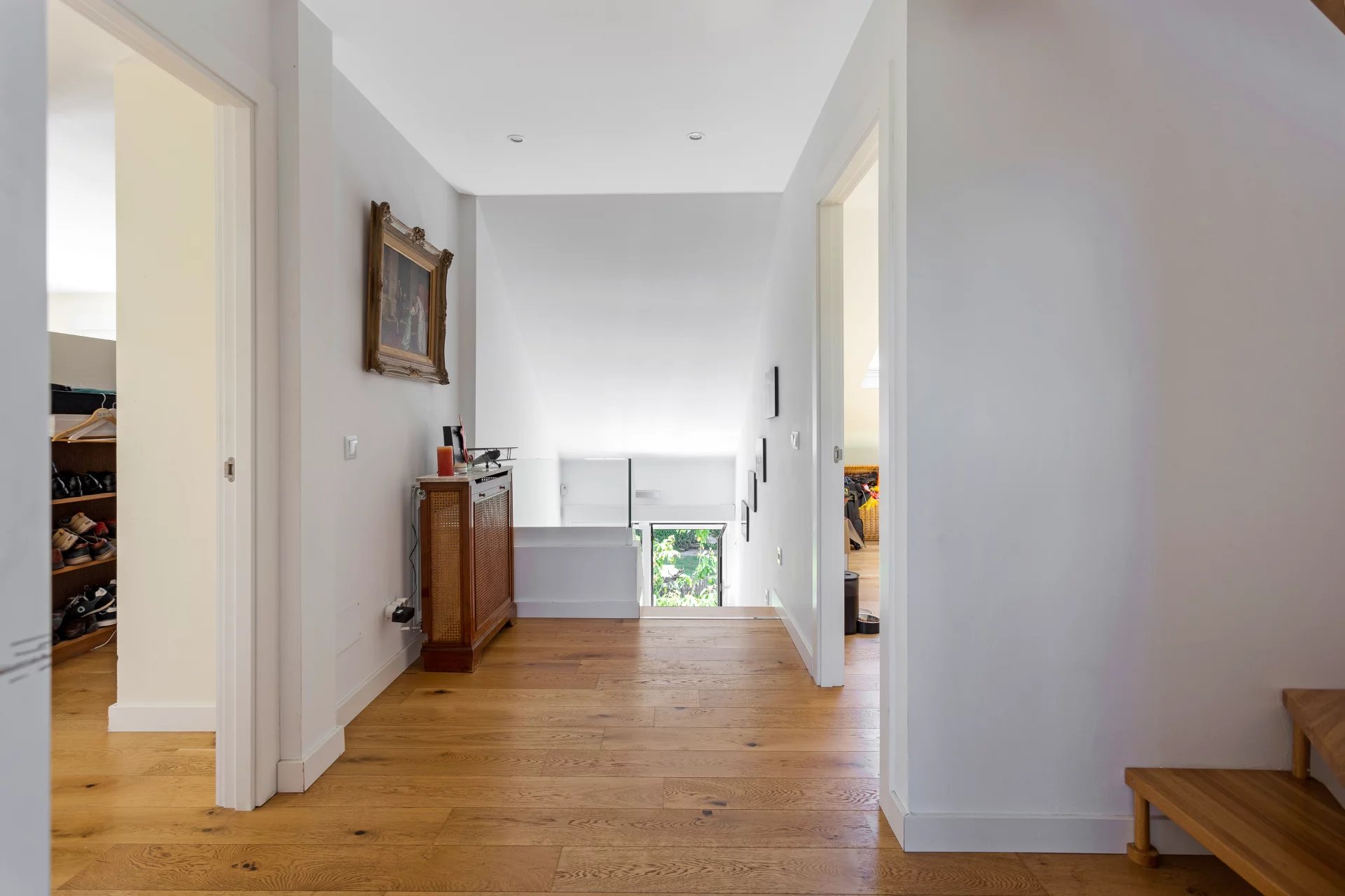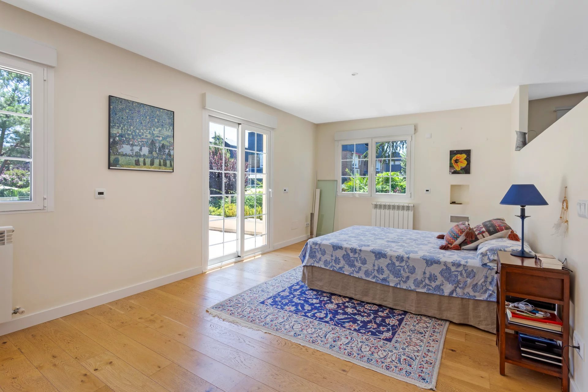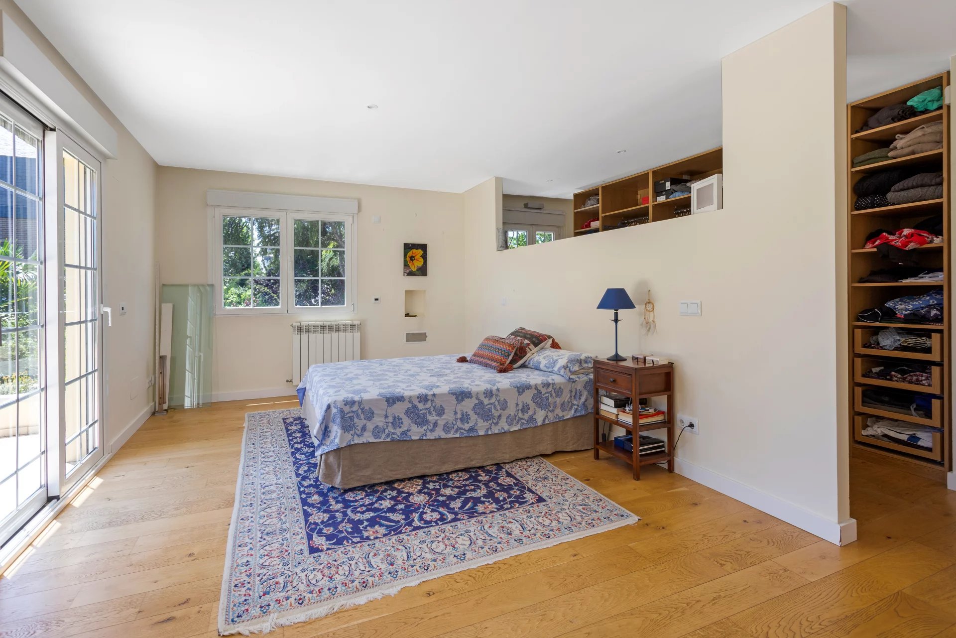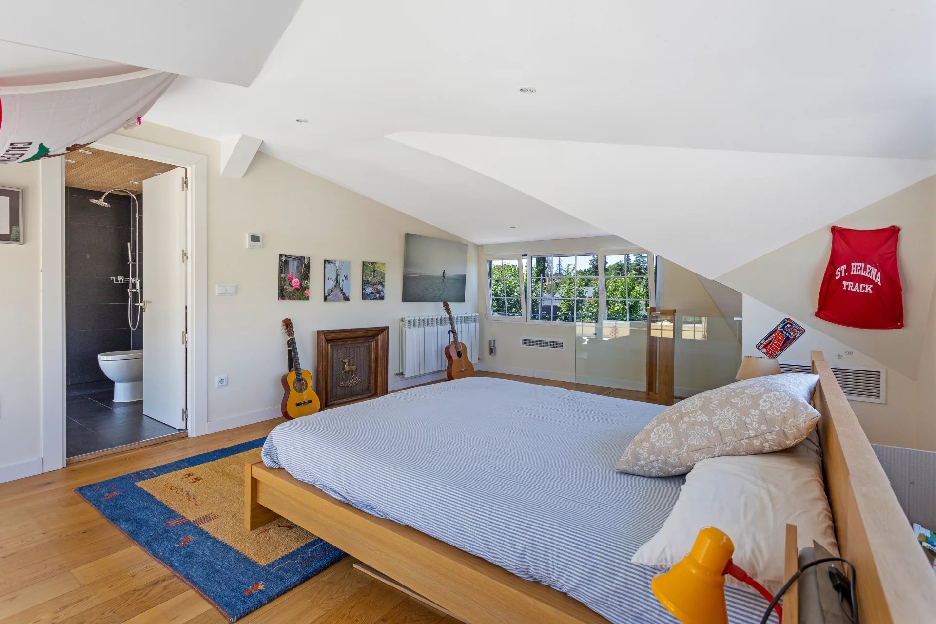On the second floor is a huge bedroom with en suite bathroom and terrace overlooking the garden and pool, and large window facing the skyline of Madrid.