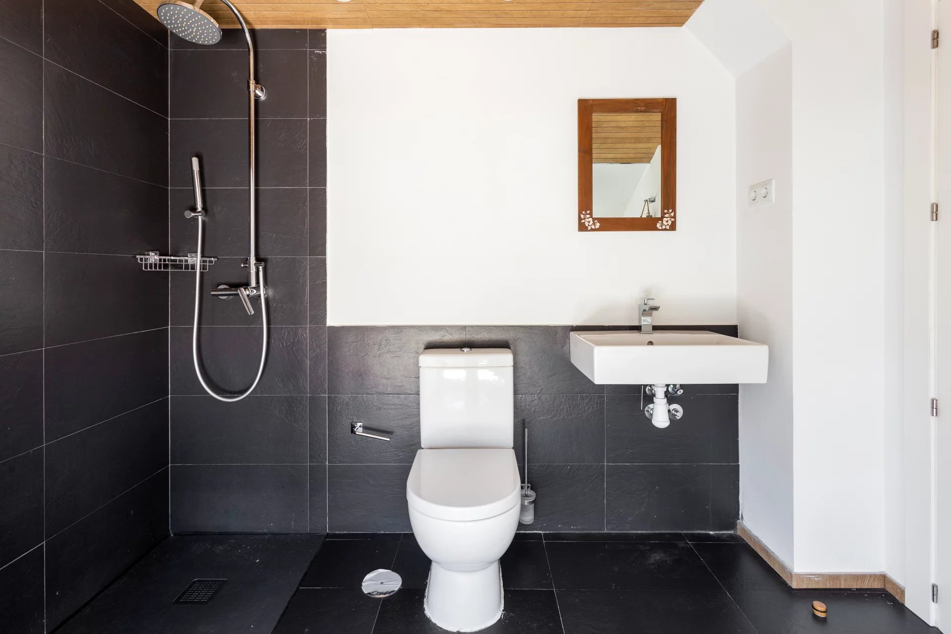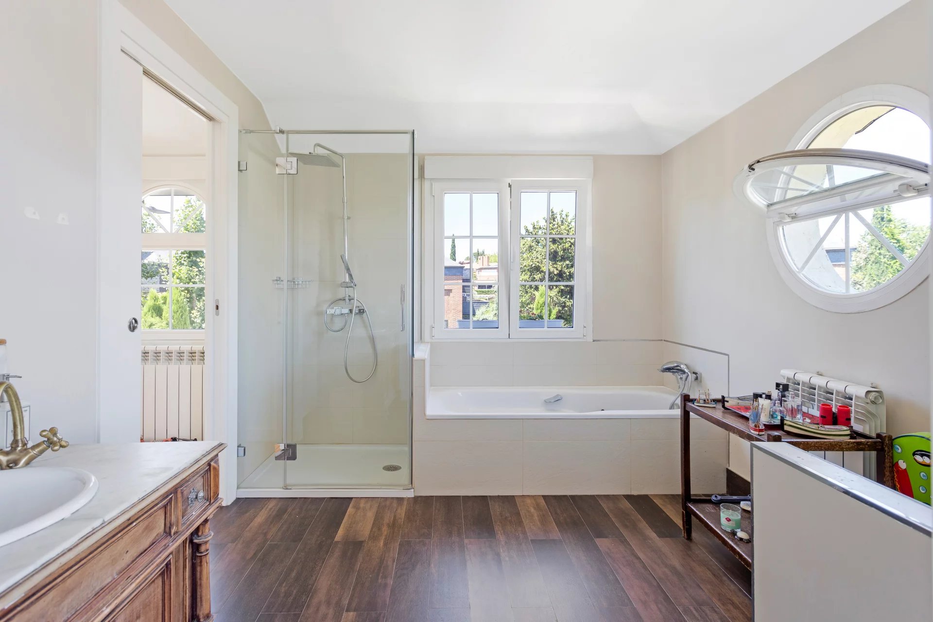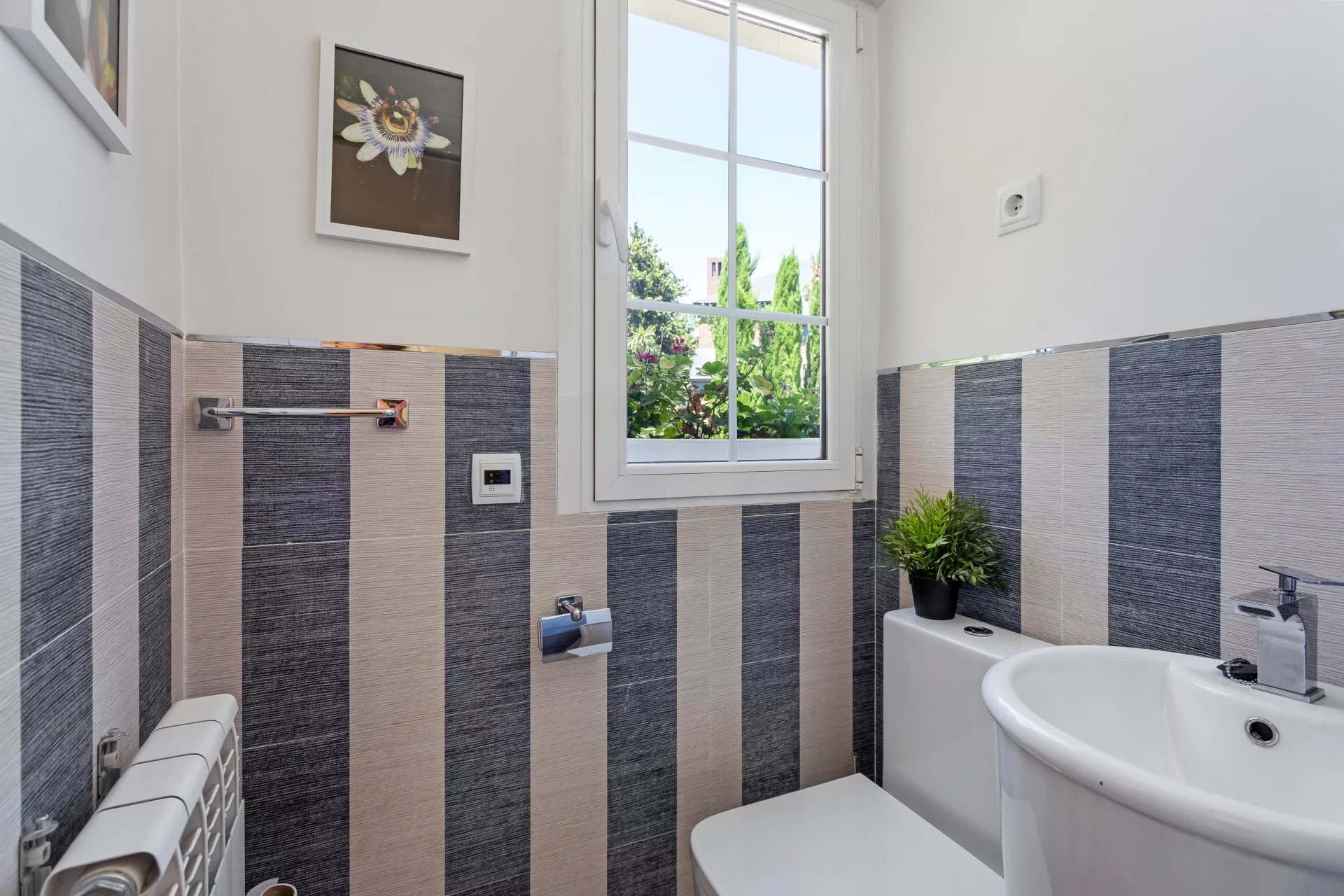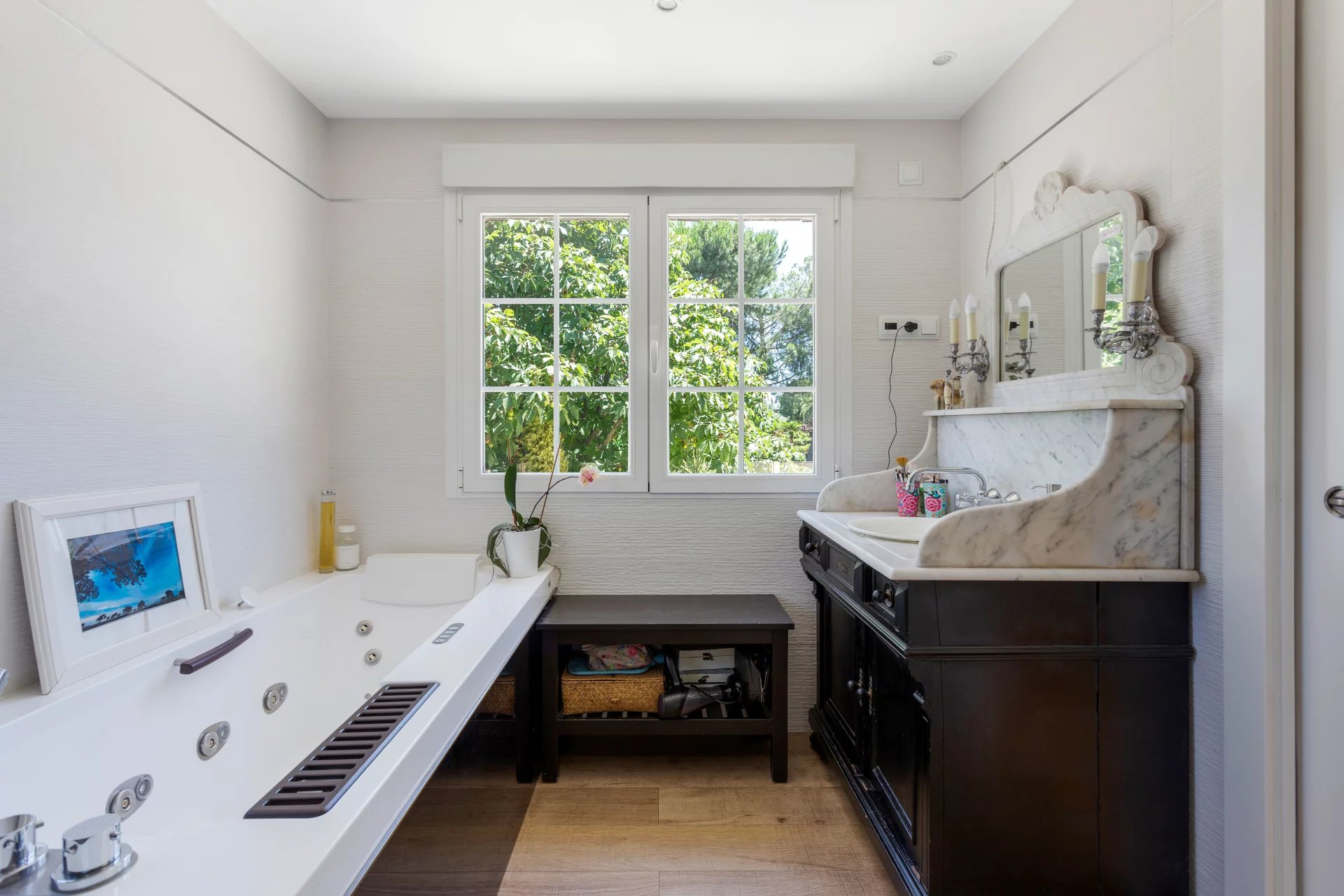 On the second floor, the master bedroom with en suite bathroom, dressing room, and huge terrace overlooking the garden and pool. In the bathroom, jacuzzi style bathtub, and steam cabin. Two additional bedrooms with shared bathroom.