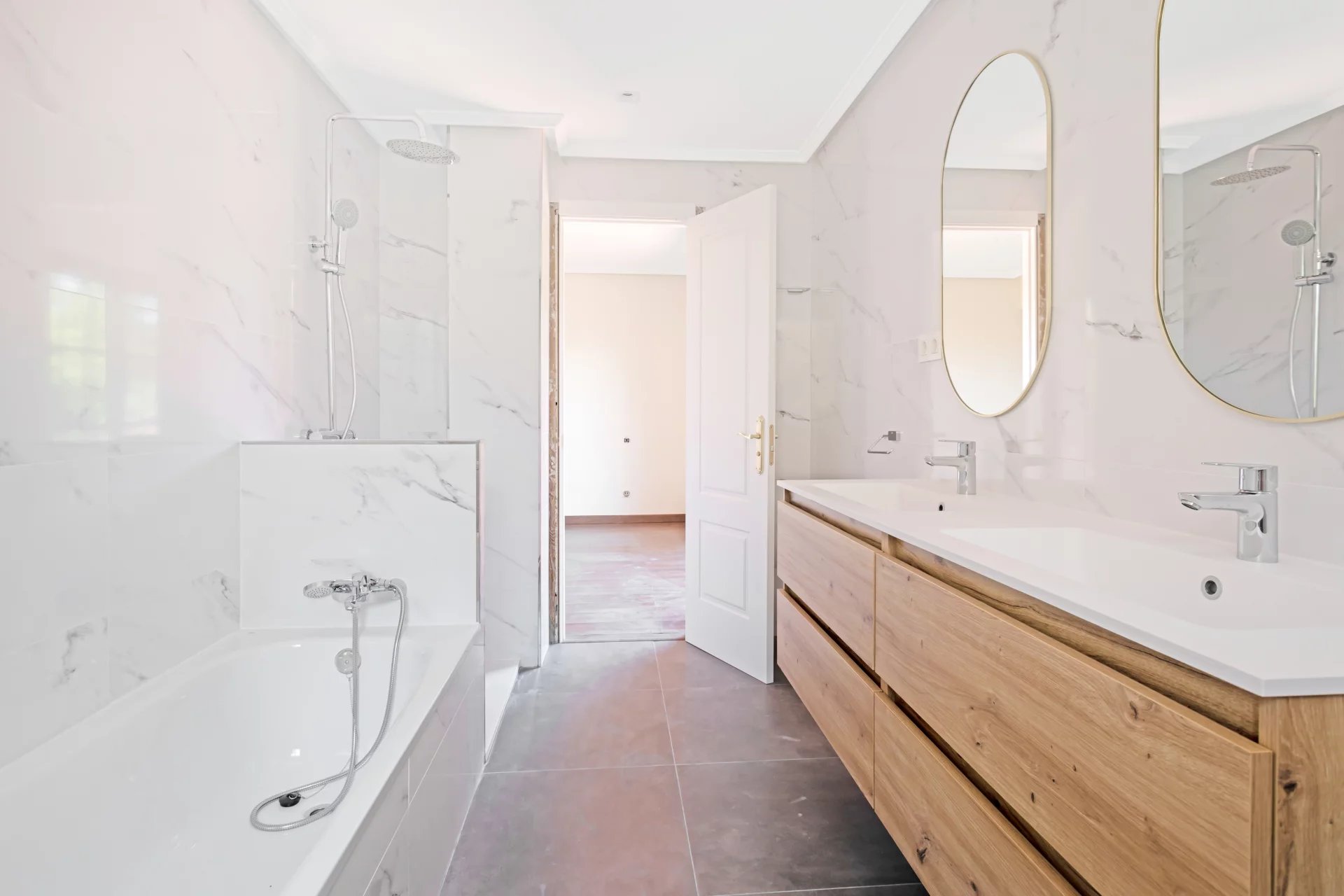 On the main floor, entrance hall, guest toilet, two living rooms, a dining room with fireplace and kitchen with new generation appliances. In addition, a porch with easy access from the kitchen.