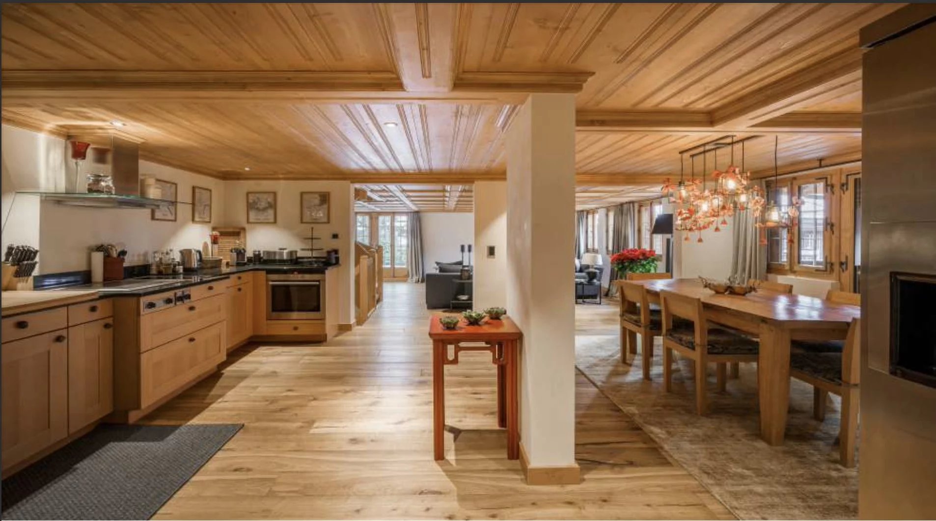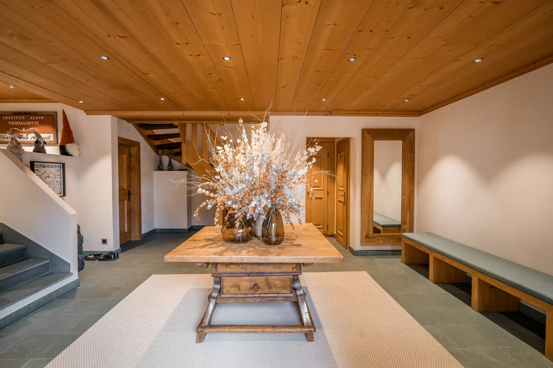 The ground floor opens onto a large entrance hall with a cloakroom, a ski room / storage space, a TV room and a guest WC.