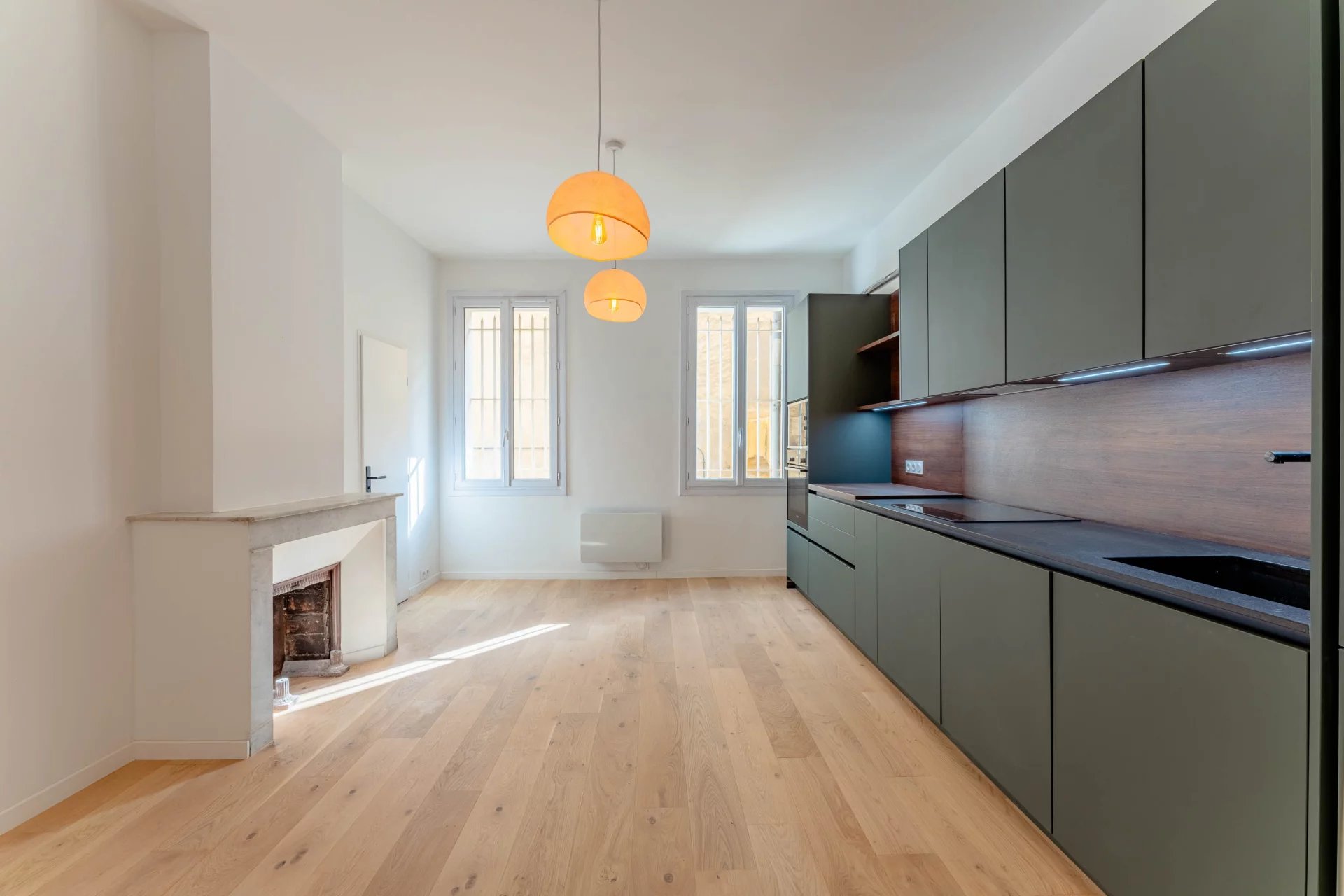 From the entrance, you'll be seduced by the harmony of the whole, with a superb green marble mantelpiece that inspired the design.