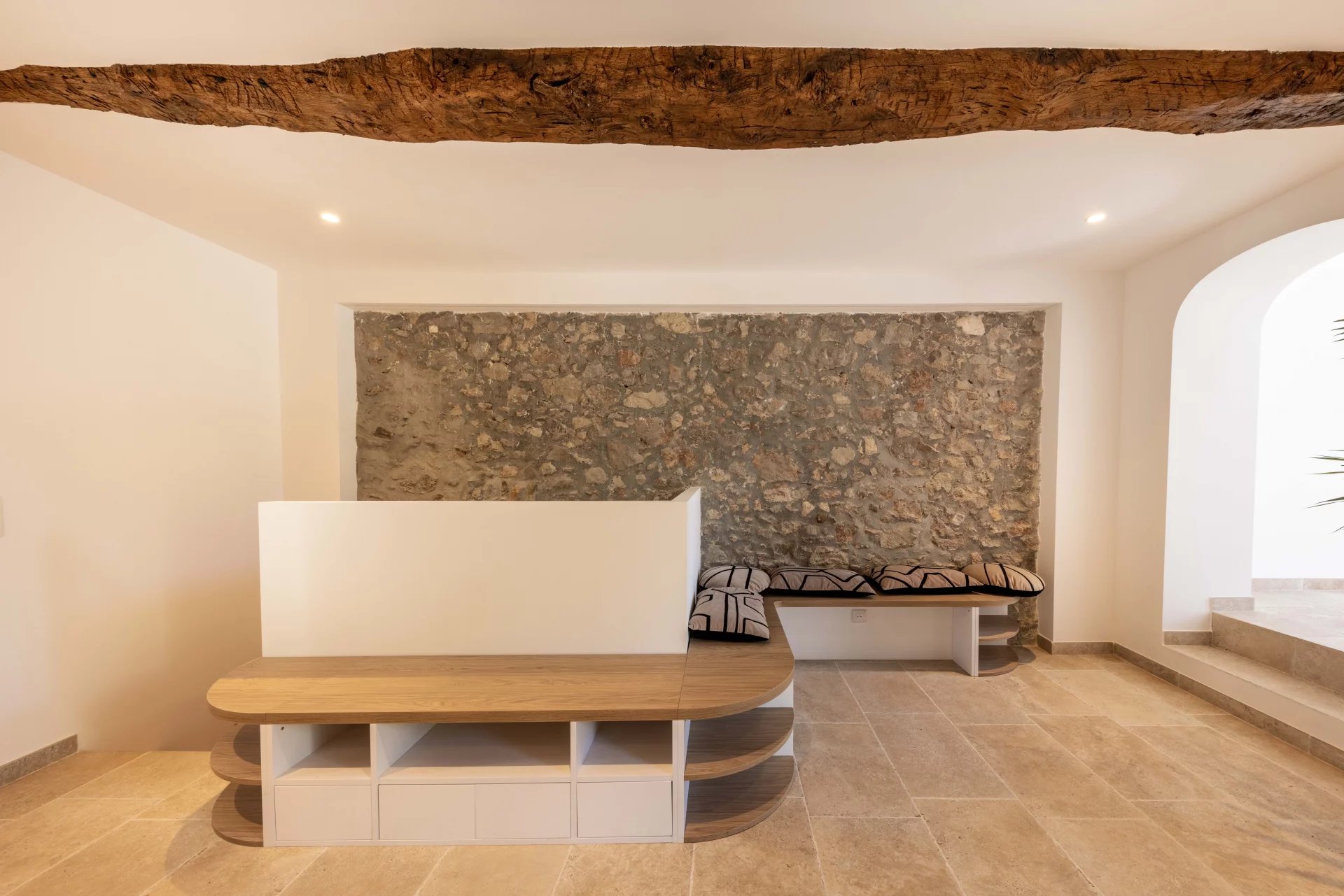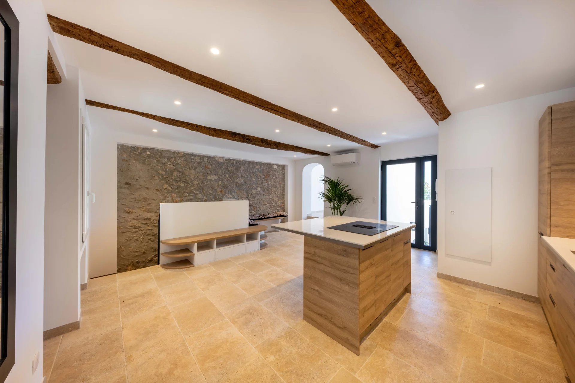 Entrance into a spacious living room with open-plan kitchen, dining room, bedroom with shower room, outside access to the private landscaped garden planted with fruit trees.