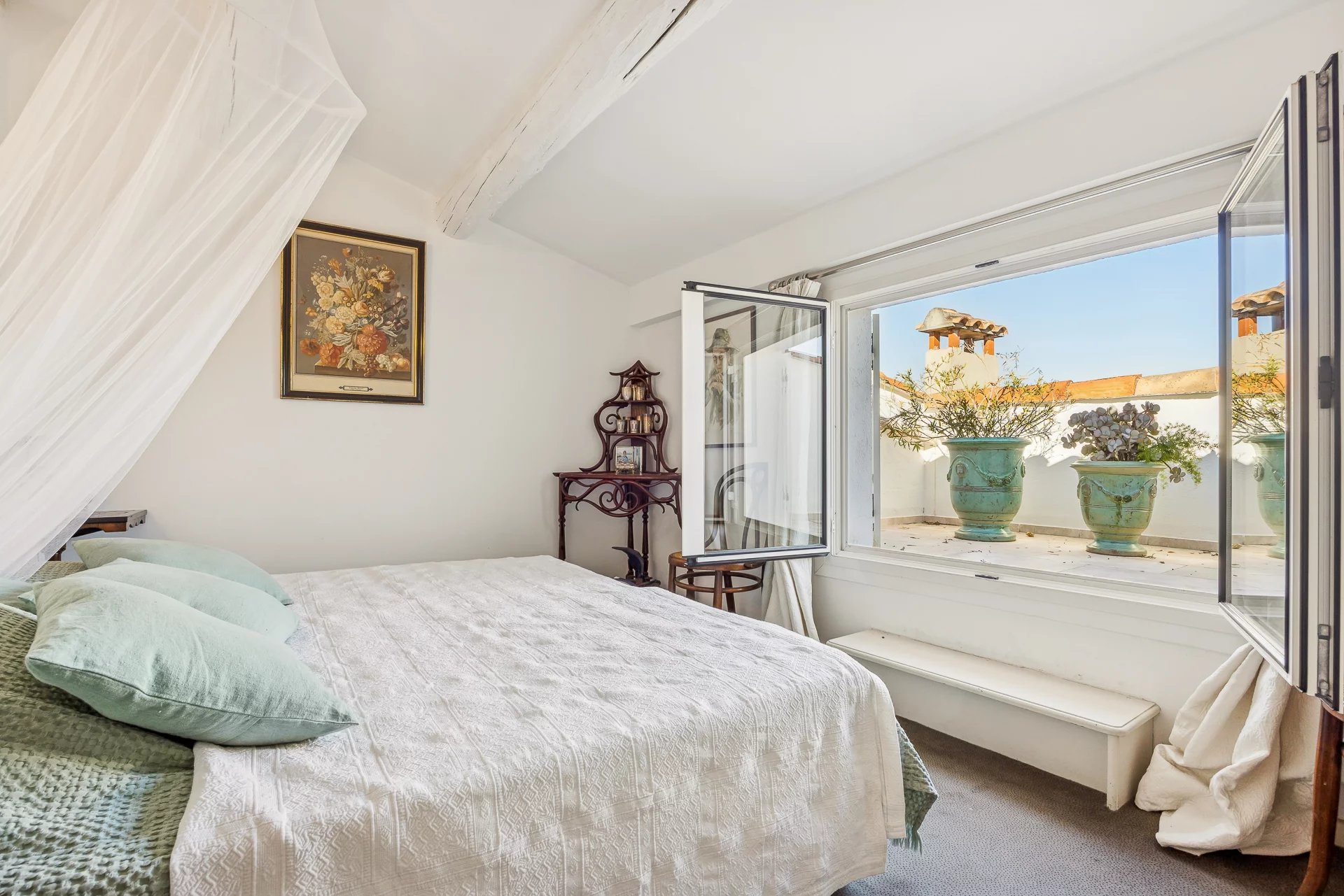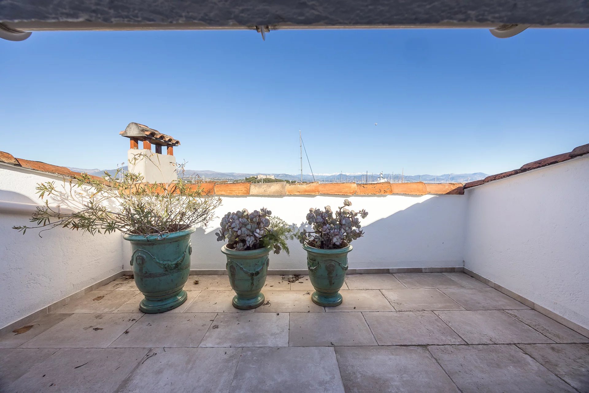 Nestled on the third and top floor of a charming small building, it offers over 100 m² of living space and opens onto 75 m² of terraces with absolutely exceptional views of the ramparts, the mountains, Fort Carré, and the Ferris wheel.
