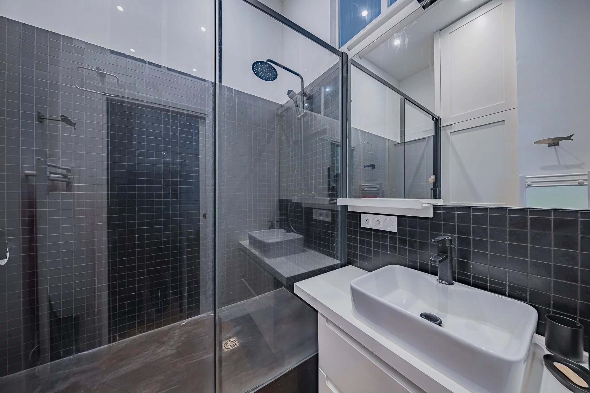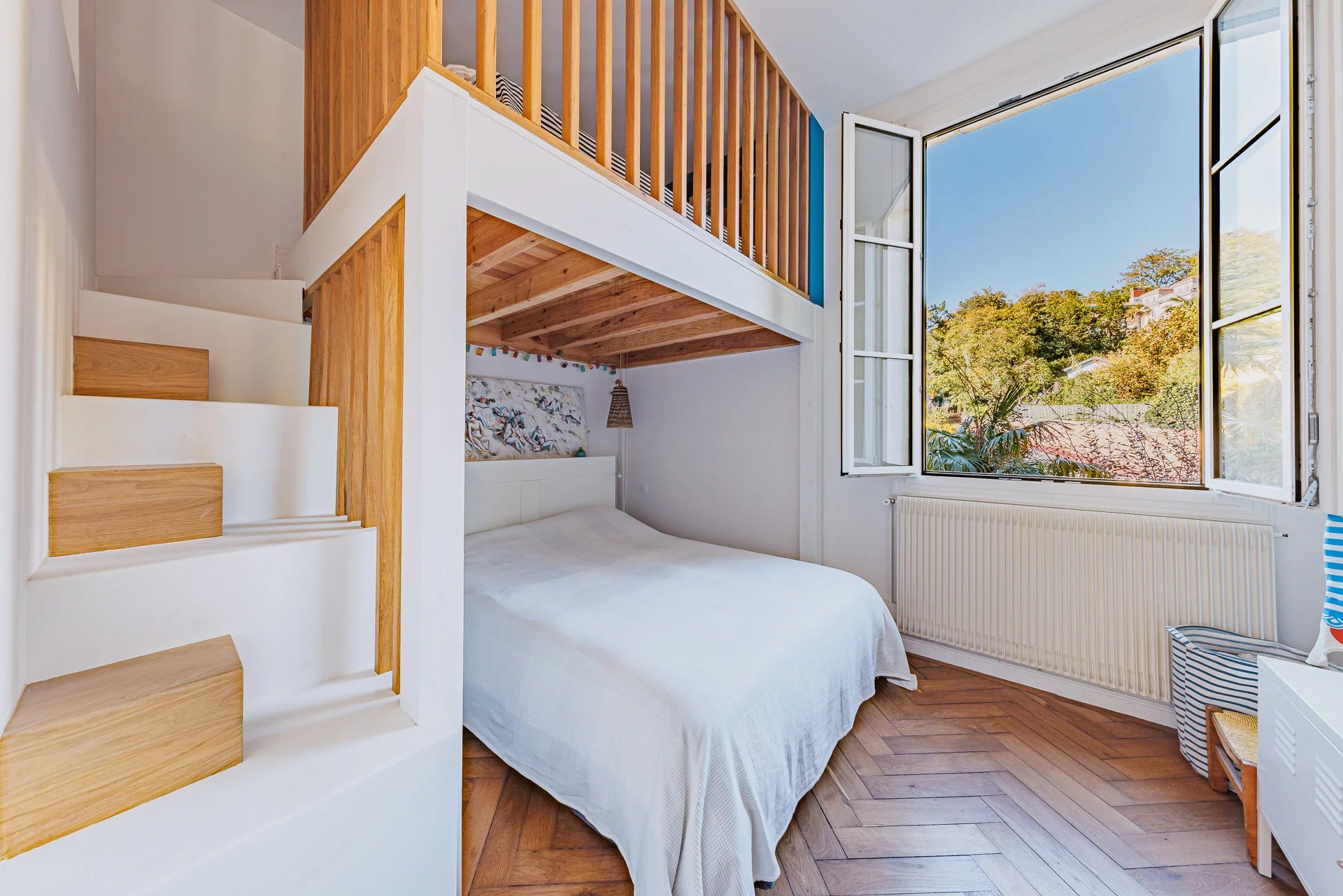 The recent renovation has preserved the architectural character while incorporating modern comfort. The apartment has retained its original solid oak parquet flooring, highlighting the authentic elegance of the house’s former ballroom.