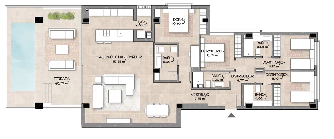 With 4 spacious bedrooms, this apartment offers plenty of space for the whole family or guests. Three of the four bathrooms are en suite, providing privacy and comfort to the residents.