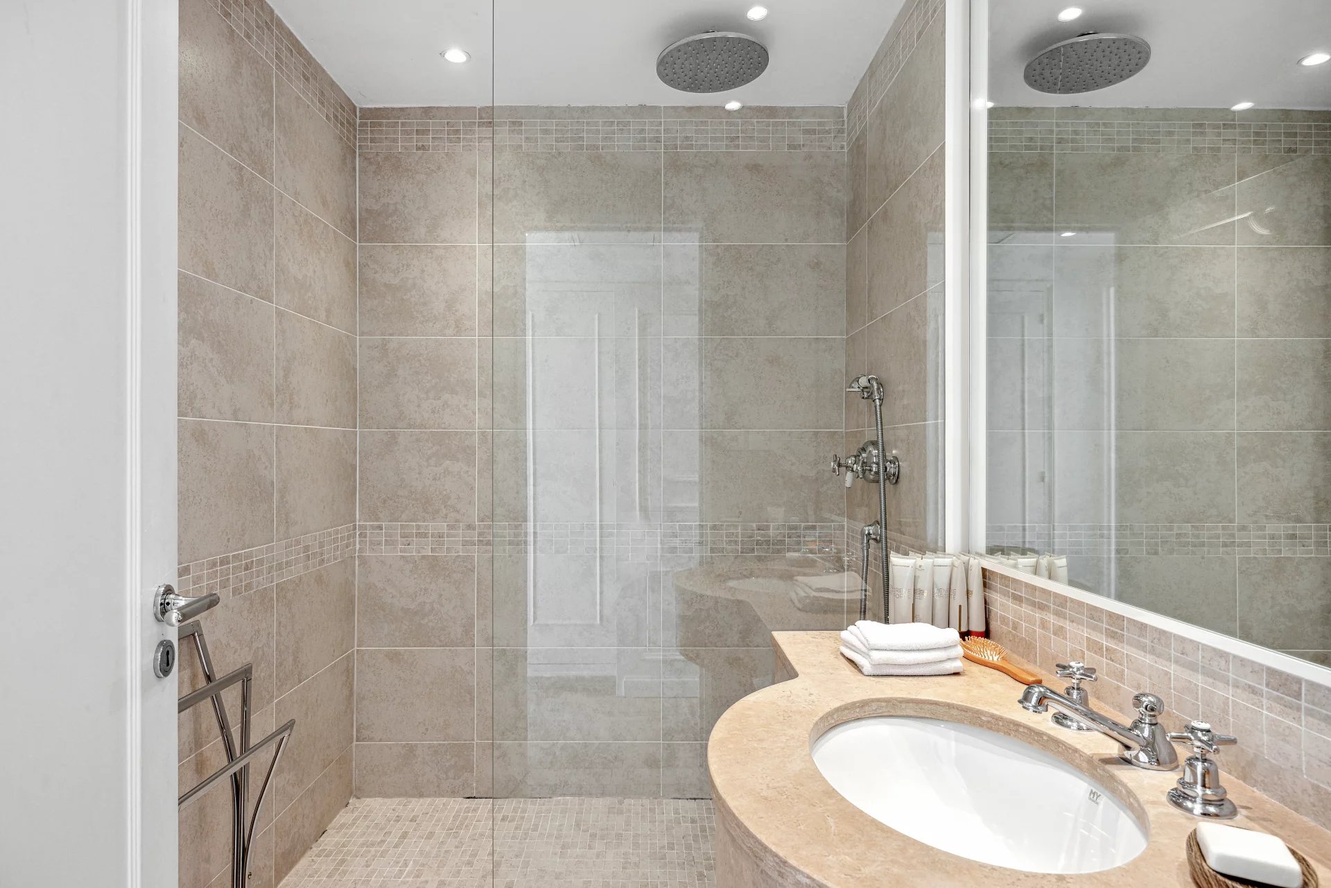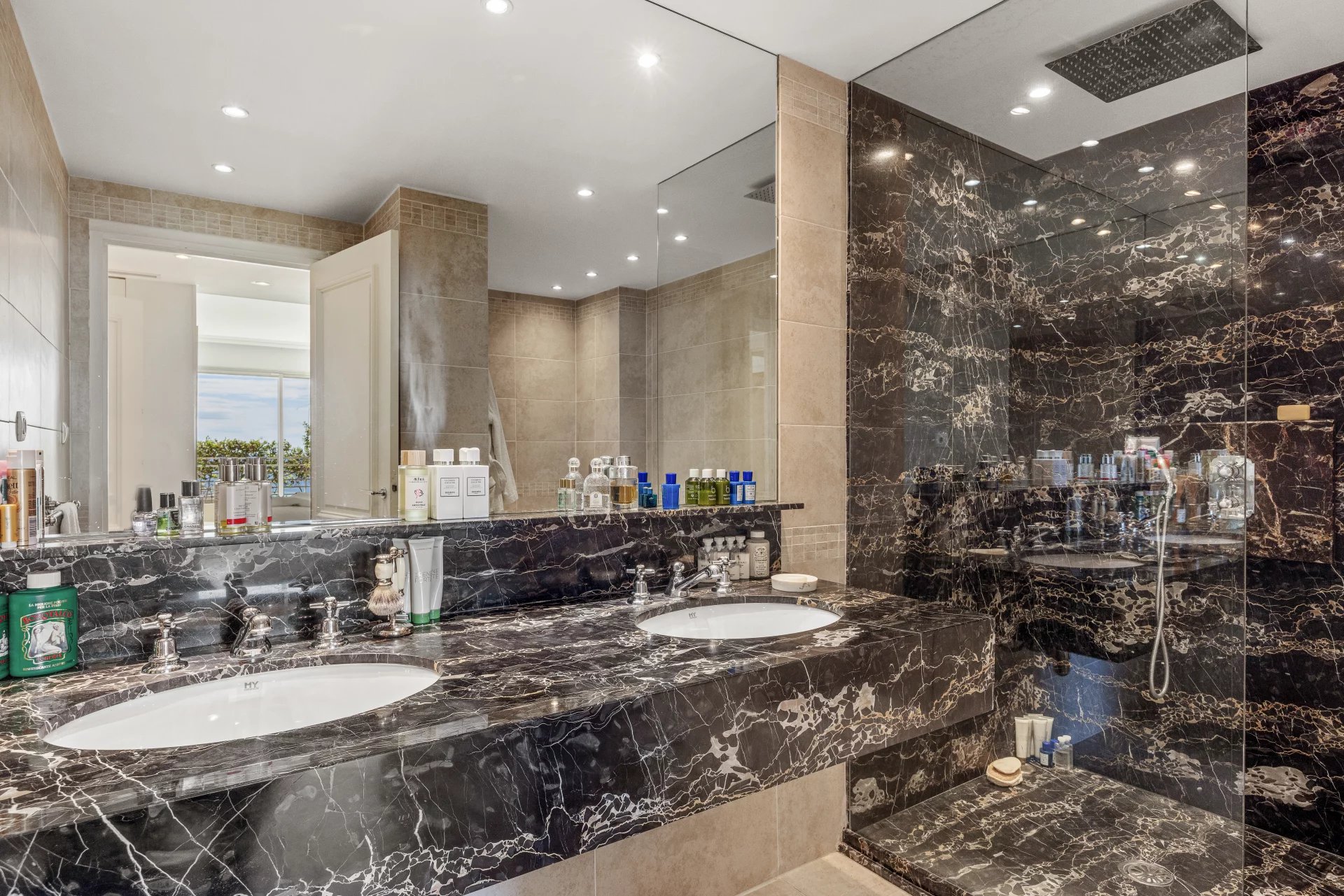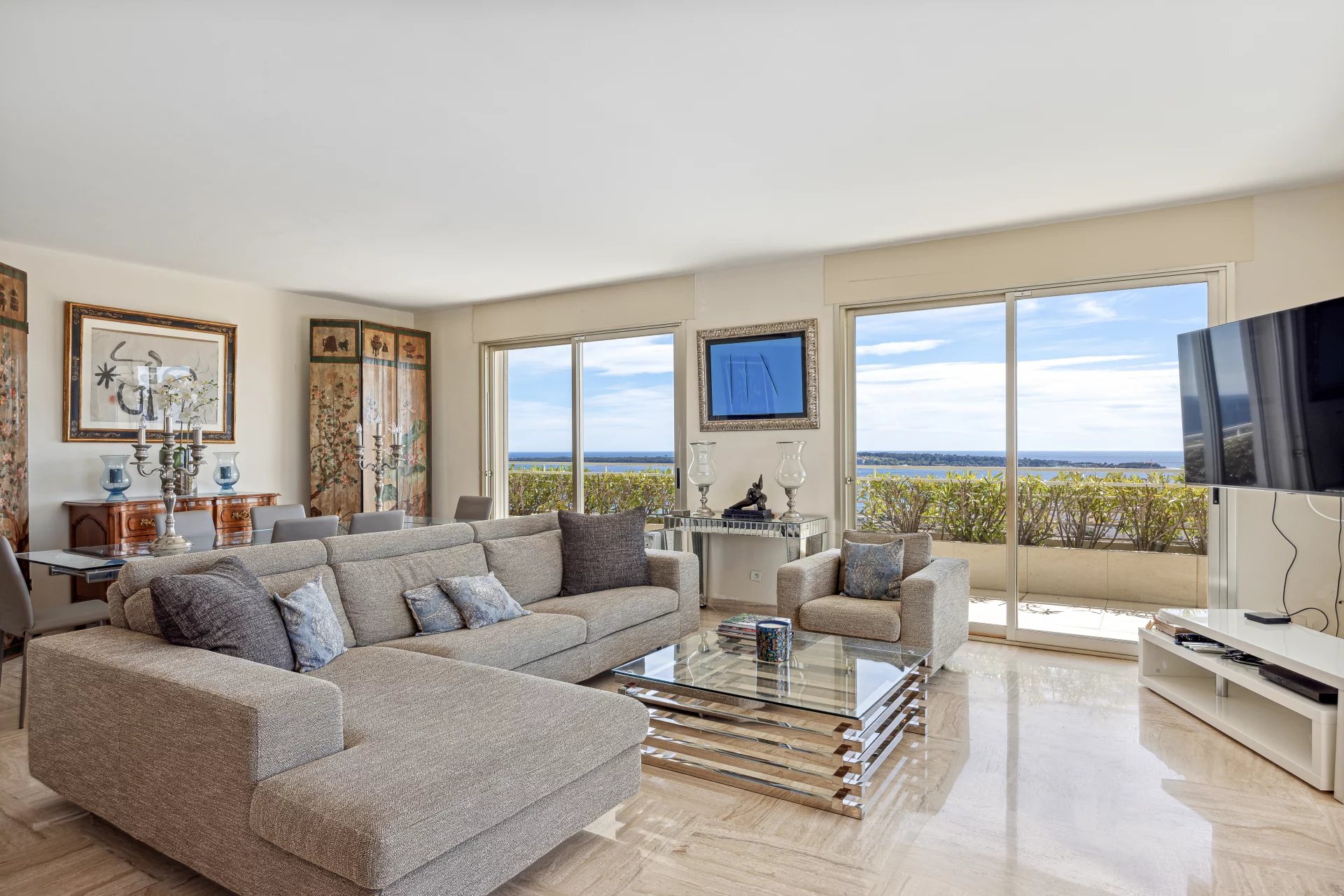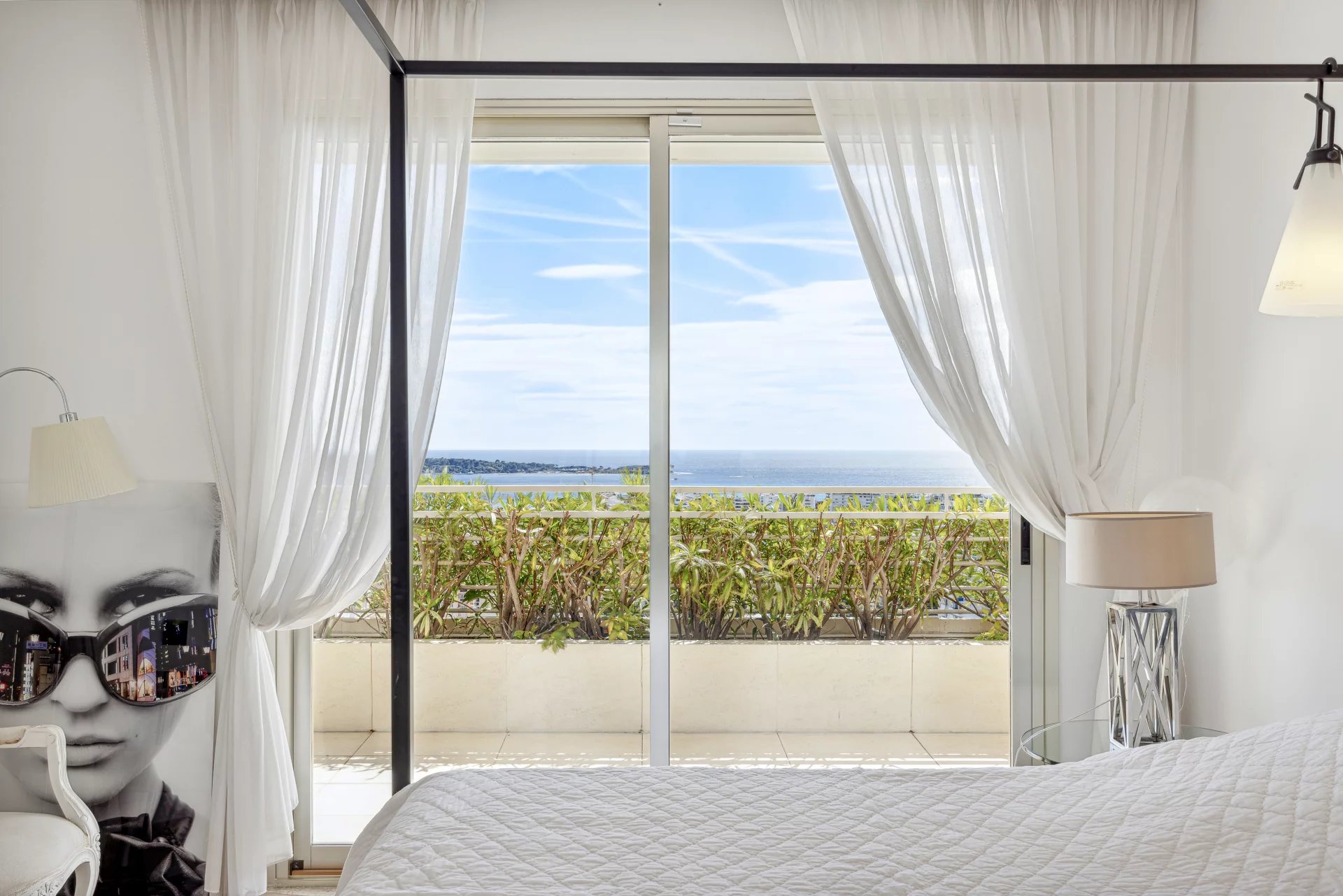 The property has four bedrooms, two of which open onto the terrace, each with its own bathroom, ensuring privacy and comfort. The 125 m² corner terrace, adorned with flowers and protected by a pergola, is a true haven of peace, offering breathtaking views of the sea and the Lérins Islands.