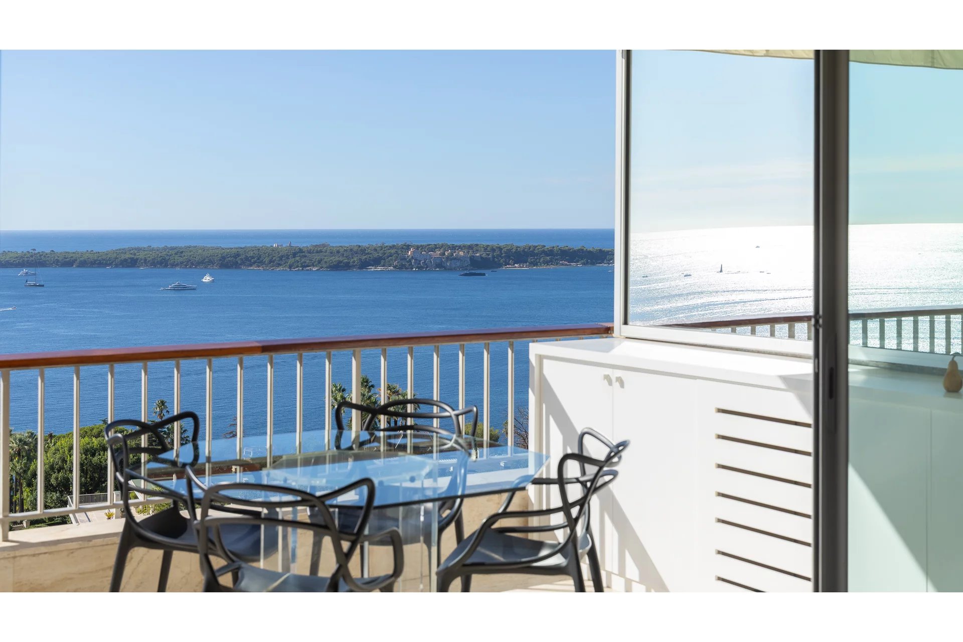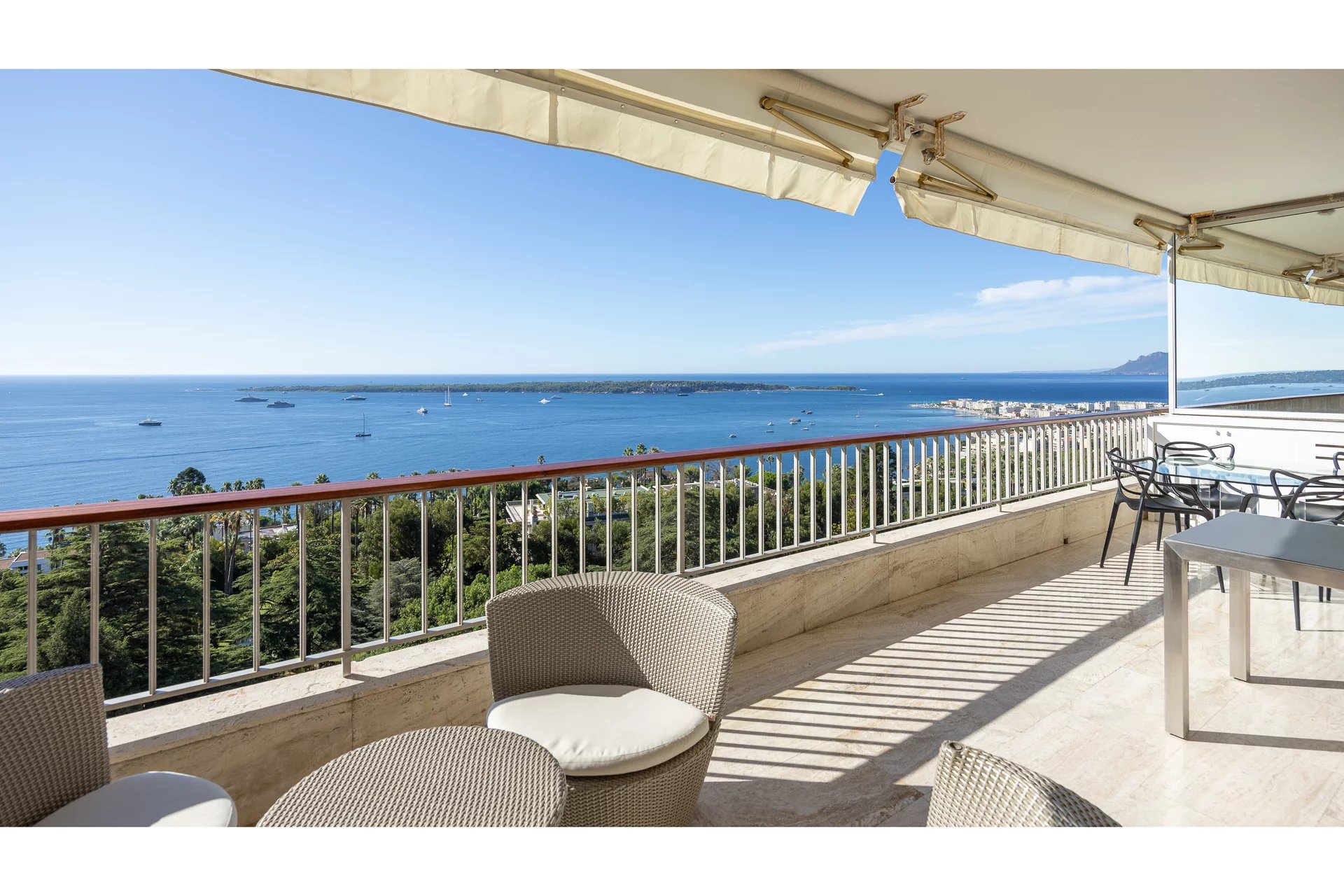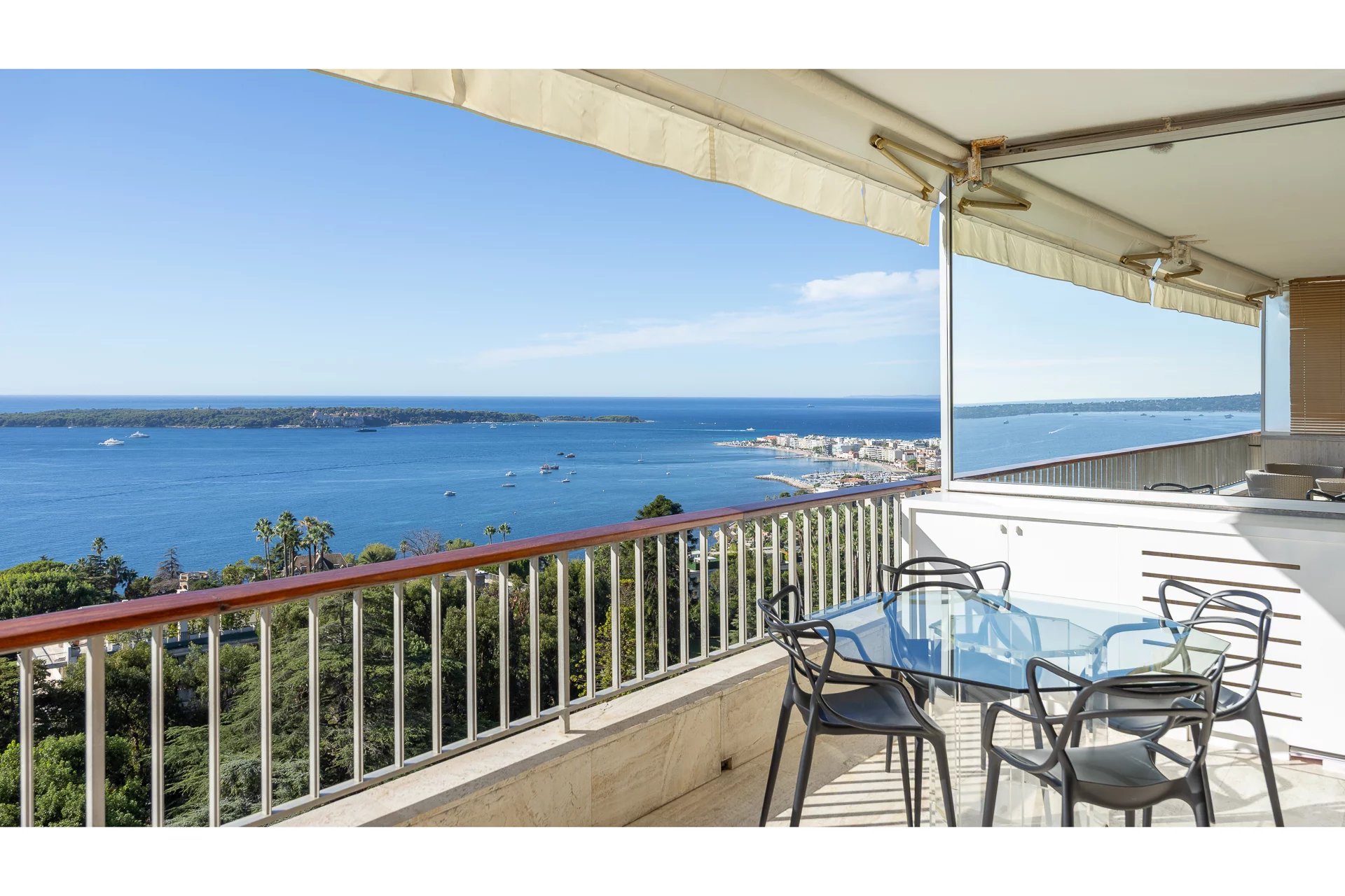 The apartment, perfectly maintained, stands out with its spacious and bright living room with a fully equipped modern open kitchen. The magnificent south-facing terrace boasts breathtaking views of the Mediterranean Sea and the famous Lérins Islands, creating an ideal space for relaxation or entertaining guests.
