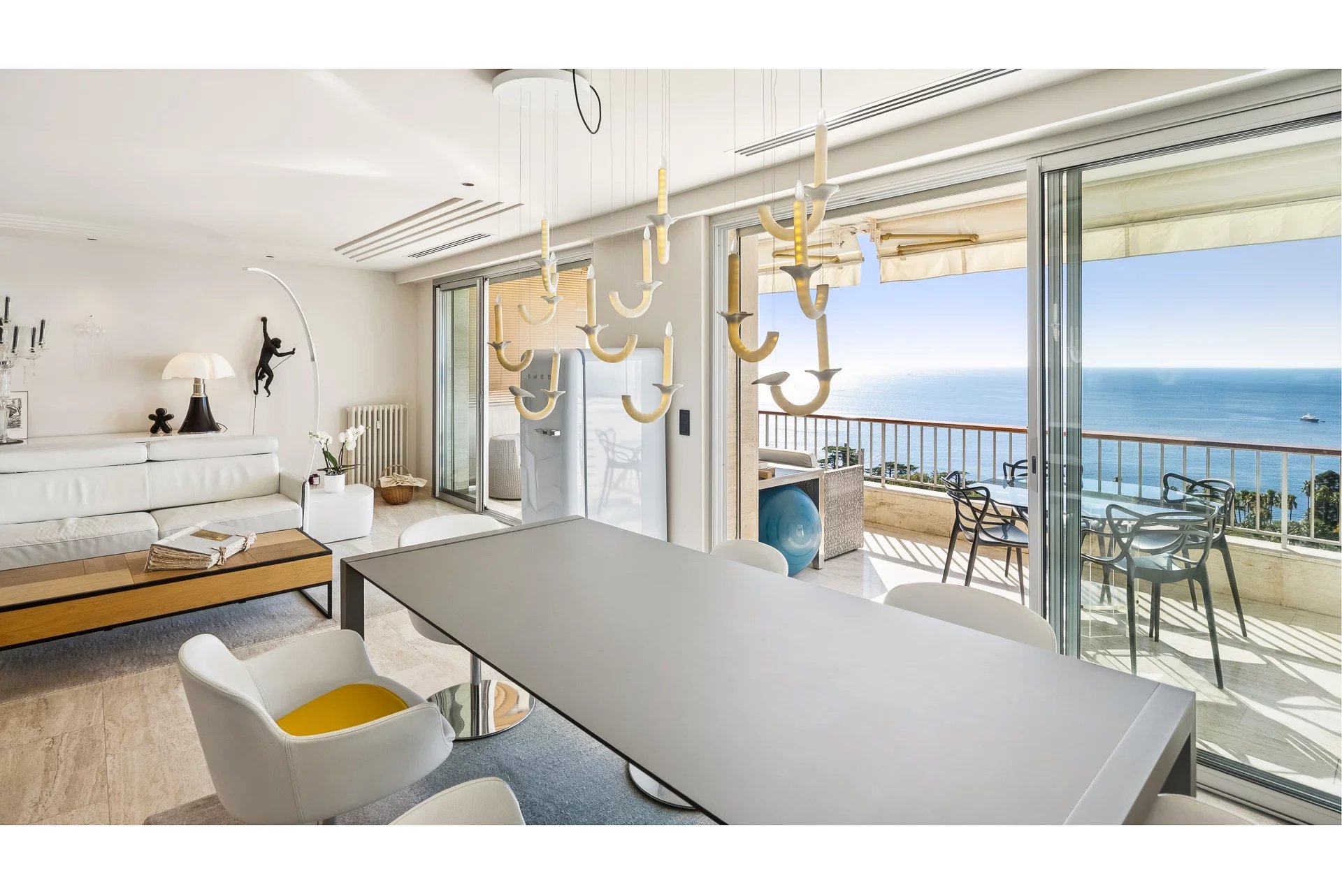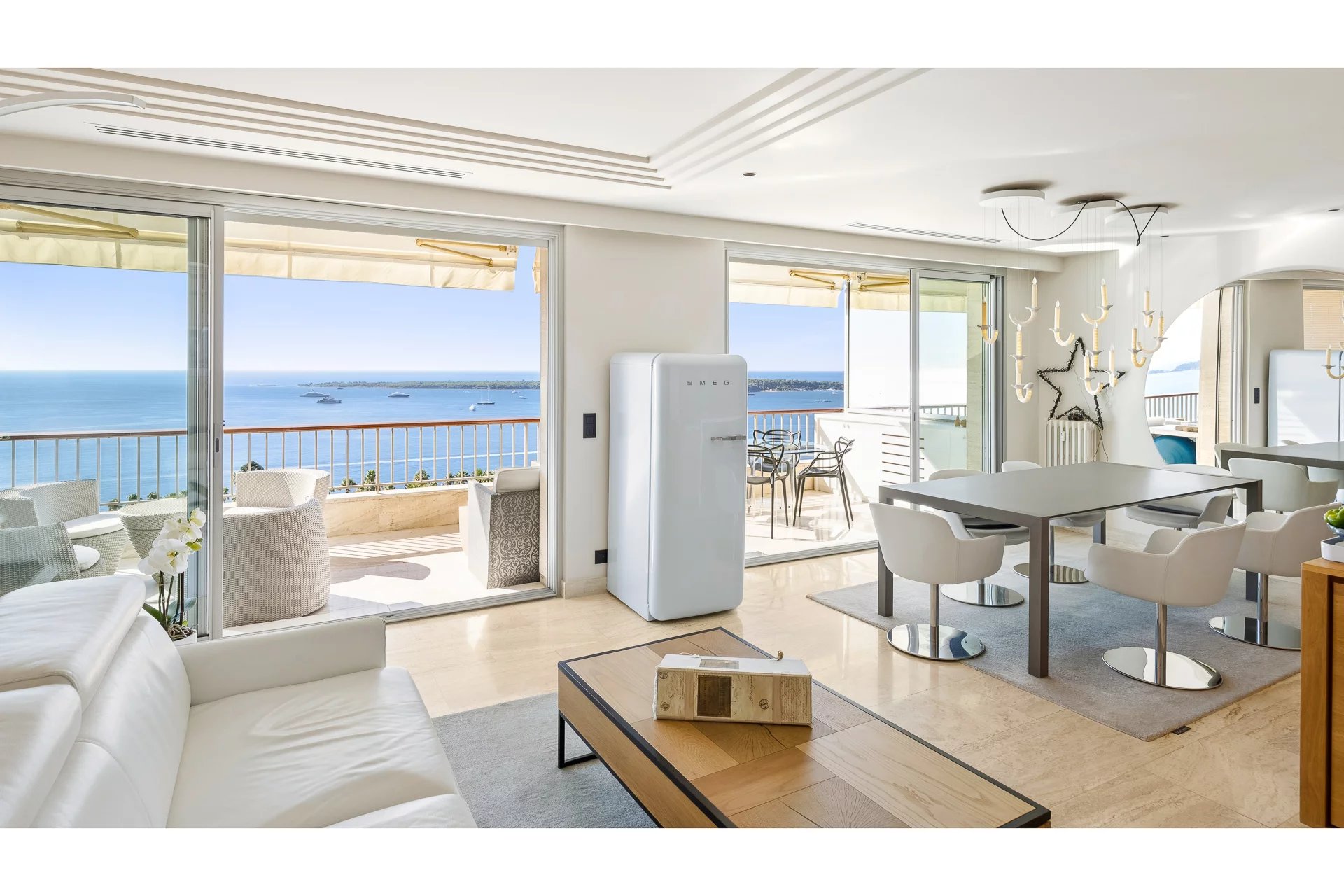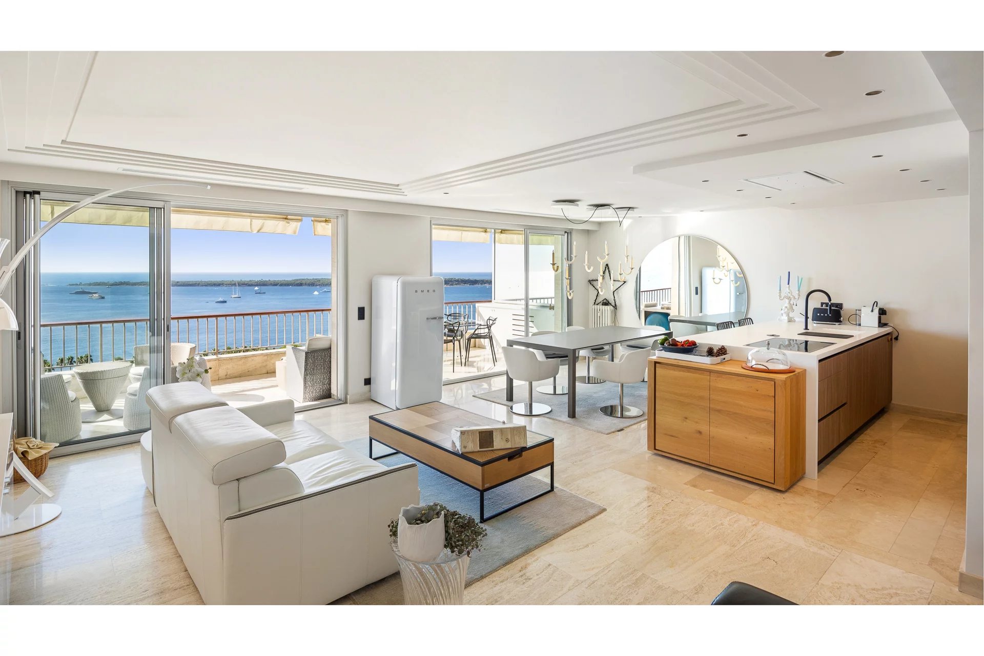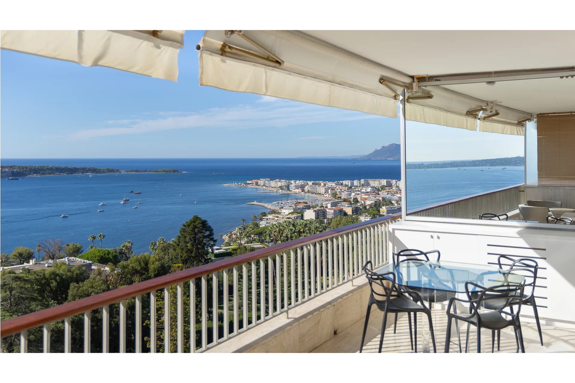 The apartment, perfectly maintained, stands out with its spacious and bright living room with a fully equipped modern open kitchen. The magnificent south-facing terrace boasts breathtaking views of the Mediterranean Sea and the famous Lérins Islands, creating an ideal space for relaxation or entertaining guests.