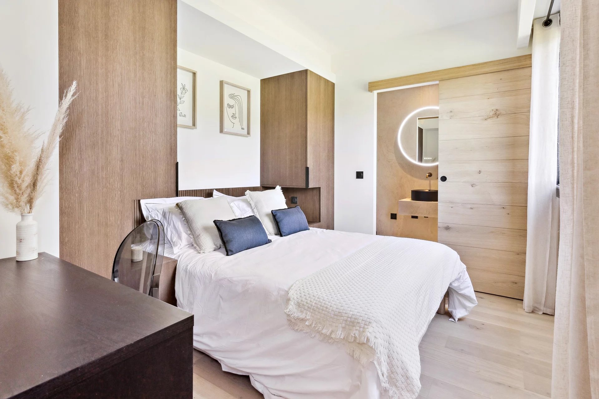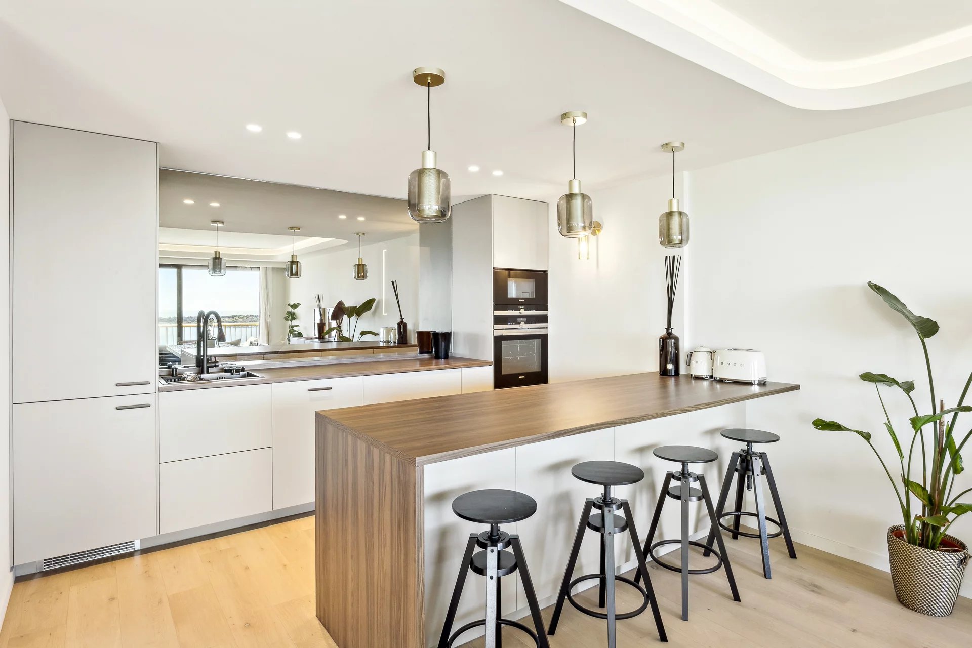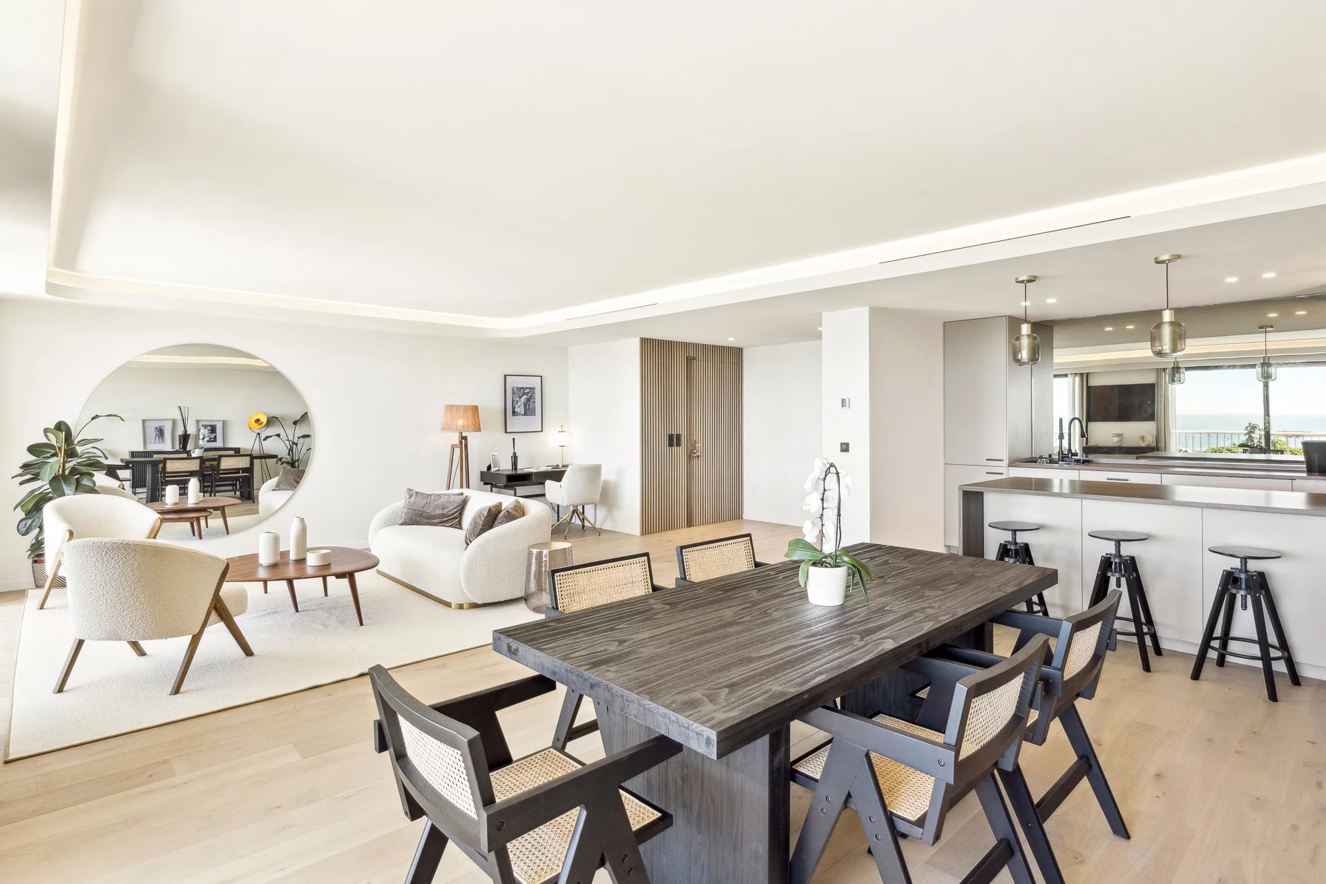 With a surface area of 114 sqm, this apartment in excellent condition stands out for its brightness and optimized layout. The spacious living room, bathed in light thanks to its double French doors, opens onto a 20 sqm terrace ideal for enjoying the mild Mediterranean climate. The open-plan kitchen, fully equipped, integrates harmoniously into this living space.