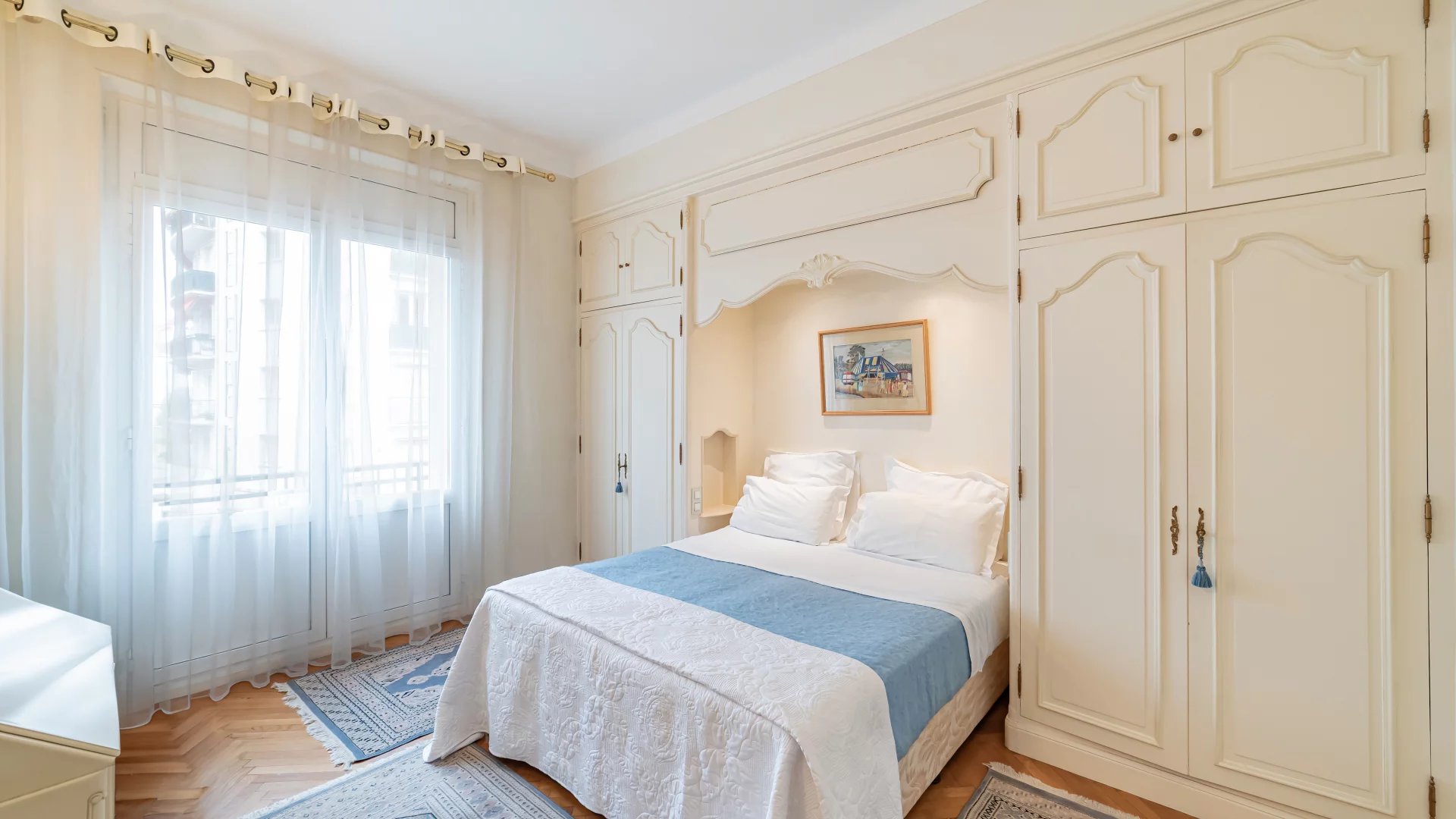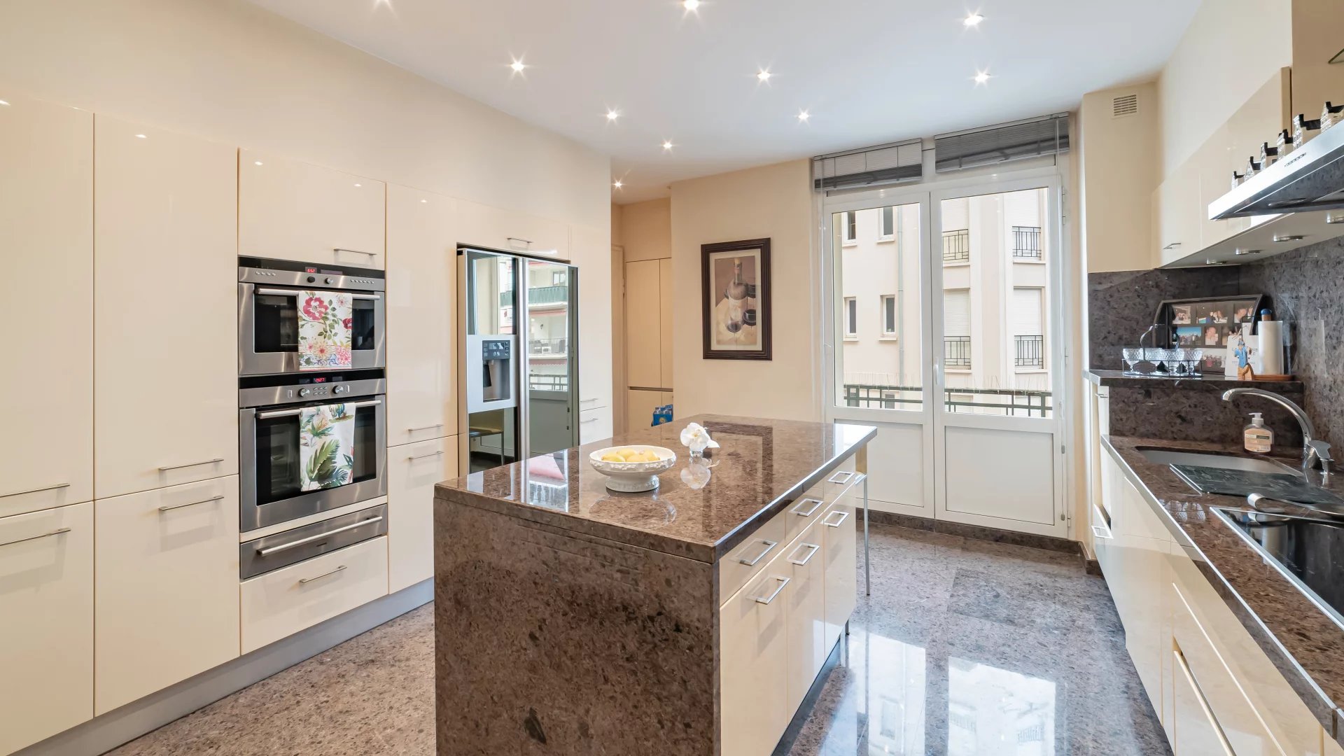 It comprises an entrance hall, a vast hall with dressing room leading to a luminous, south-facing double living room with large bay windows. The kitchen, in brown granite and fully equipped with top-of-the-range appliances, is complemented by a functional laundry area.