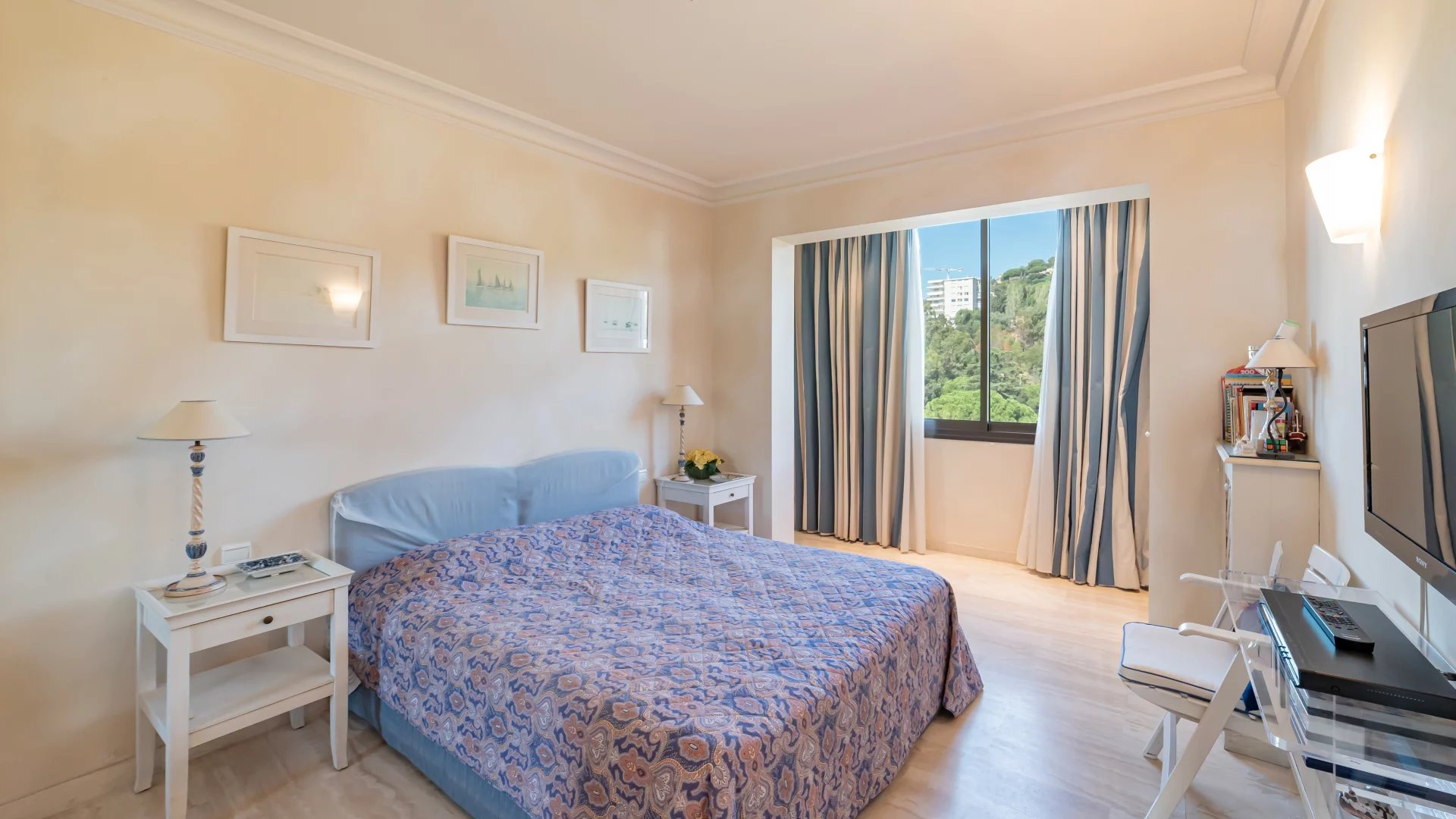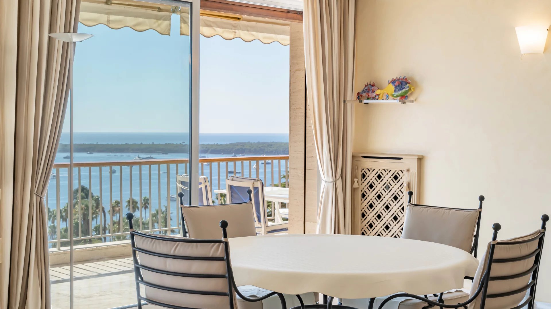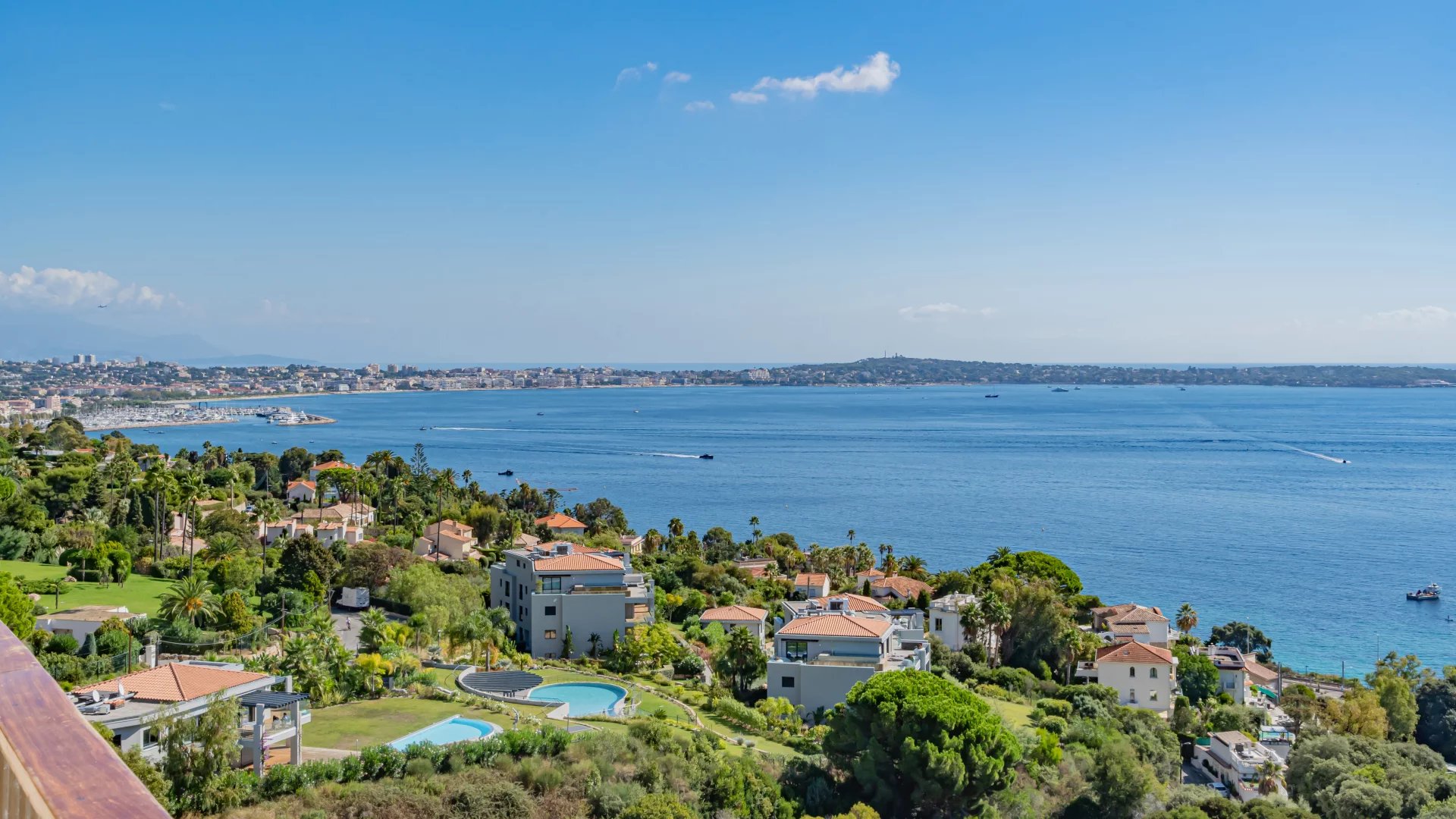 In a luxury residence with 24/7 security, set in a 12-hectare park with swimming pool, tennis court, fitness, golf practice range and shuttle service, this beautiful apartment on a high floor offers exceptional panoramic views of Cap d'Antibes, the Lérins islands and the sea.
