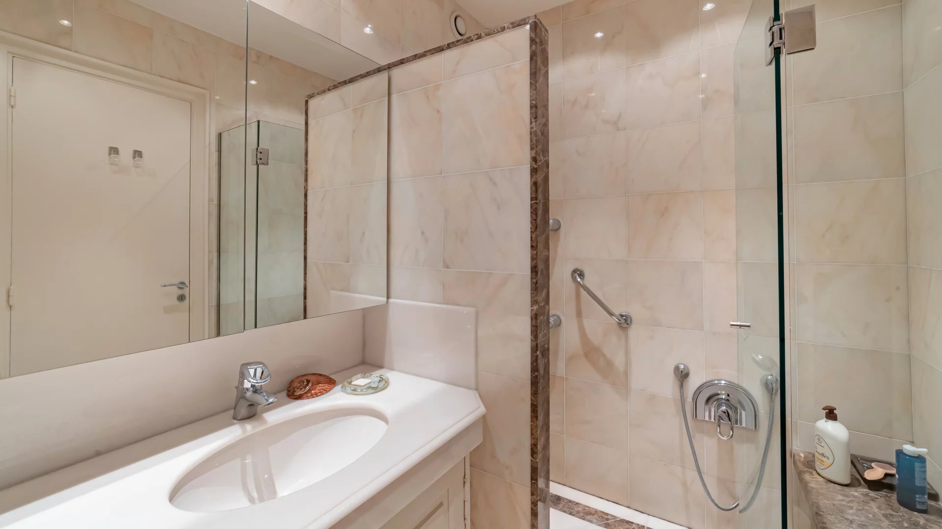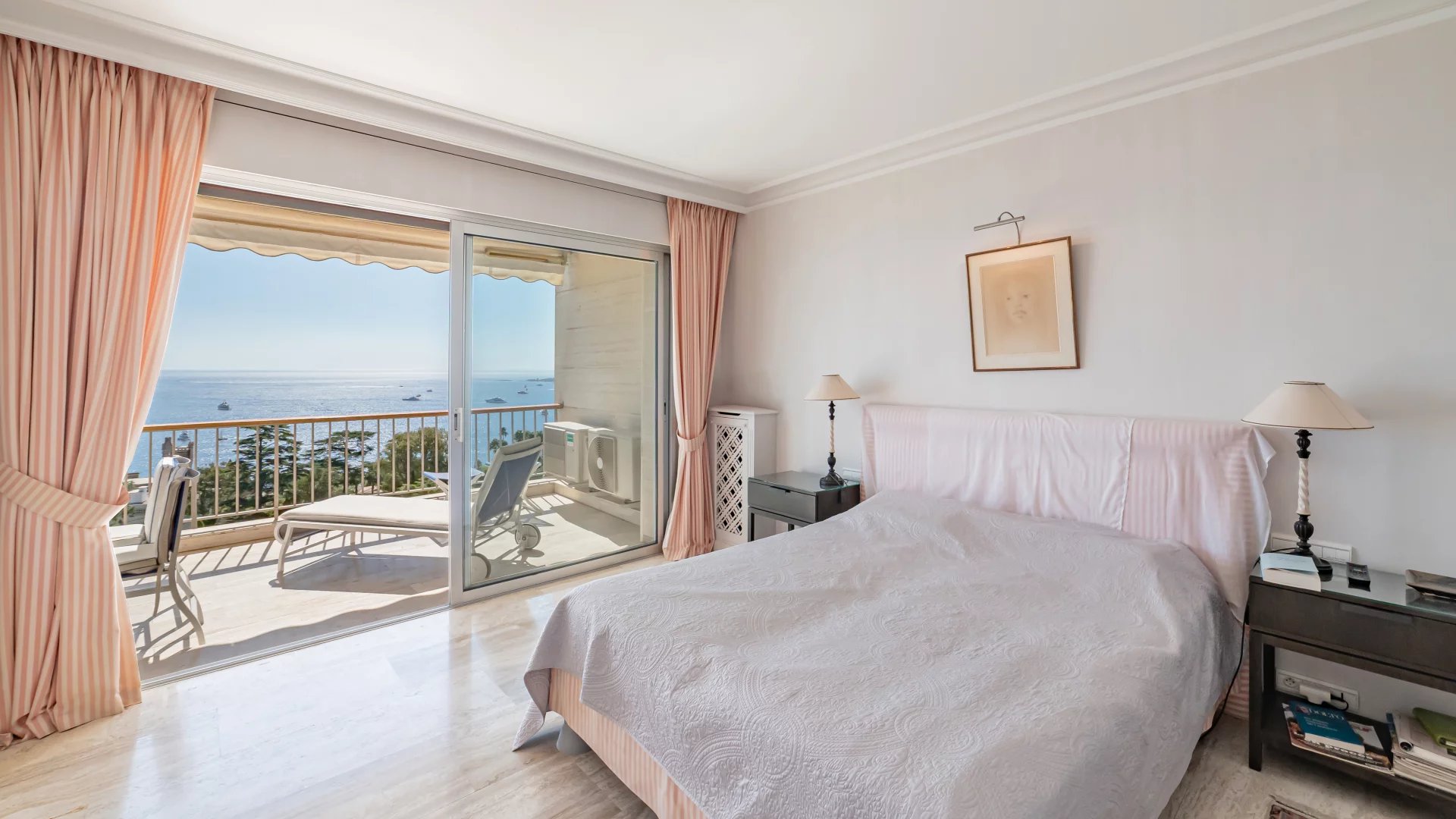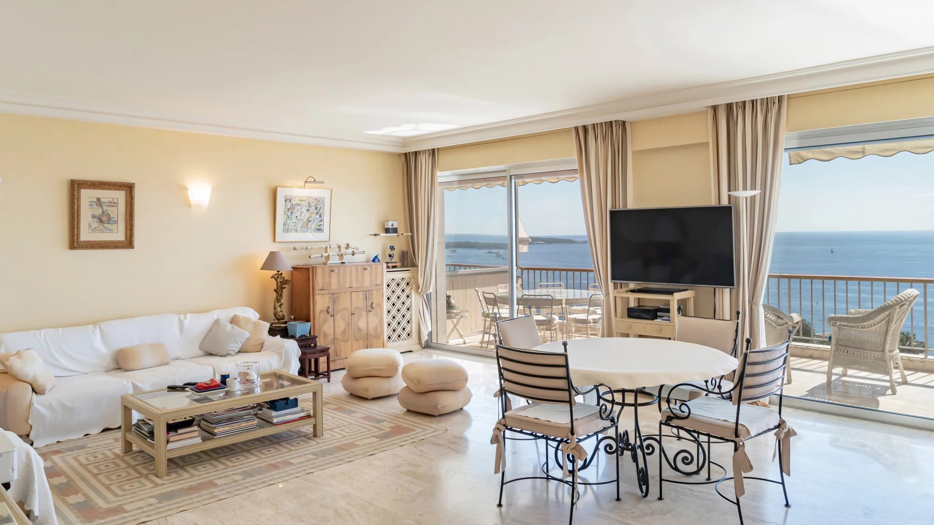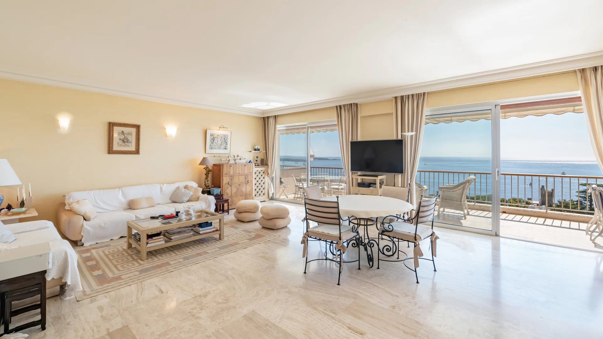 In a luxury residence with 24/7 security, set in a 12-hectare park with swimming pool, tennis court, fitness, golf practice range and shuttle service, this beautiful apartment on a high floor offers exceptional panoramic views of Cap d'Antibes, the Lérins islands and the sea.