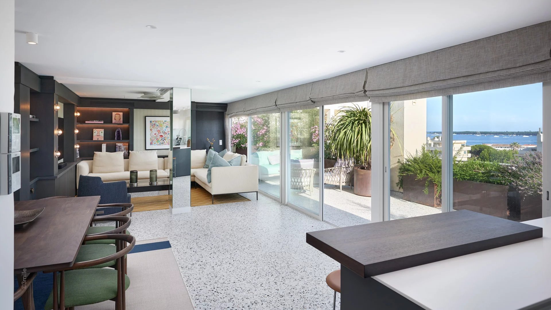 Close to the Croisette and in a quiet area, rare and magnificent duplex penthouse with a beautiful sea view, with a surface area of 150 sqm according to the Carrez law plus 63 sqm of terraces, it has been entirely renovated with high quality fittings.