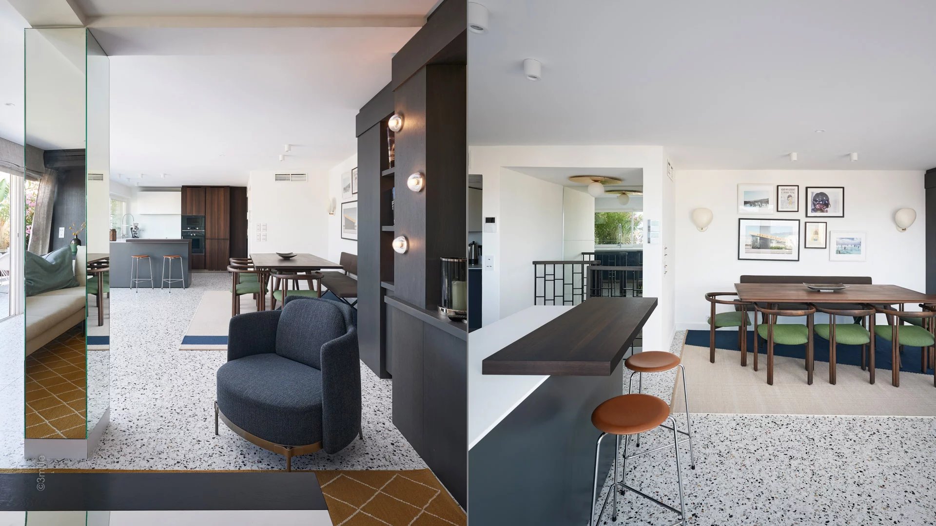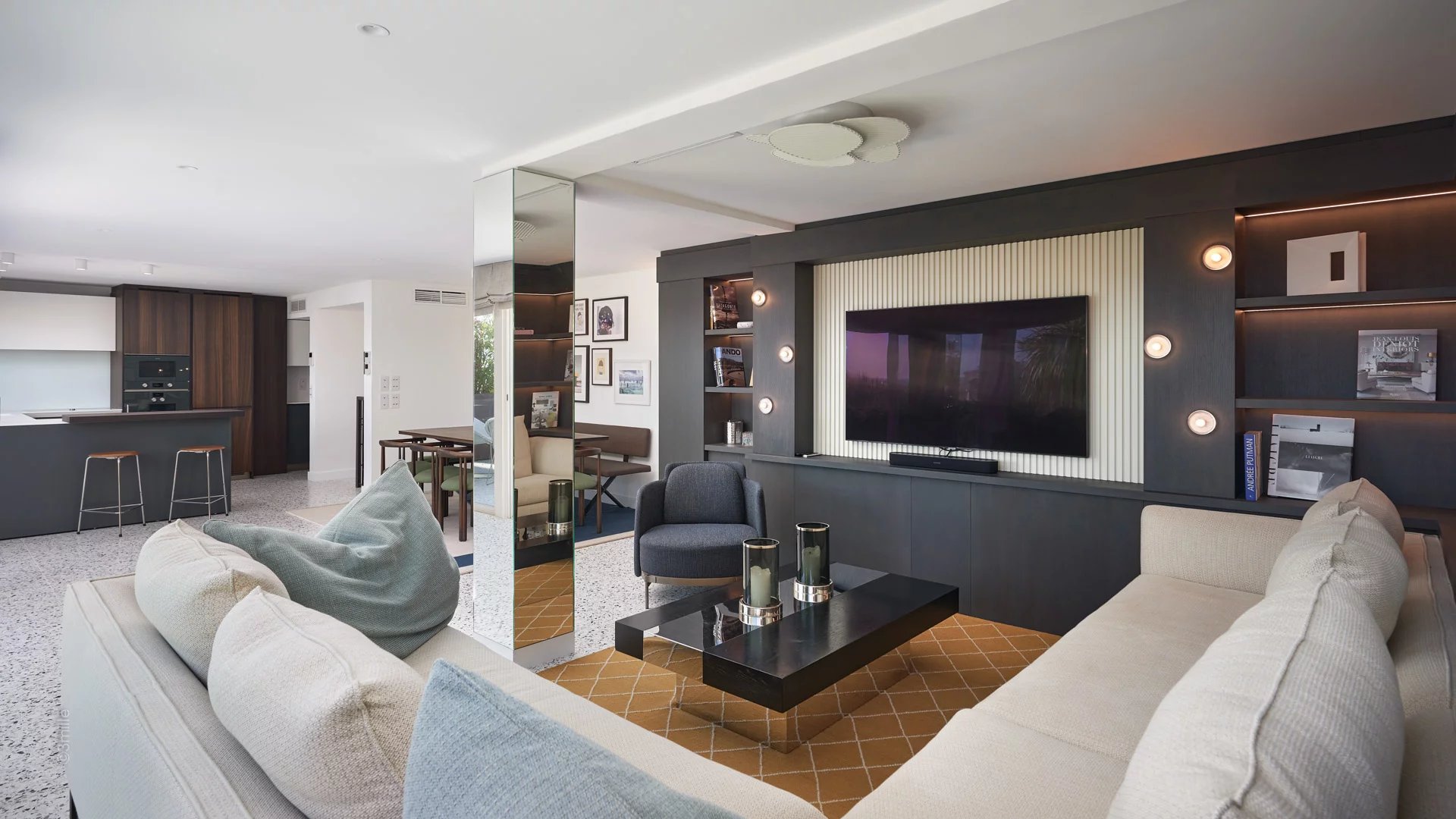 living room with open plan kitchen and large 45 m² terrace on the upper floor.