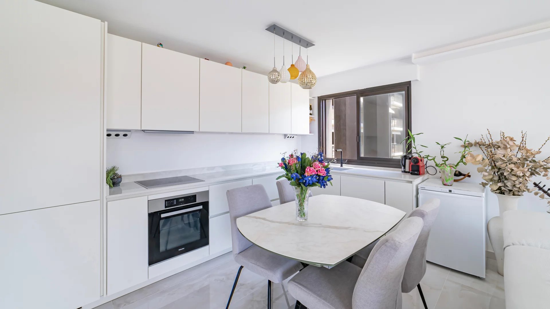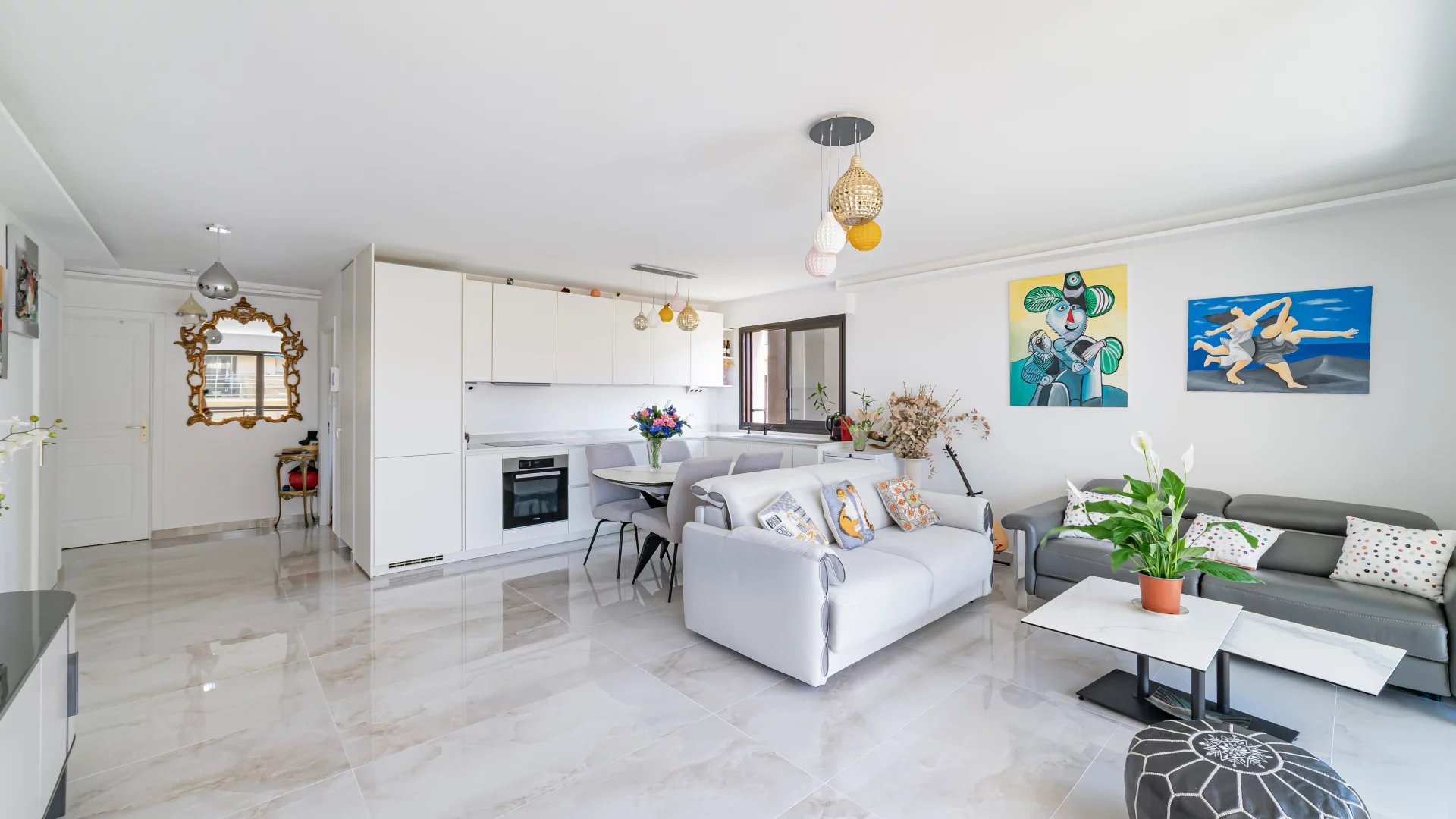 It comprises an entrance hall, a living room with a fully equipped open-plan kitchen opening onto the terrace, a spacious bedroom with two large dressing rooms and a shower room with toilet.