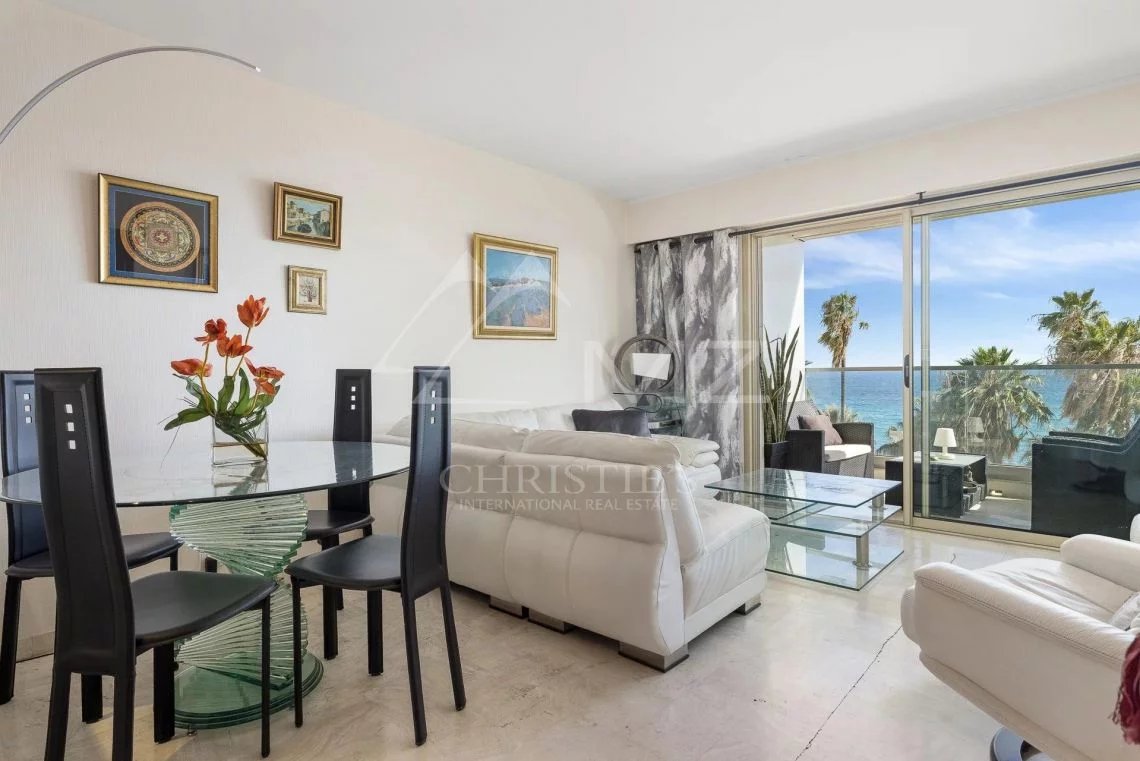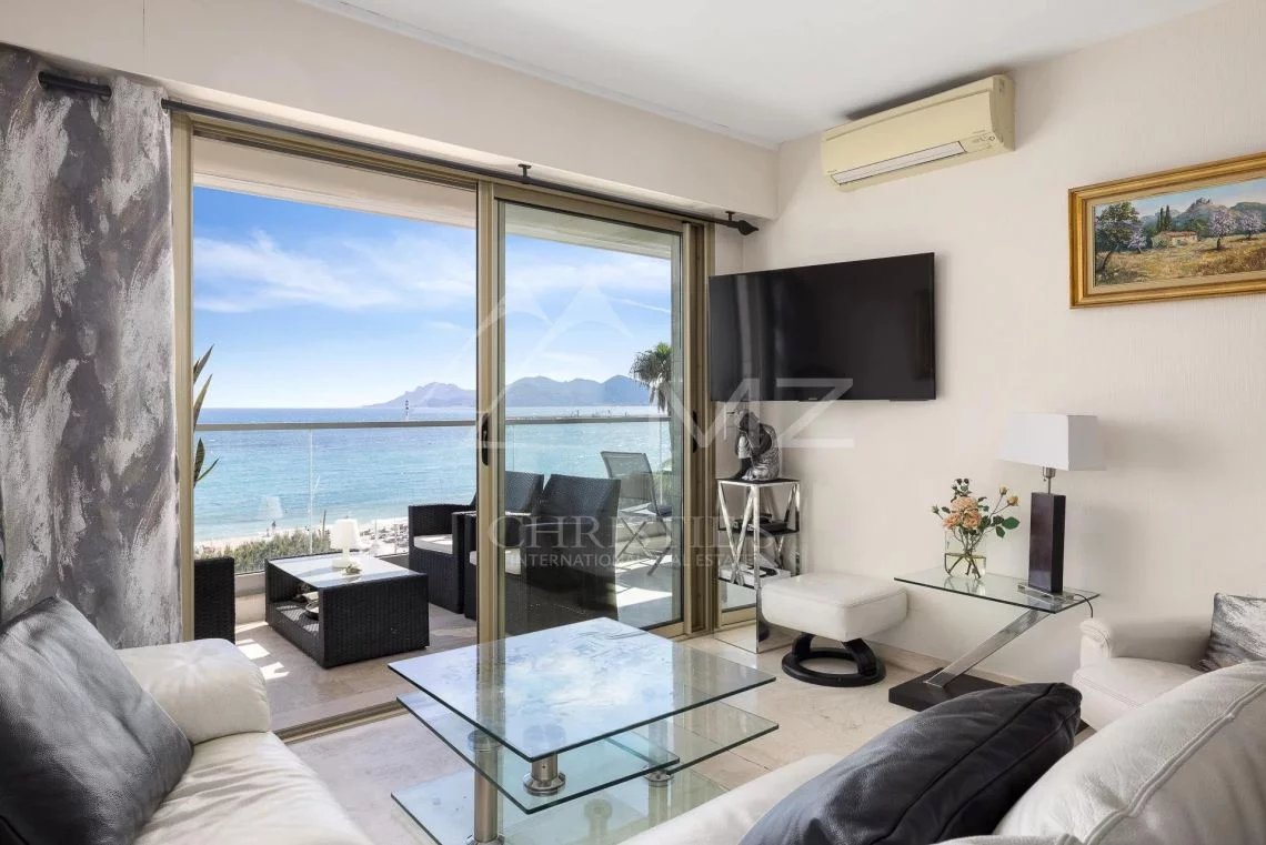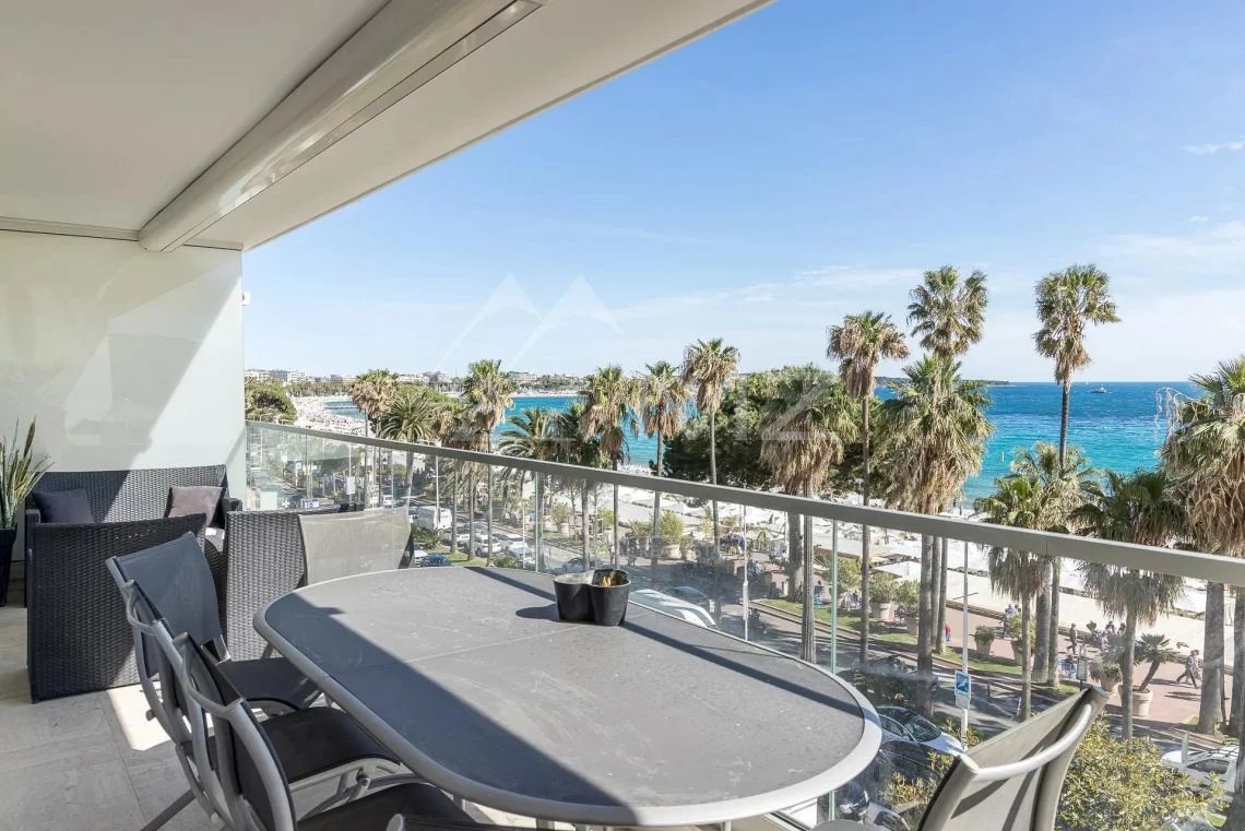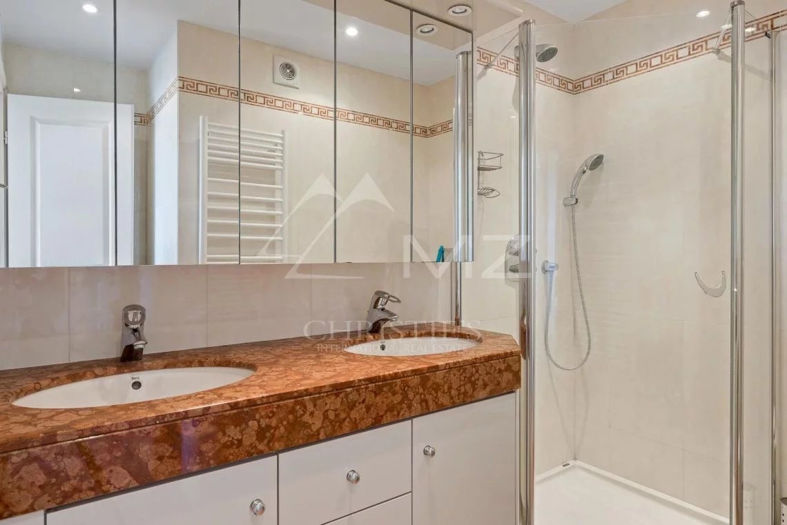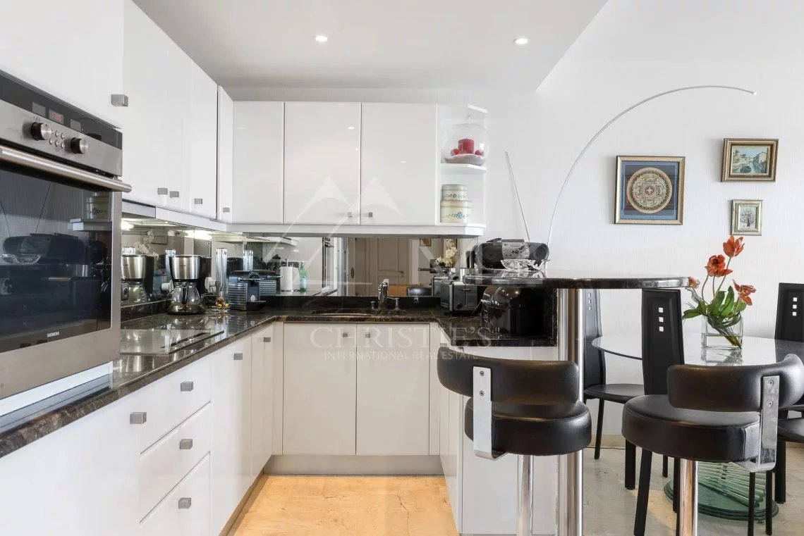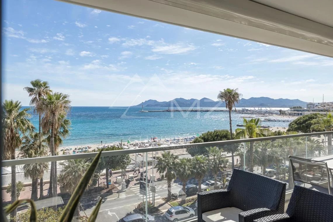 In a luxury residence in the very heart of the Croisette, beautiful 3-room apartment on a higher floor. The apartment consists of a bright living room with open kitchen, a master bedroom with its shower room and toilet, a second bedroom and a shower room with toilet, all opening onto a beautiful terrace offering a panoramic view over the bay of Cannes, the Lerins Islands and L'Esterel.